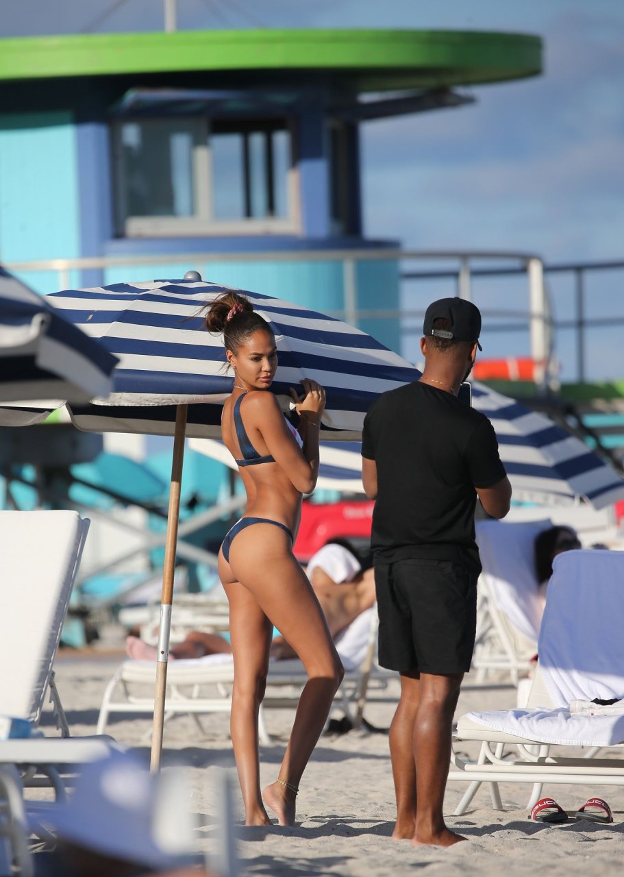 La modella Joan Smalls coinvolge il suo fidanzato Bernard Smith come fotografo mentre posa seducente in bikini sulla spiaggia di Miami.