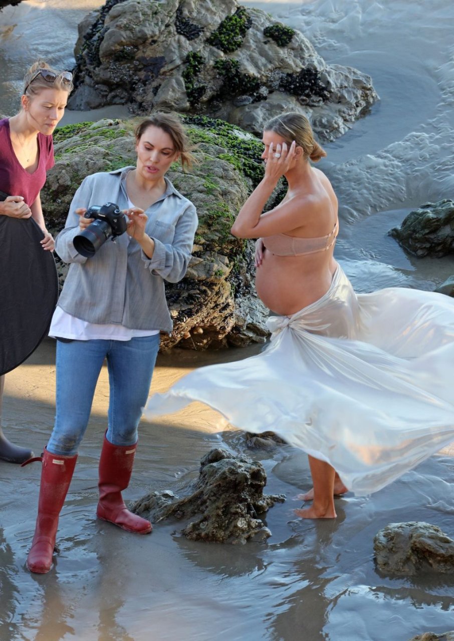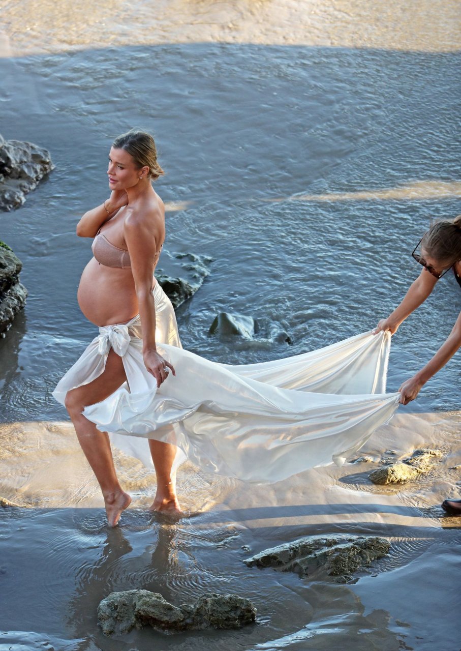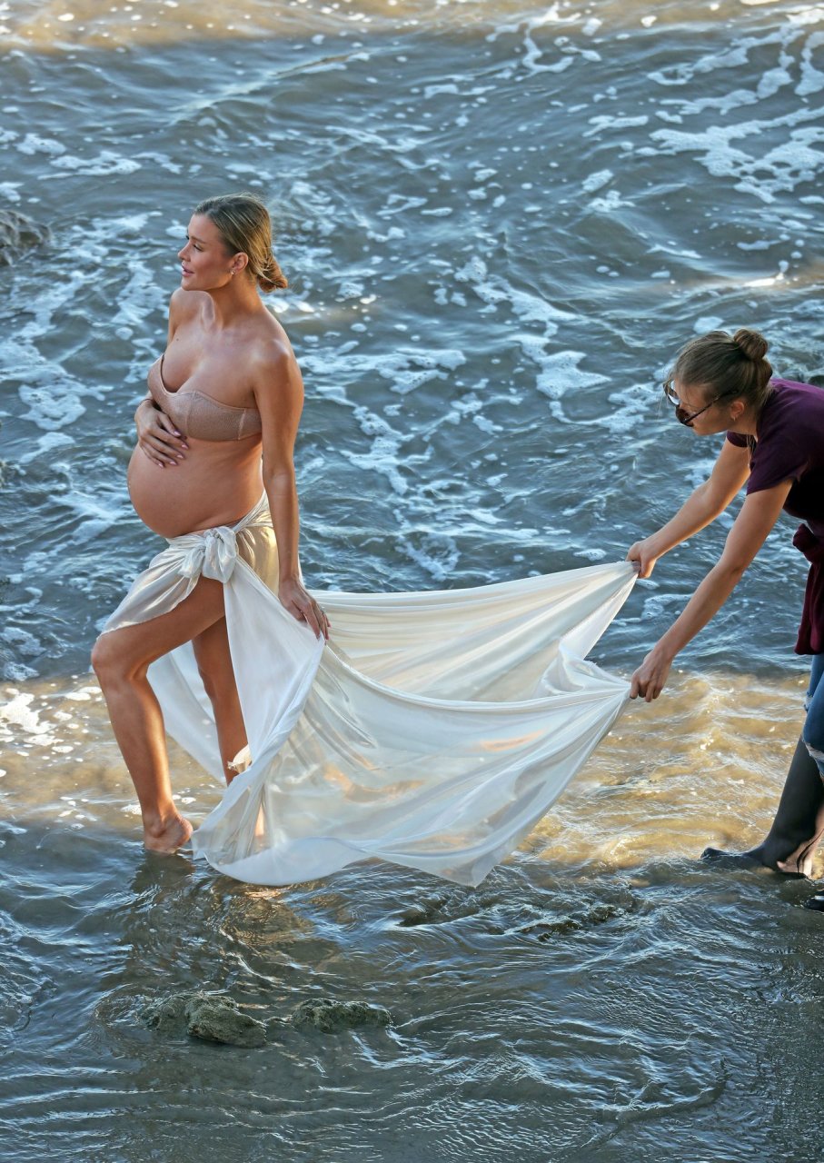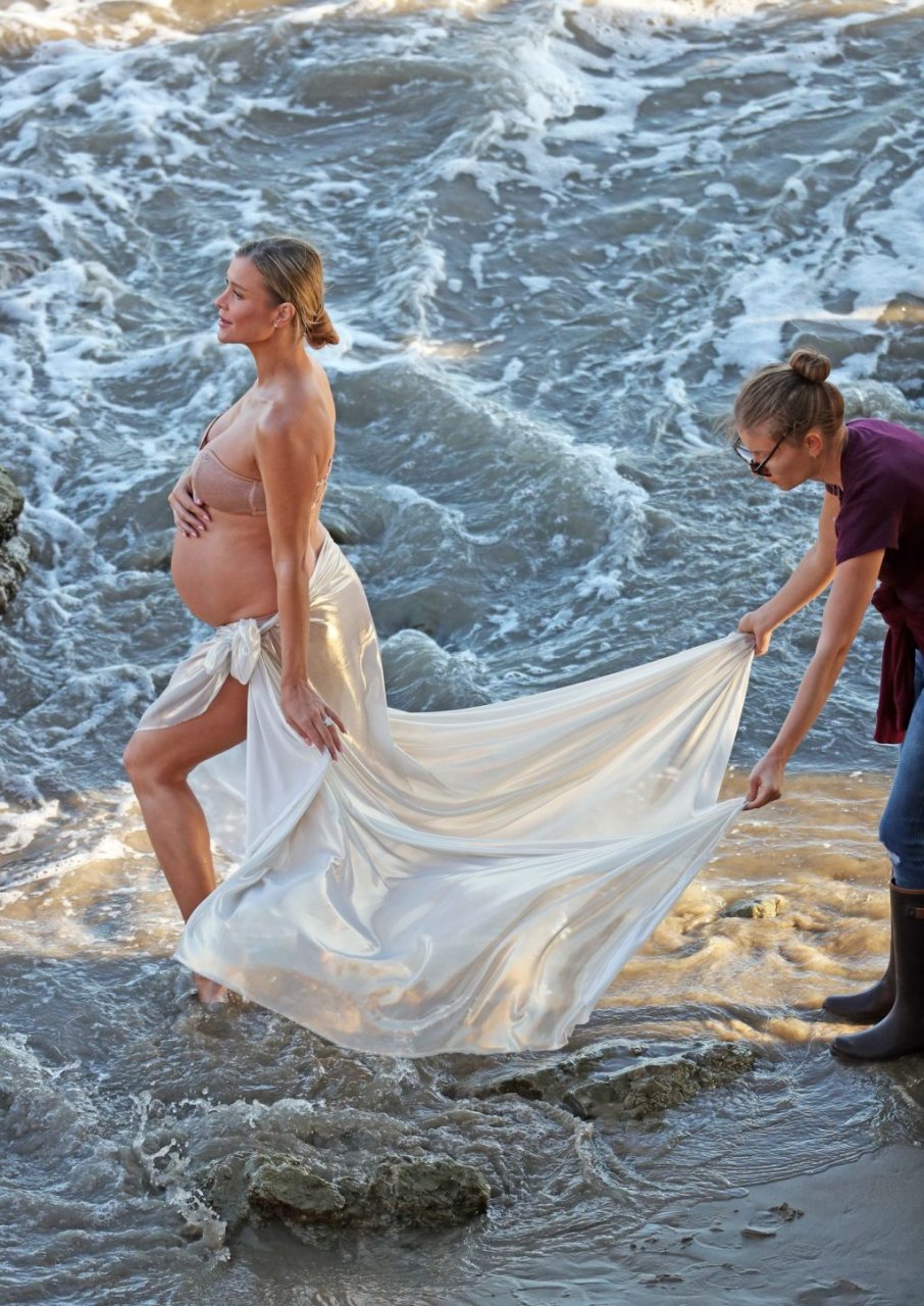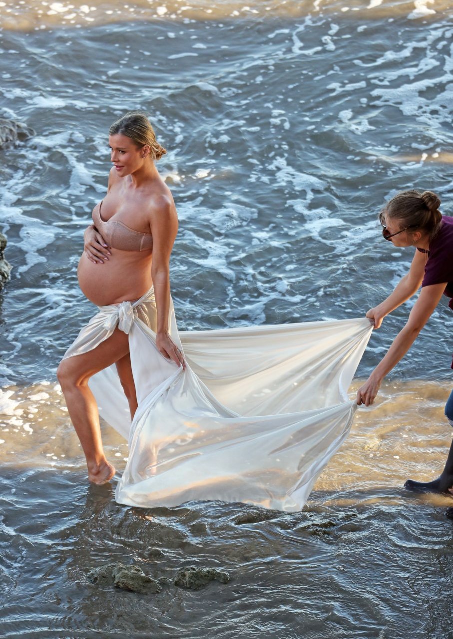 La presentatrice televisiva di origine polacca, che aspetta il suo primo figlio, una femmina, con il nuovo marito Doug Nunes, ha posato in un bikini senza spalline color champagne scintillante e un coprispalle di seta per lo scatto iconico a Malibu.
