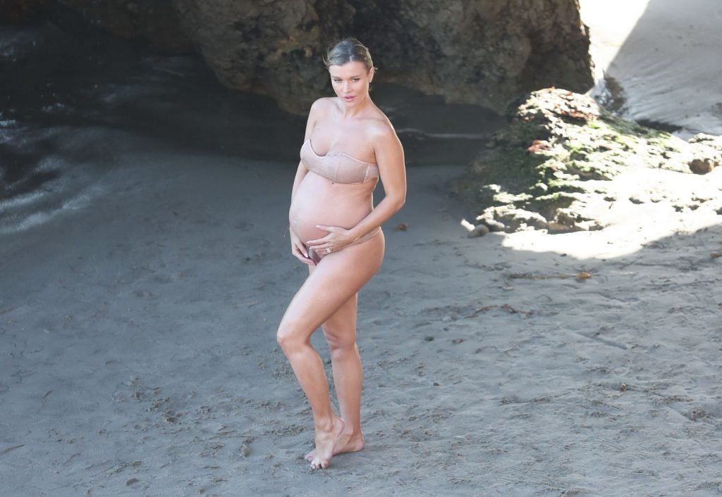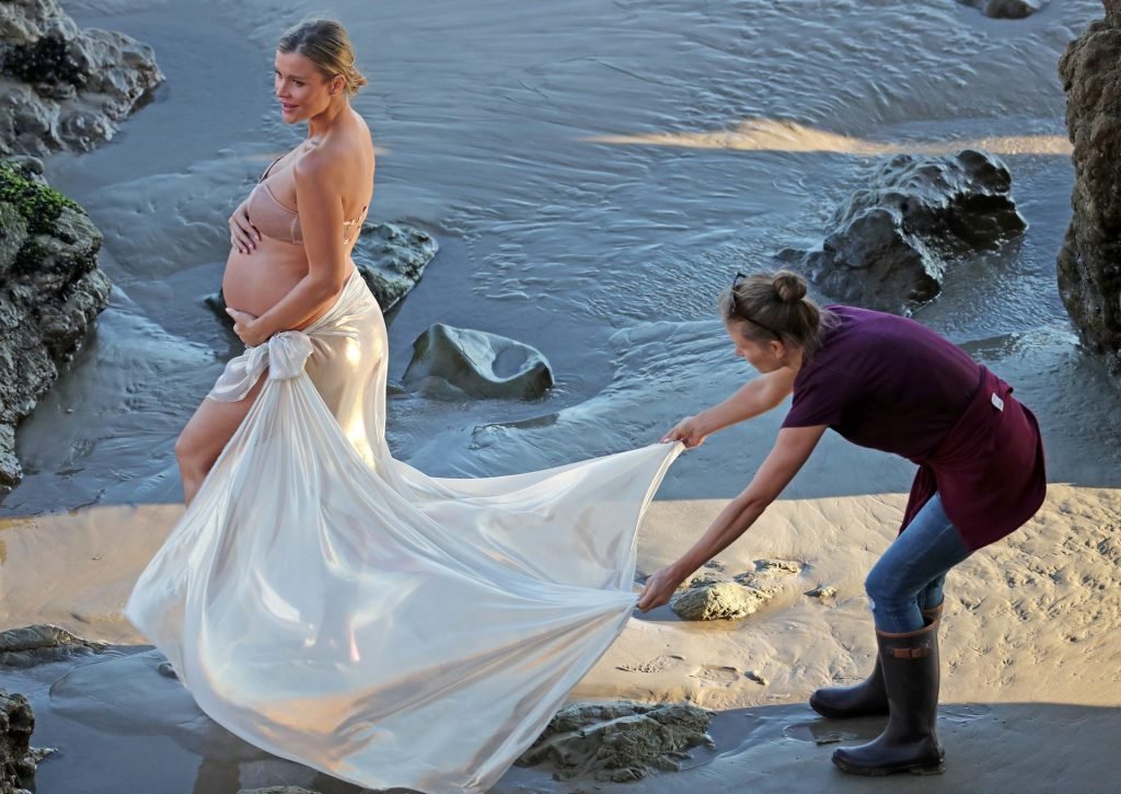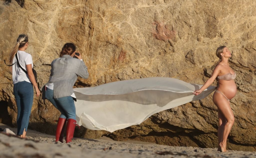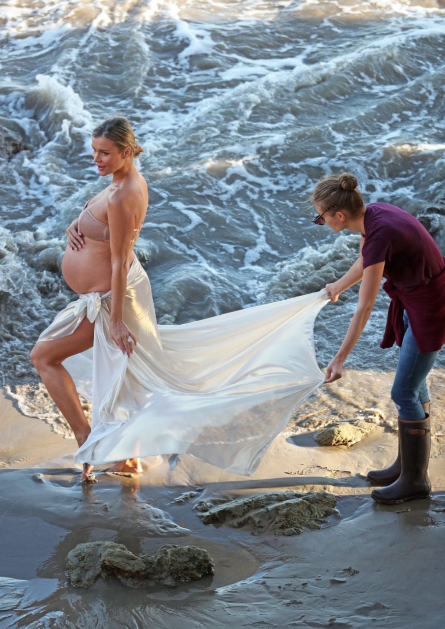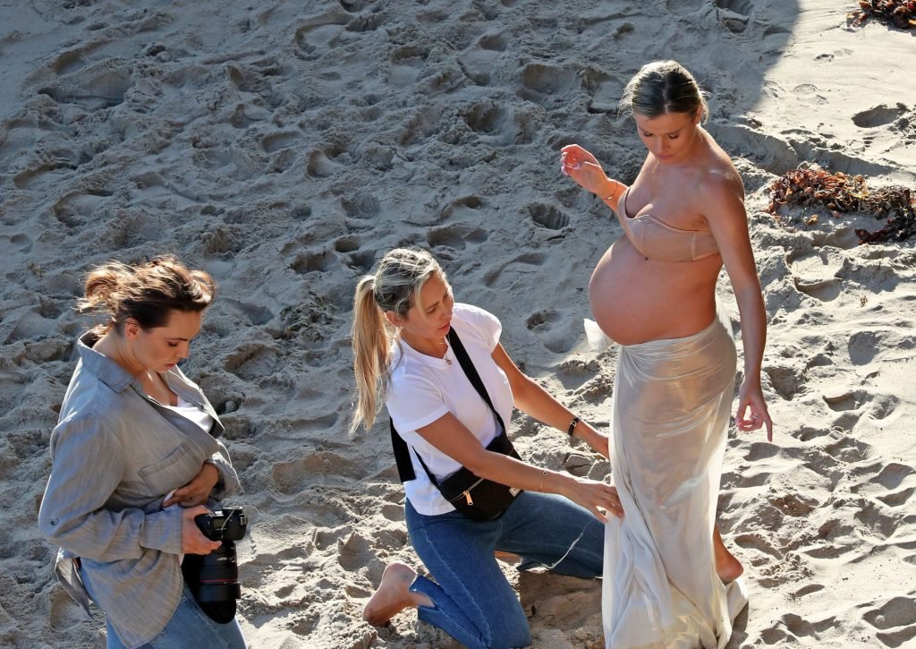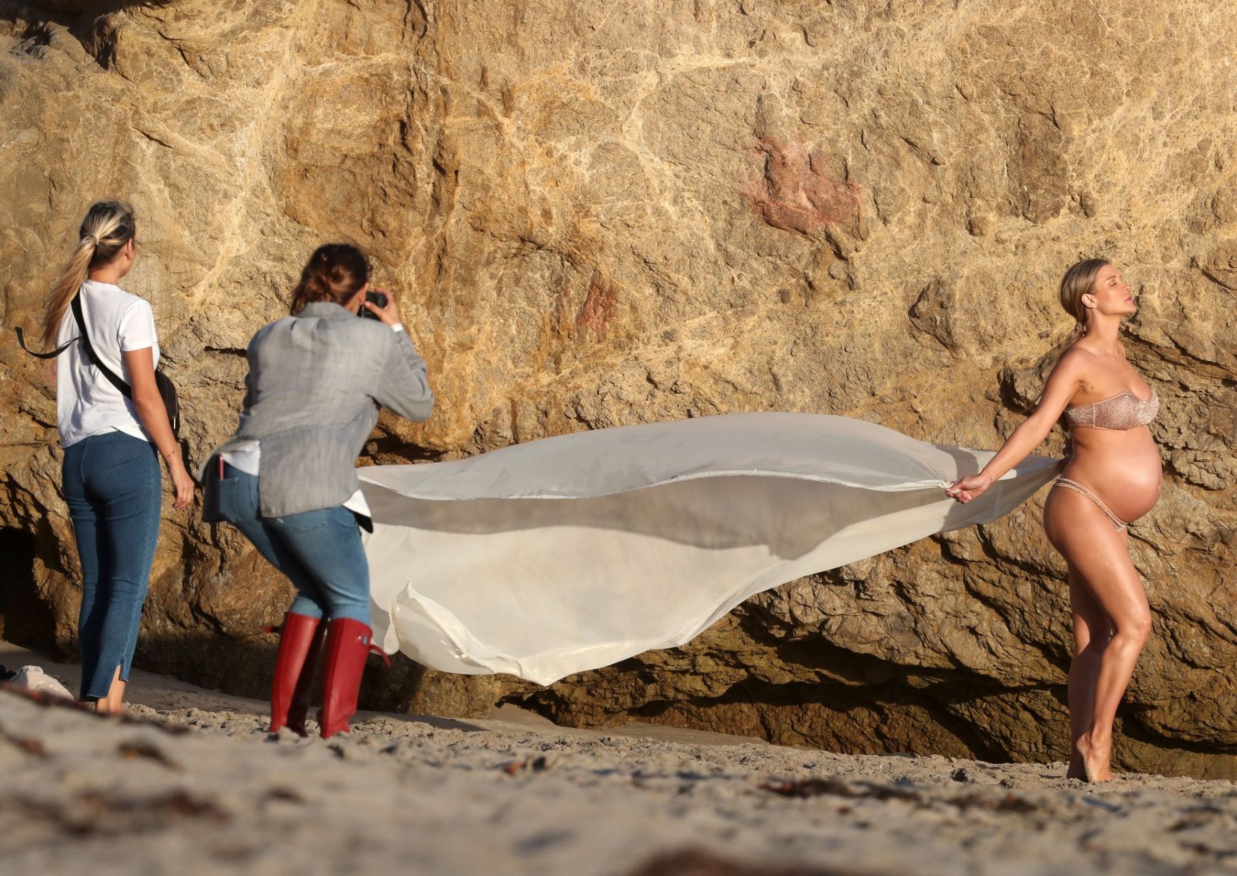 La presentatrice televisiva di origine polacca, che aspetta il suo primo figlio, una femmina, con il nuovo marito Doug Nunes, ha posato in un bikini senza spalline color champagne scintillante e un coprispalle di seta per lo scatto iconico a Malibu.