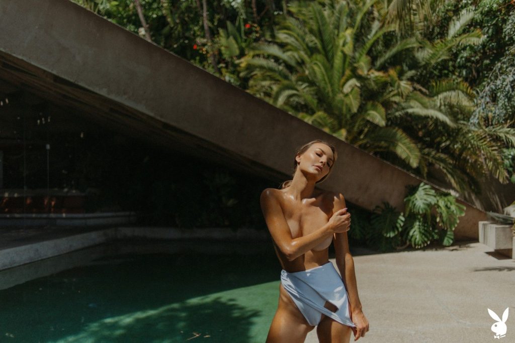 Jocelyn Binder si spoglia in un servizio fotografico per Playboy Plus (202). La ragazza sexy mostra i suoi seni oliati, il sedere e la vagina rasata, posando a bordo piscina.