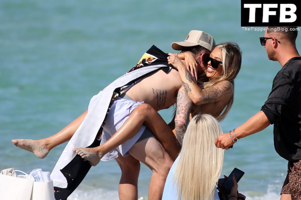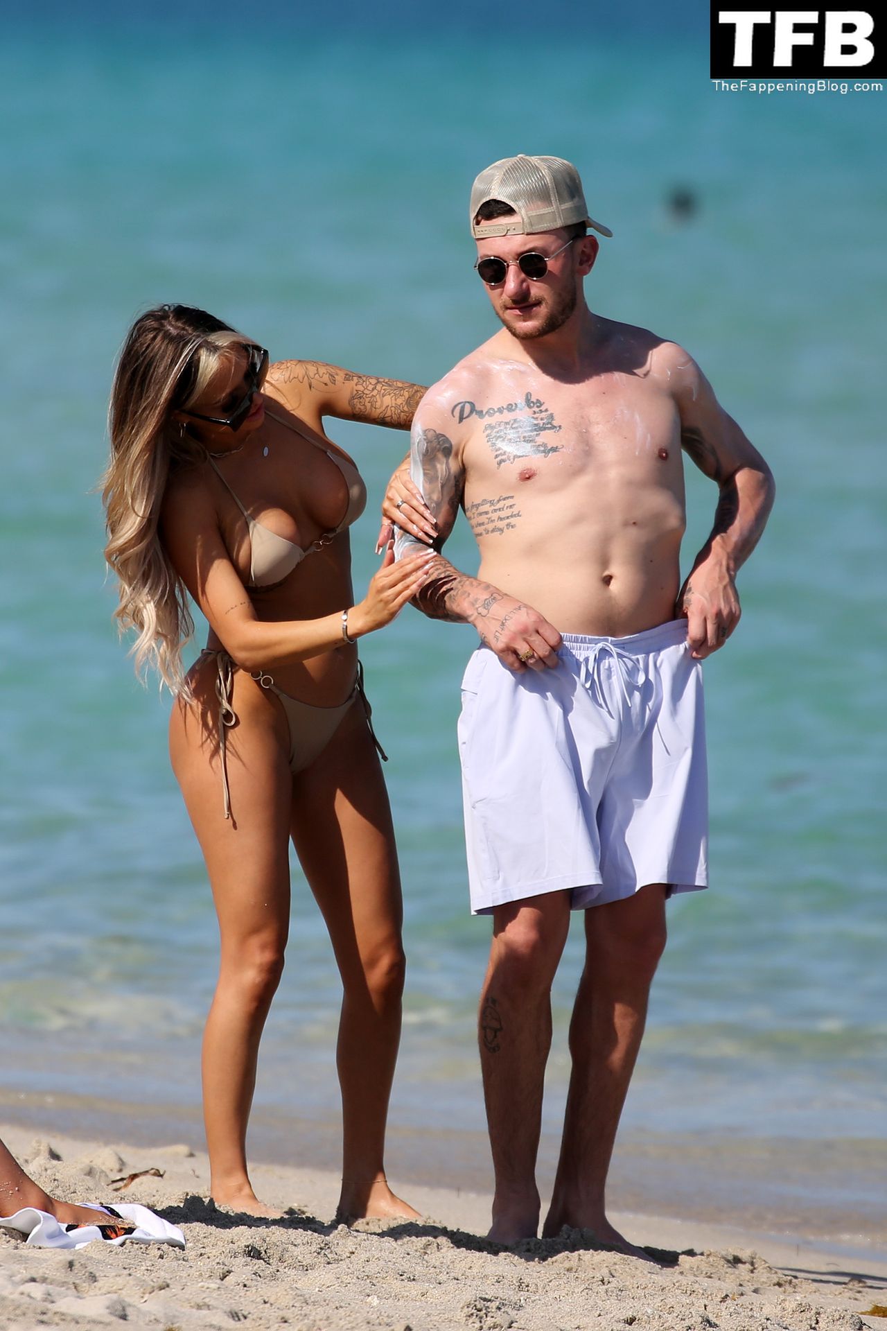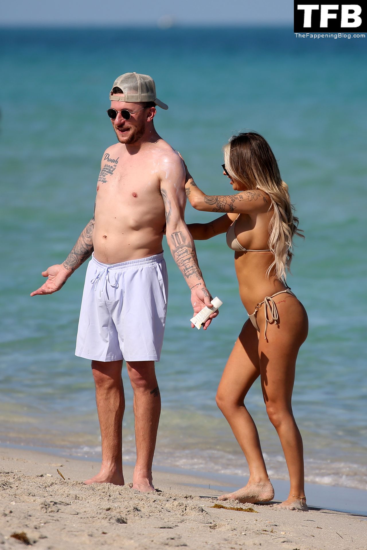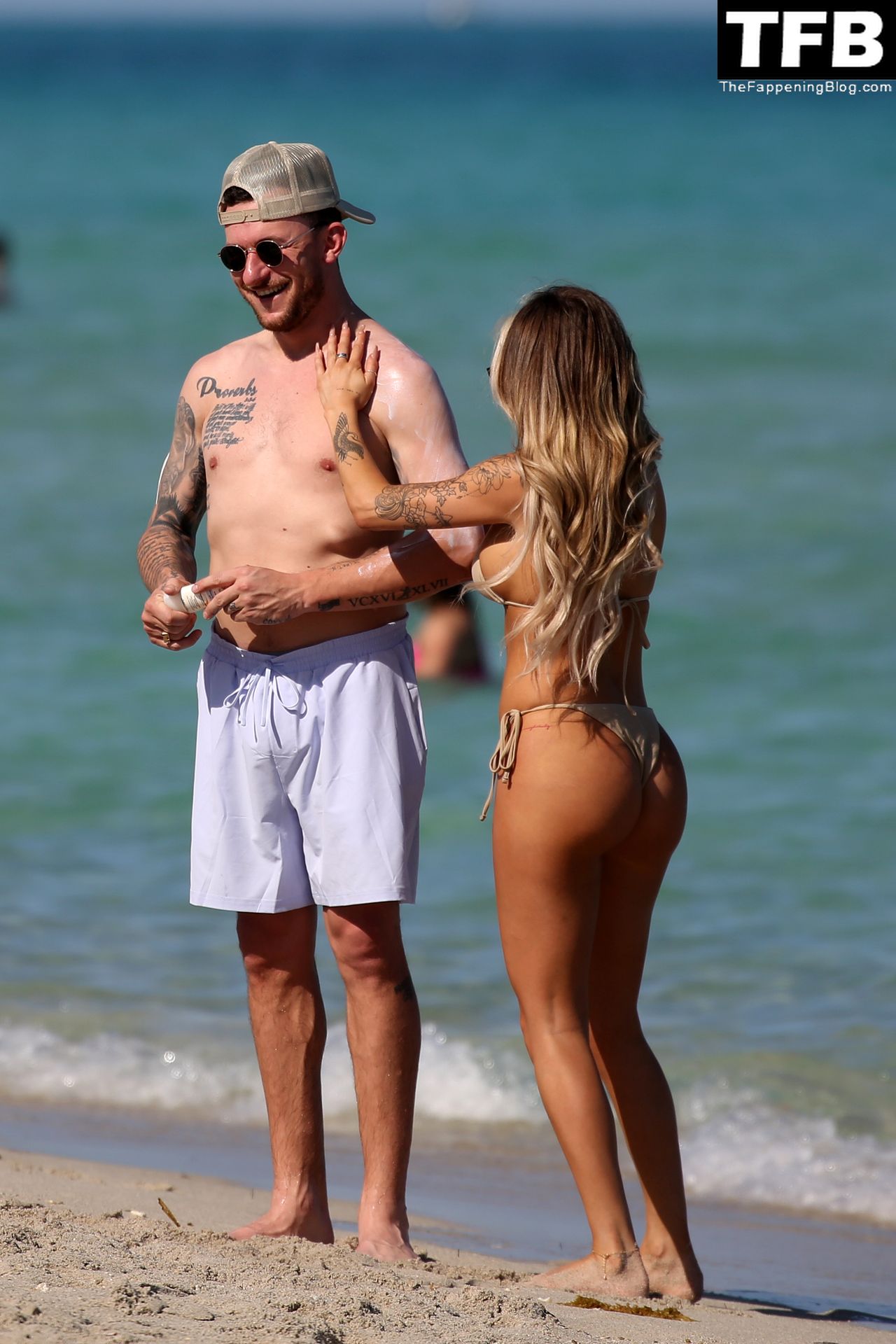 La star NFL caduta in disgrazia Johnny Manziel sembra non avere alcuna preoccupazione mentre si gode la spiaggia con una donna bionda in bikini, un pallone da football e una confezione di White Claw a Miami, 29/03/2022.