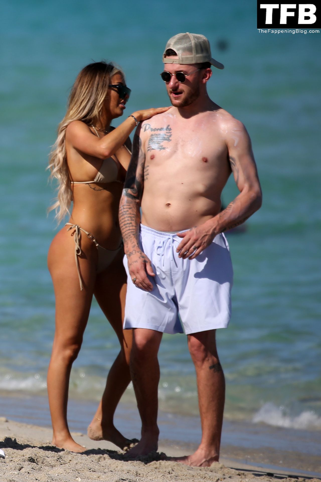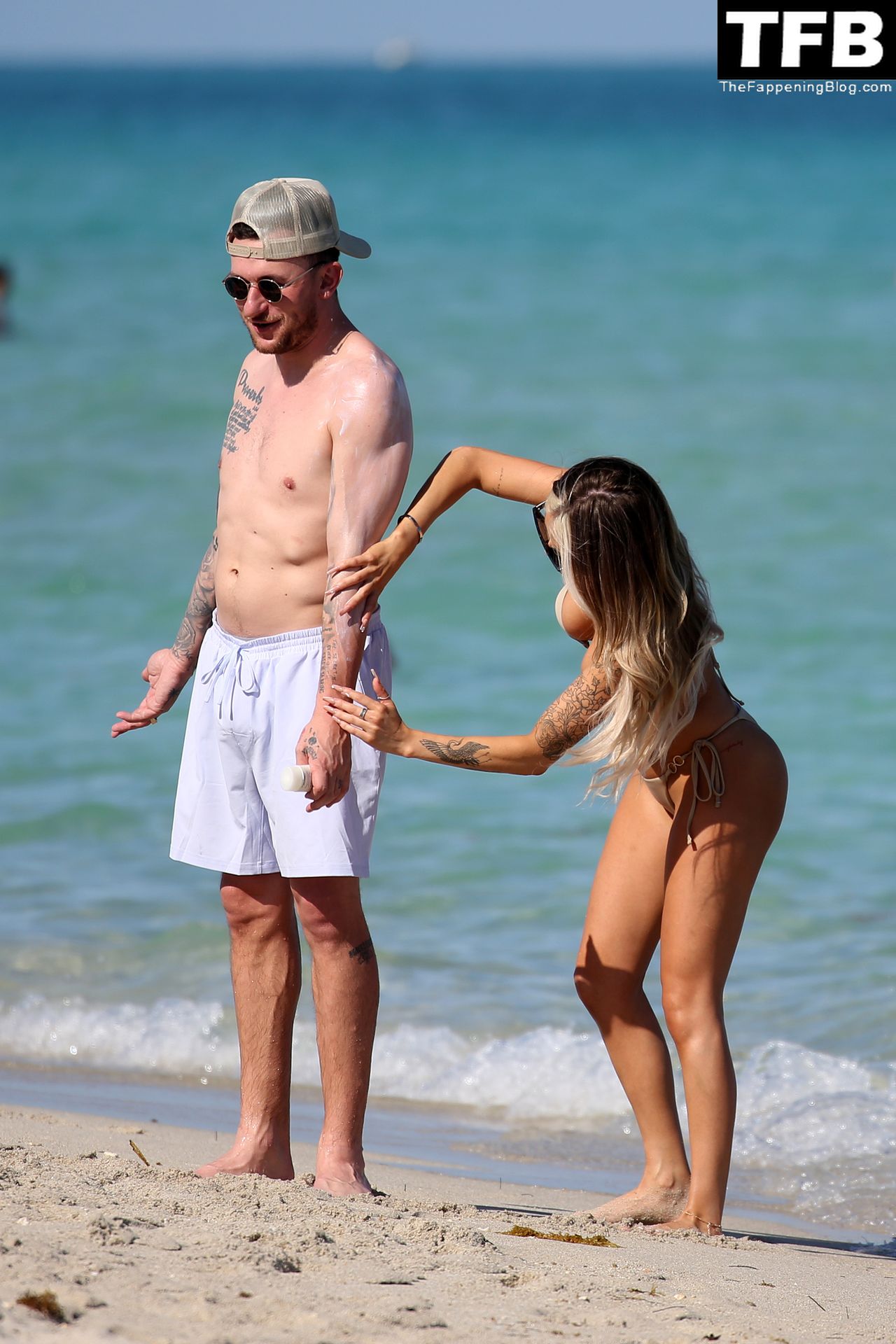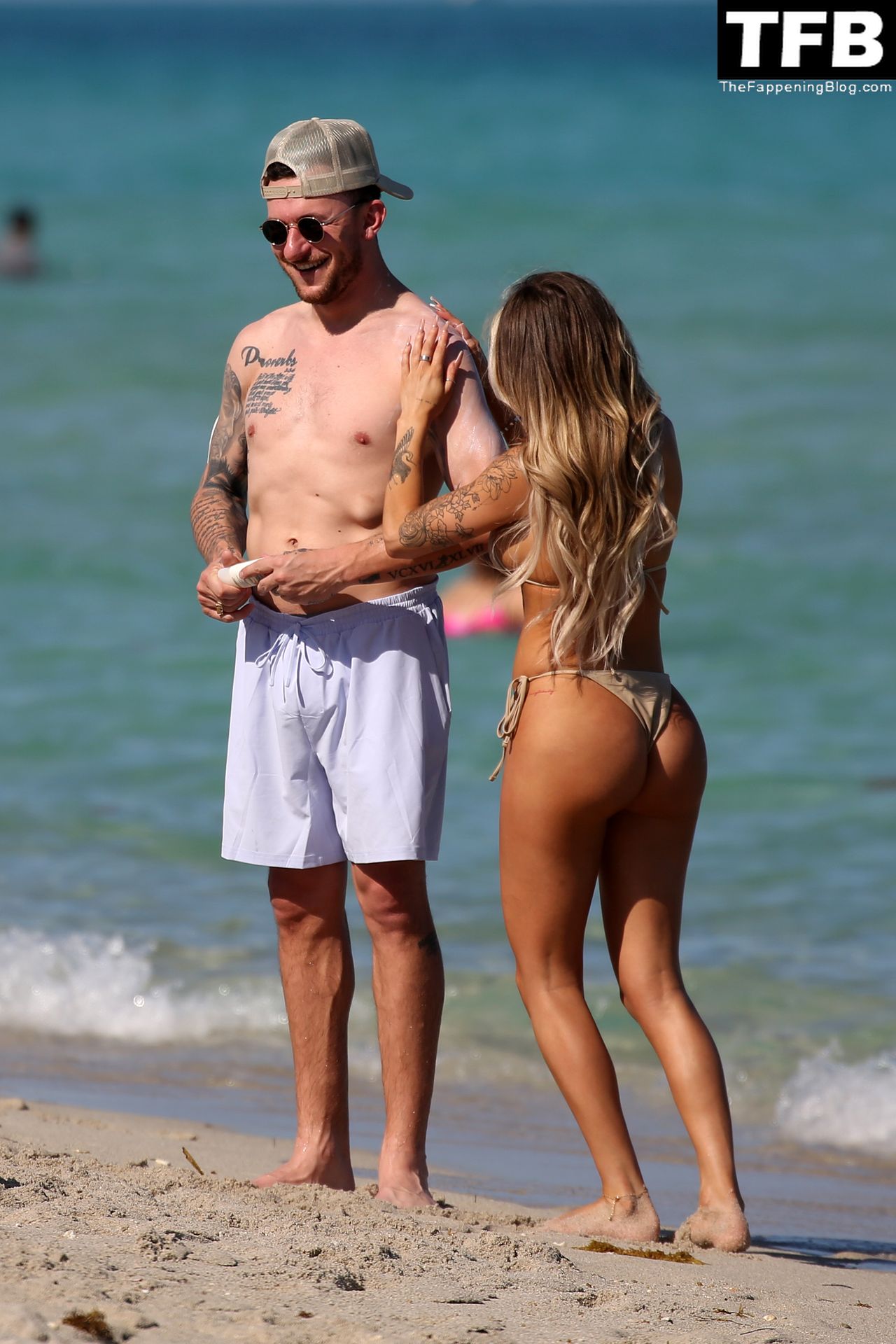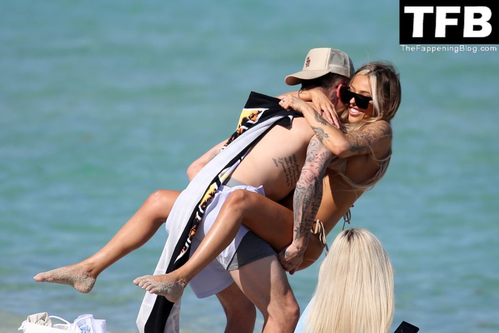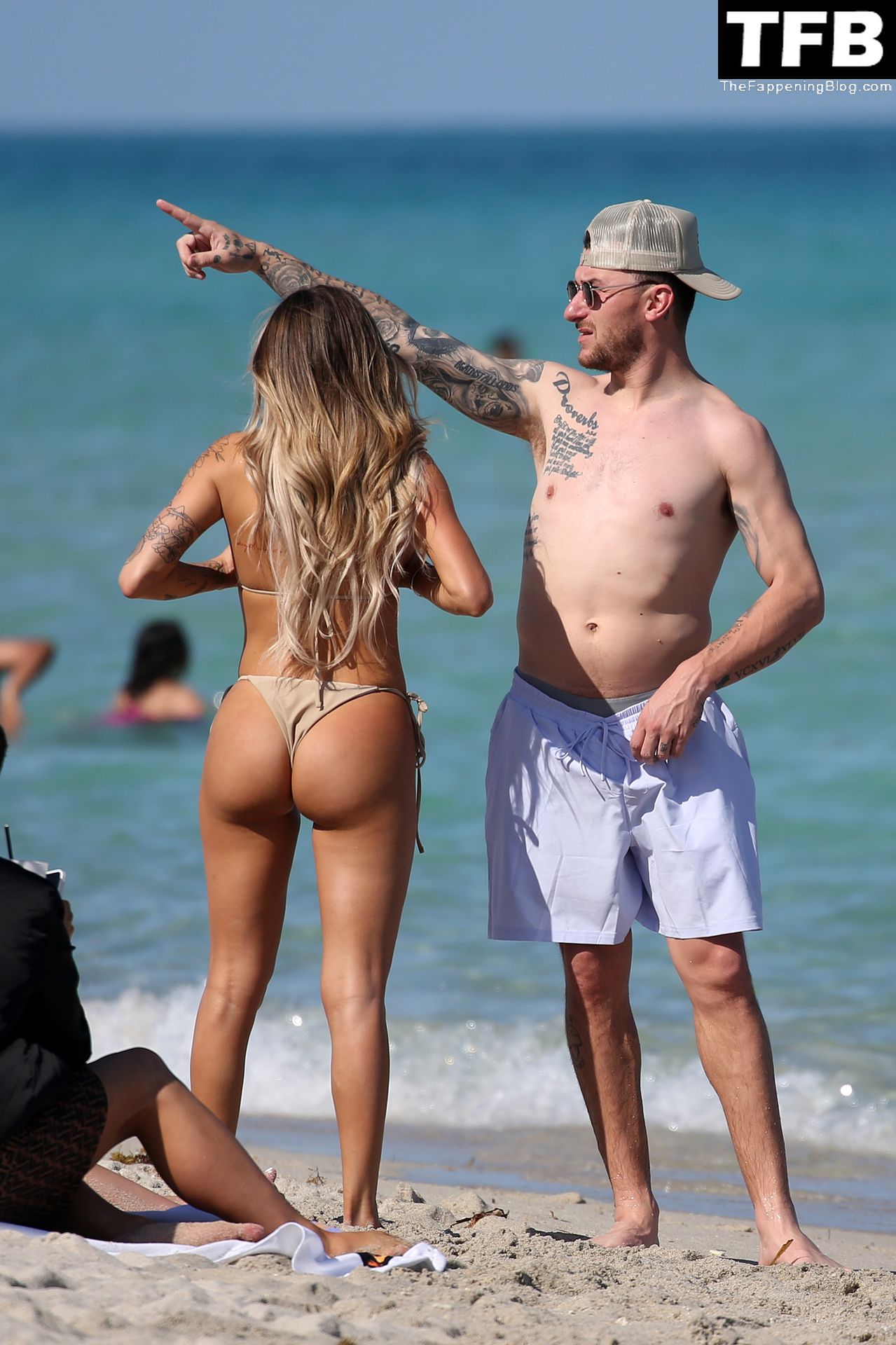 La star NFL caduta in disgrazia Johnny Manziel sembra non avere alcuna preoccupazione mentre si gode la spiaggia con una donna bionda in bikini, un pallone da football e una confezione di White Claw a Miami, 29/03/2022.