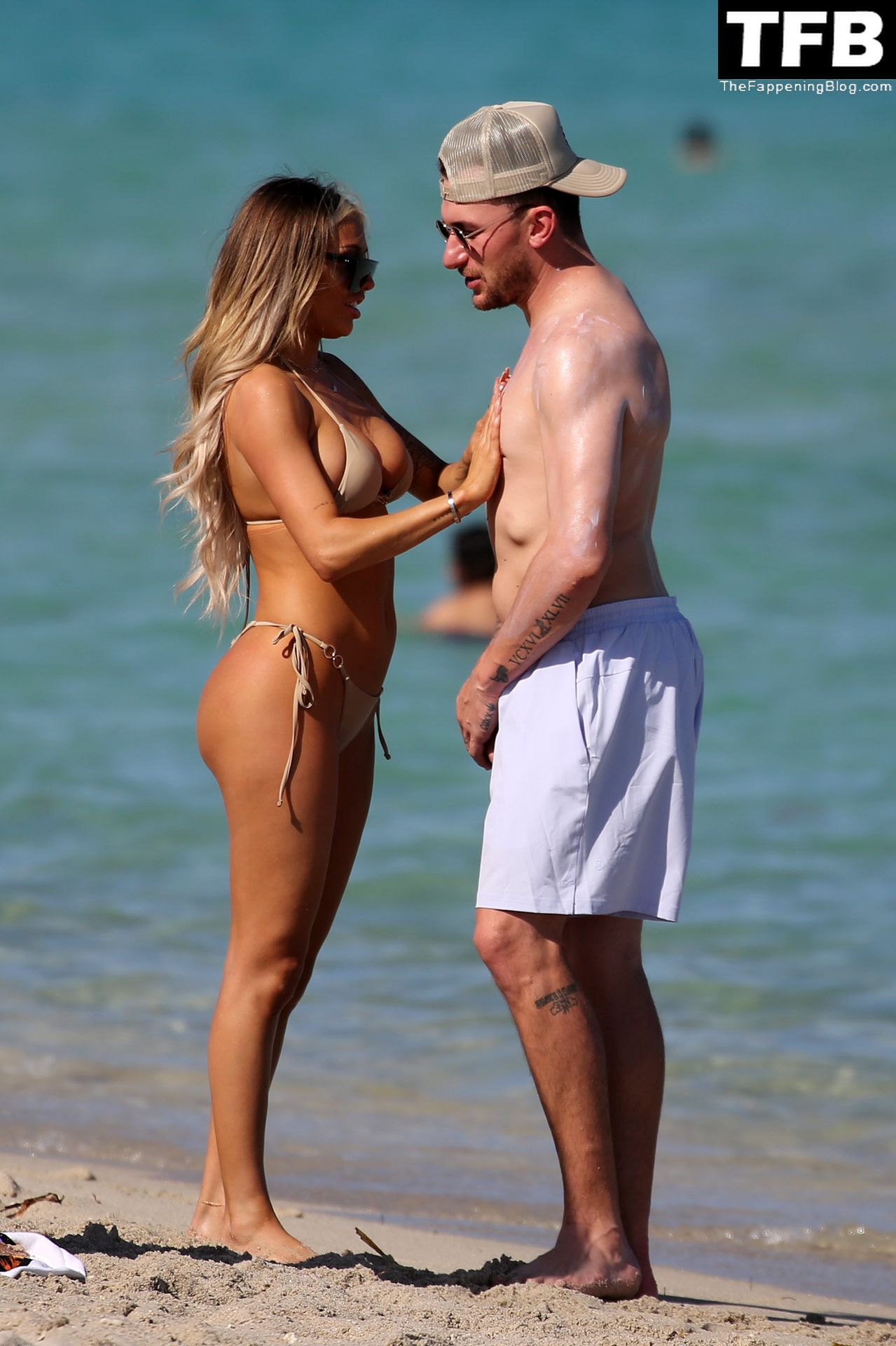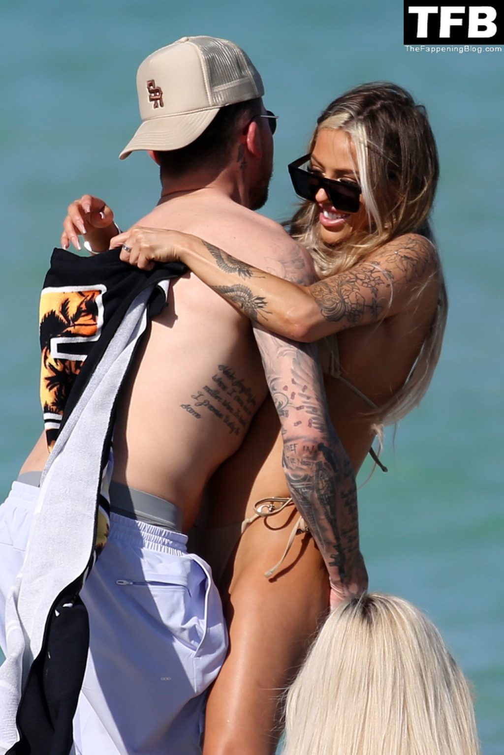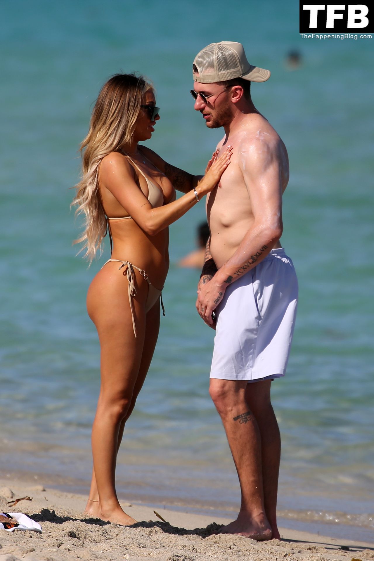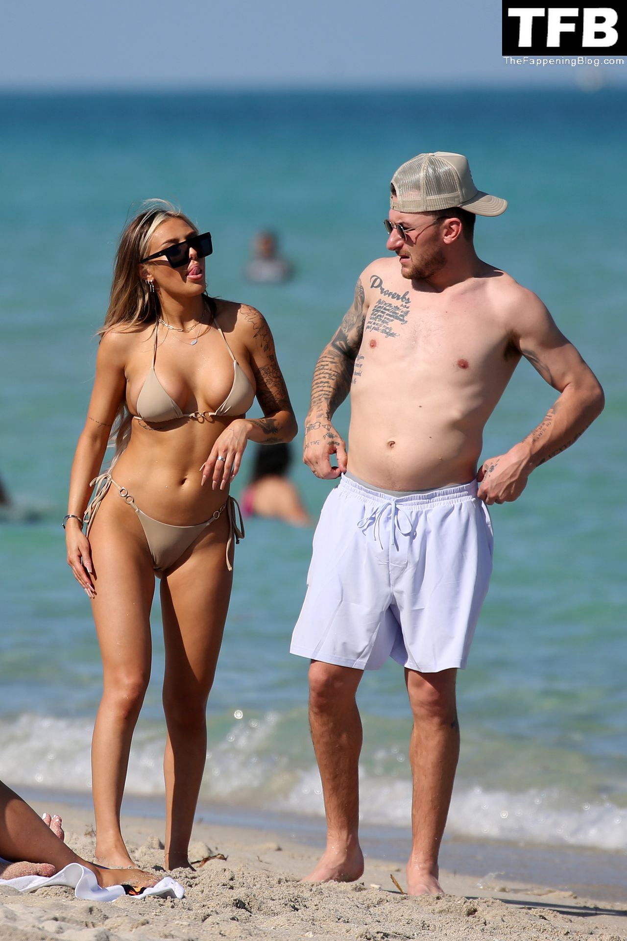 La star NFL caduta in disgrazia Johnny Manziel sembra non avere alcuna preoccupazione mentre si gode la spiaggia con una donna bionda in bikini, un pallone da football e una confezione di White Claw a Miami, 29/03/2022.