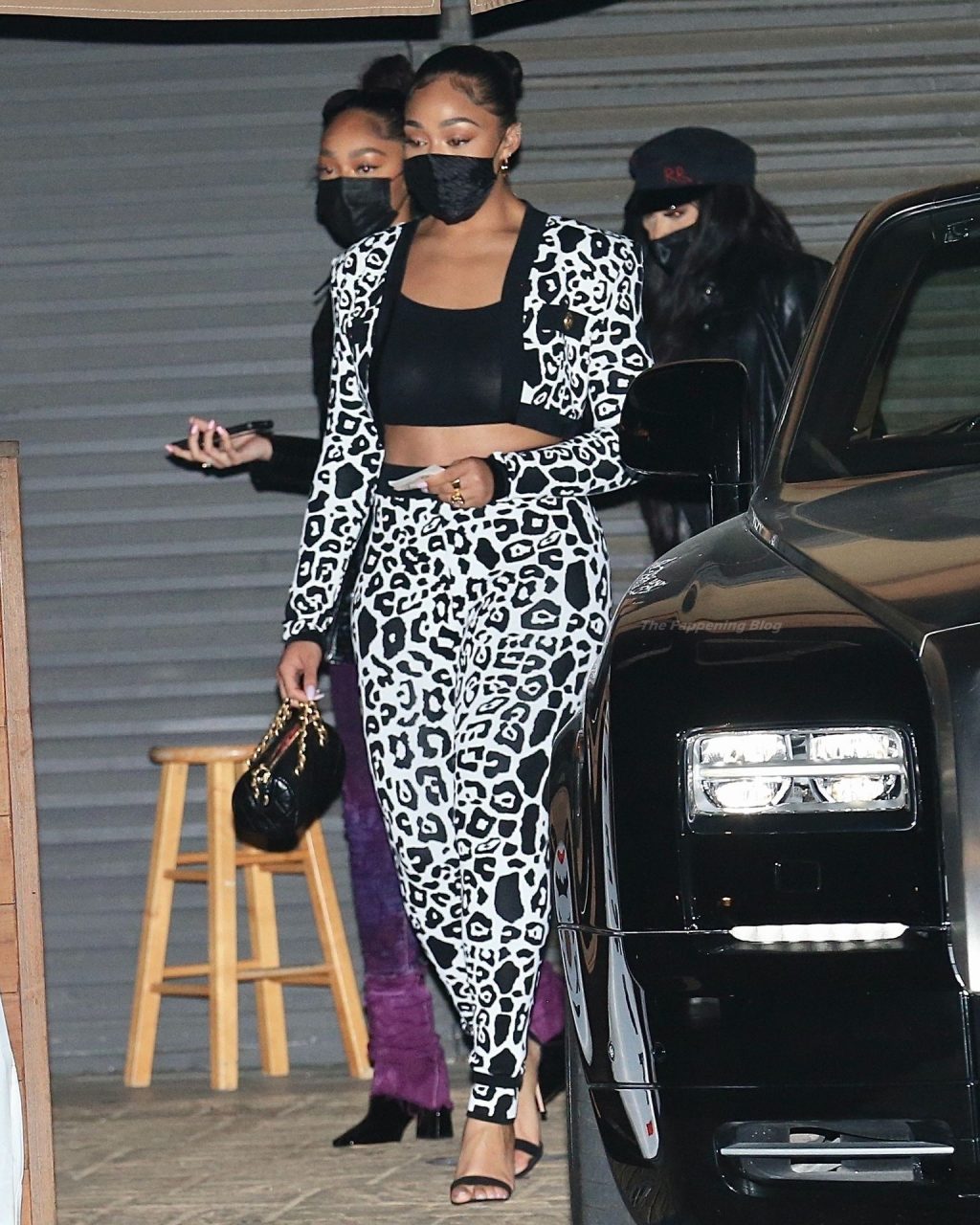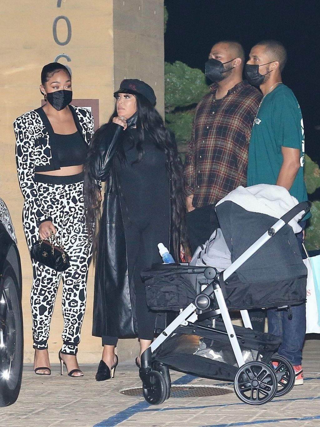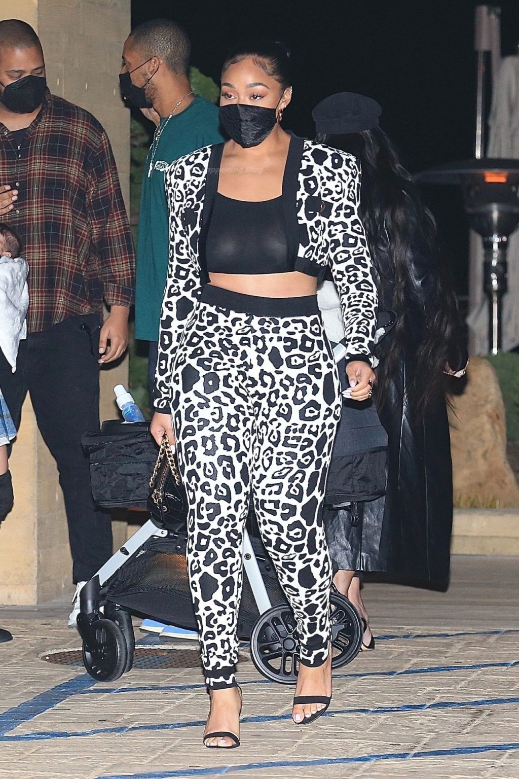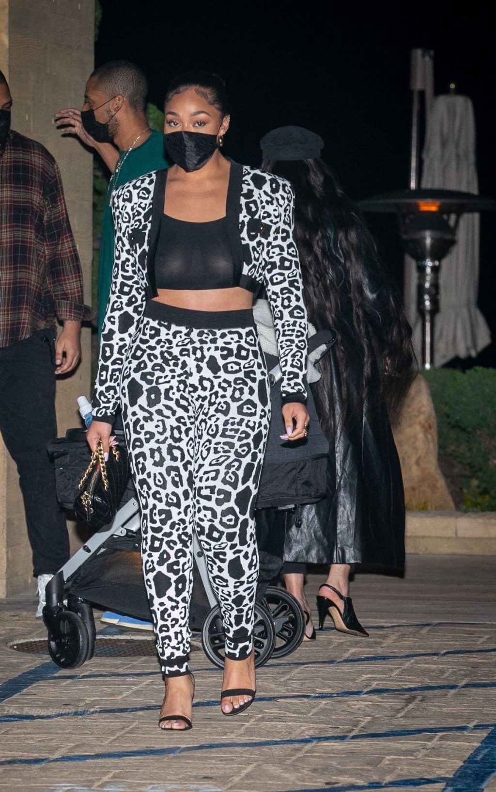 Jordyn Woods e la famiglia festeggiano il 53° compleanno di sua madre Elizabeth Woods al ristorante Nobu a Malibu, 31/03/2021. Jordyn ha mostrato il suo seno in una fantasia bianco e nero a macchie di mucca con una maglia nera trasparente.