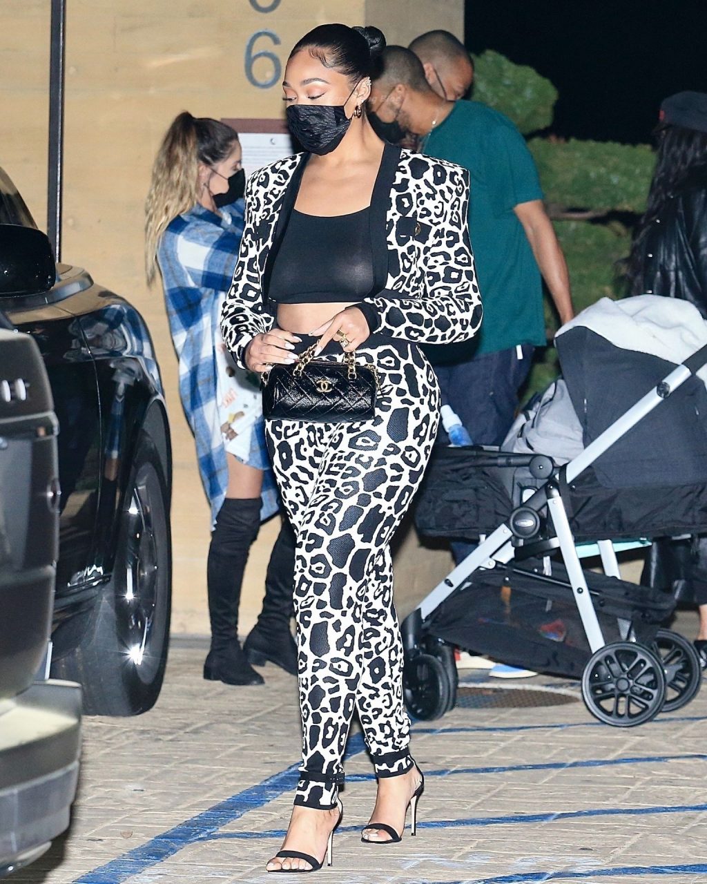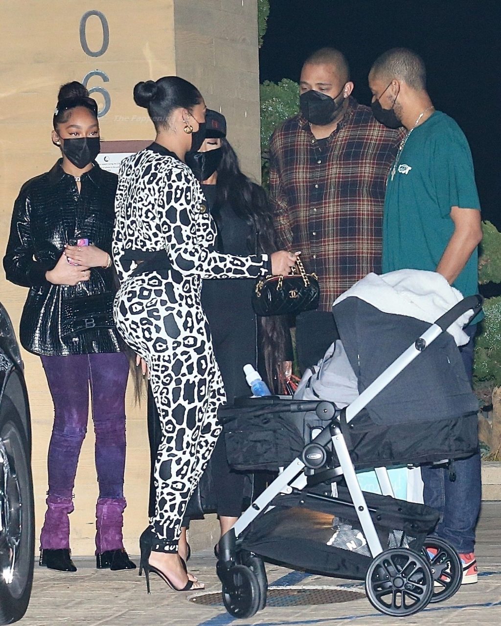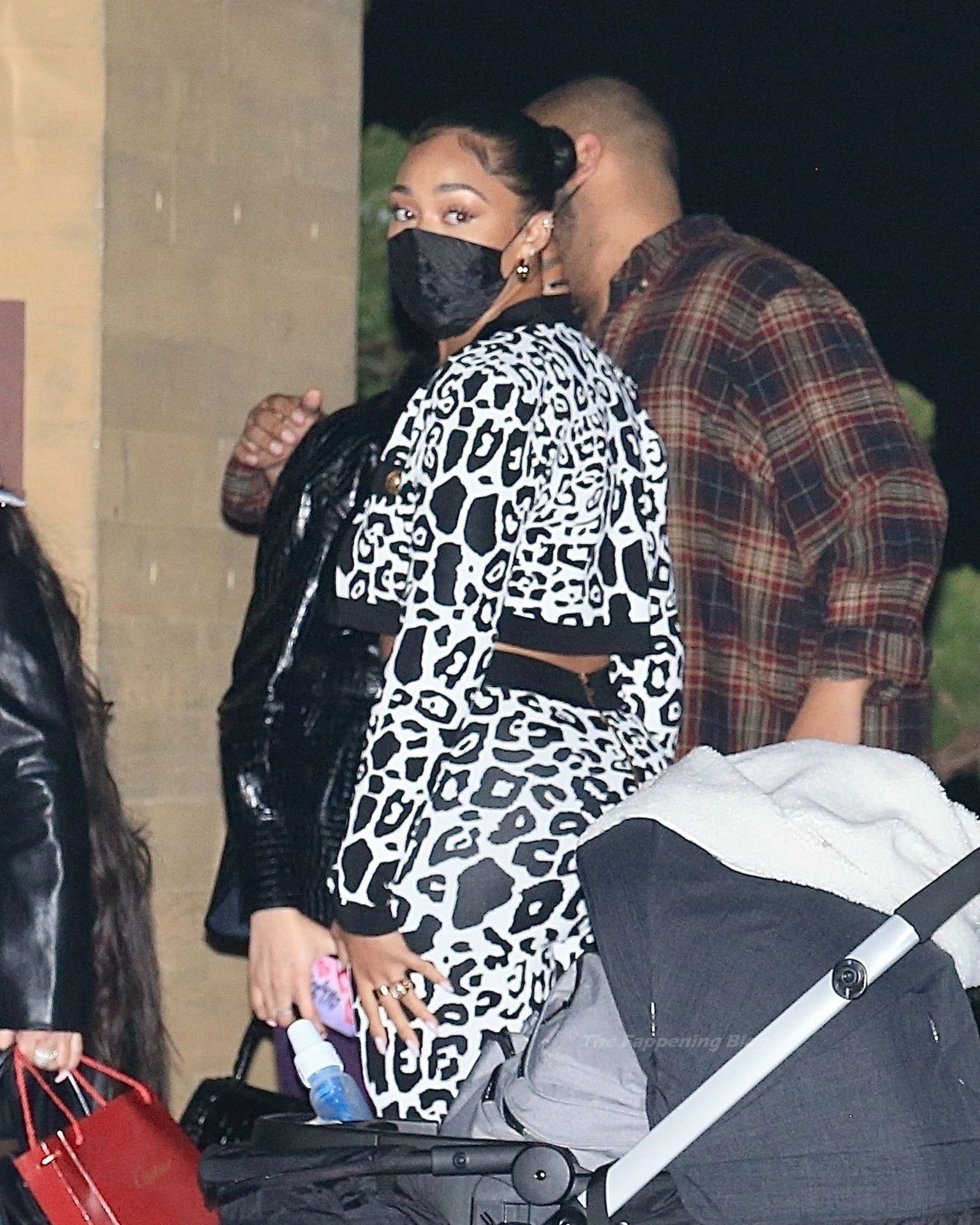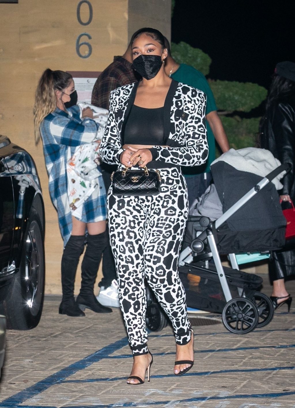 Jordyn Woods e la famiglia festeggiano il 53° compleanno di sua madre Elizabeth Woods al ristorante Nobu a Malibu, 31/03/2021. Jordyn ha mostrato il suo seno in una fantasia bianco e nero a macchie di mucca con una maglia nera trasparente.