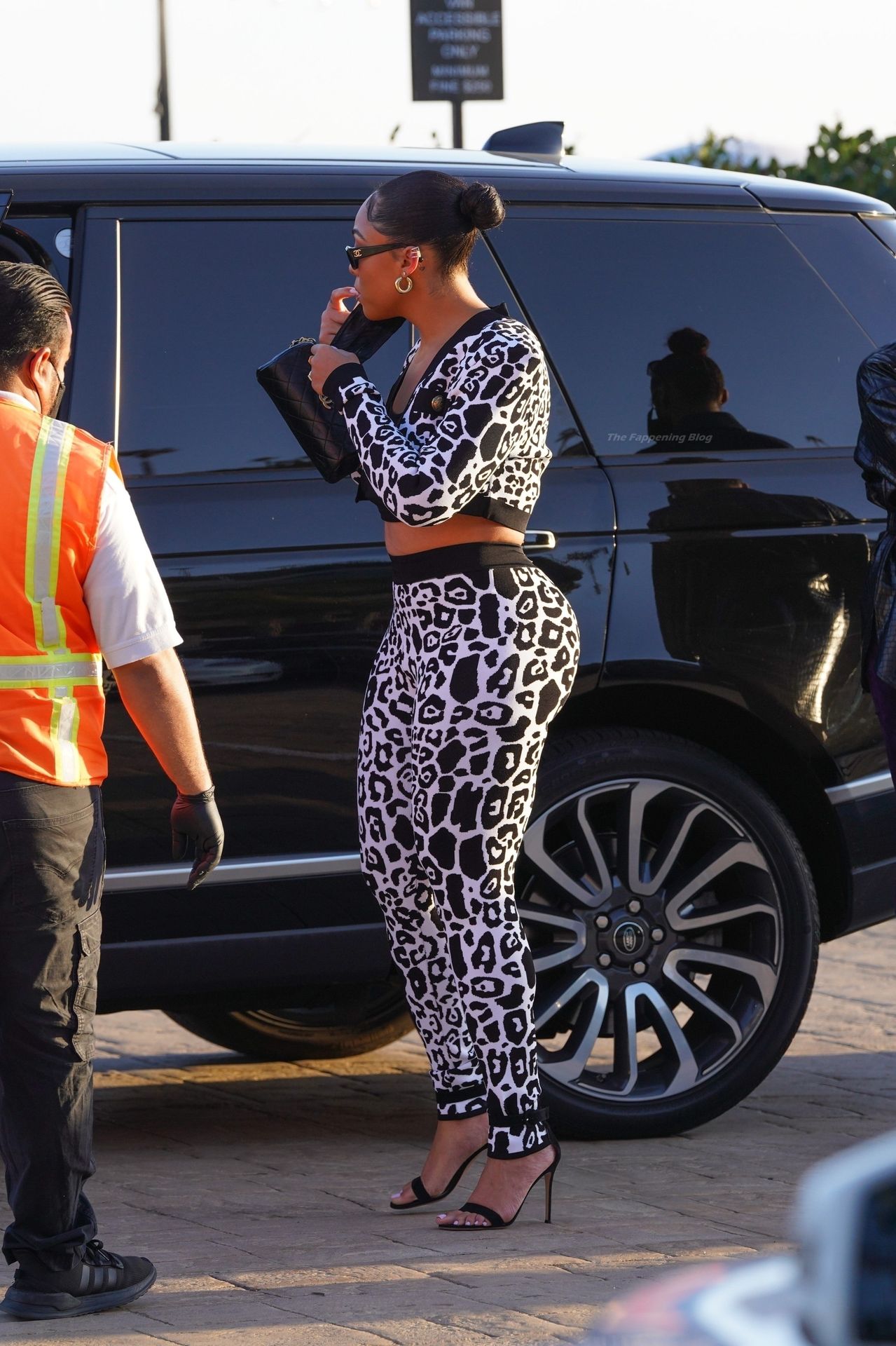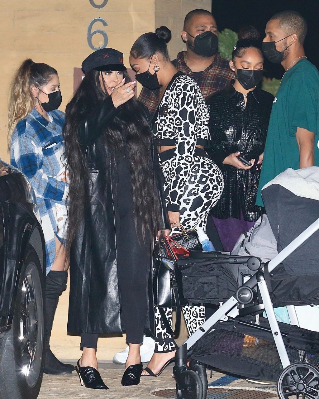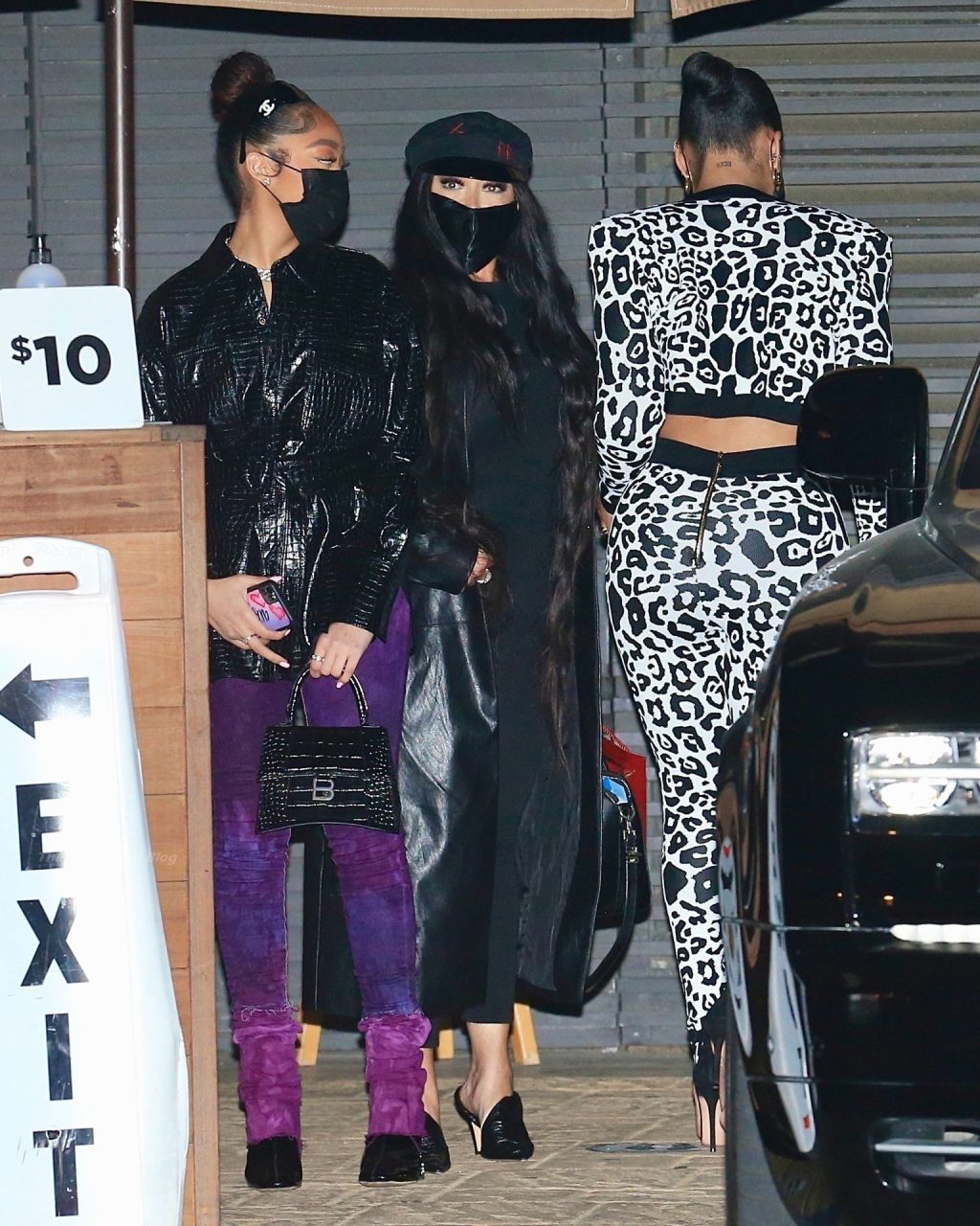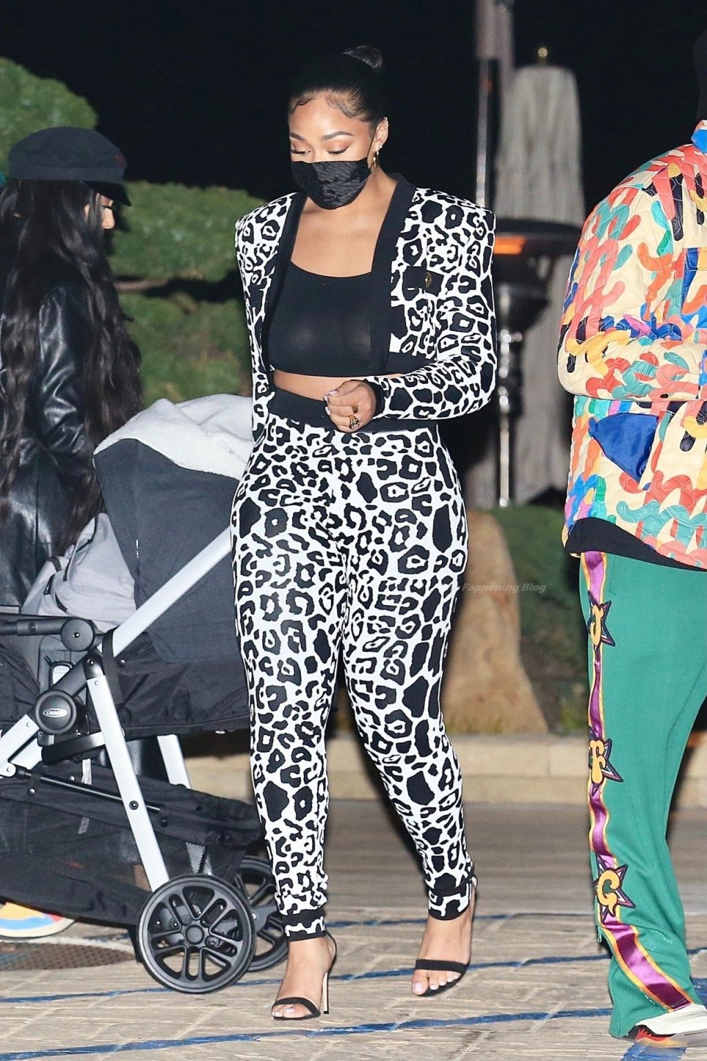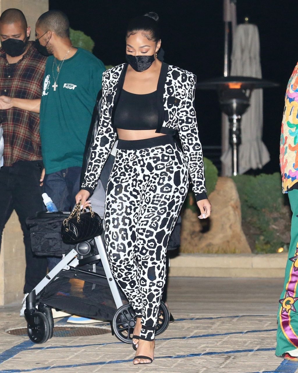 Jordyn Woods e la famiglia festeggiano il 53° compleanno di sua madre Elizabeth Woods al ristorante Nobu a Malibu, 31/03/2021. Jordyn ha mostrato il suo seno in una fantasia bianco e nero a macchie di mucca con una maglia nera trasparente.