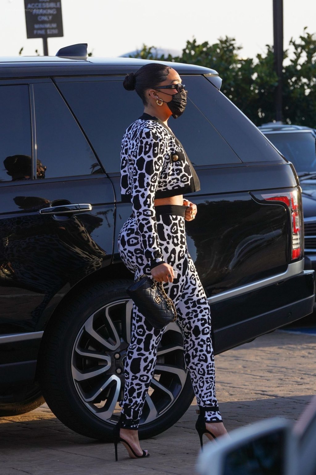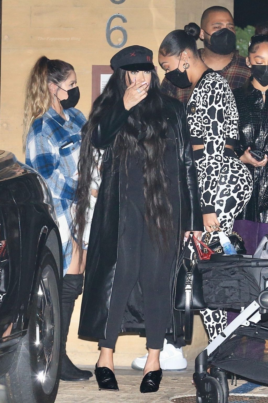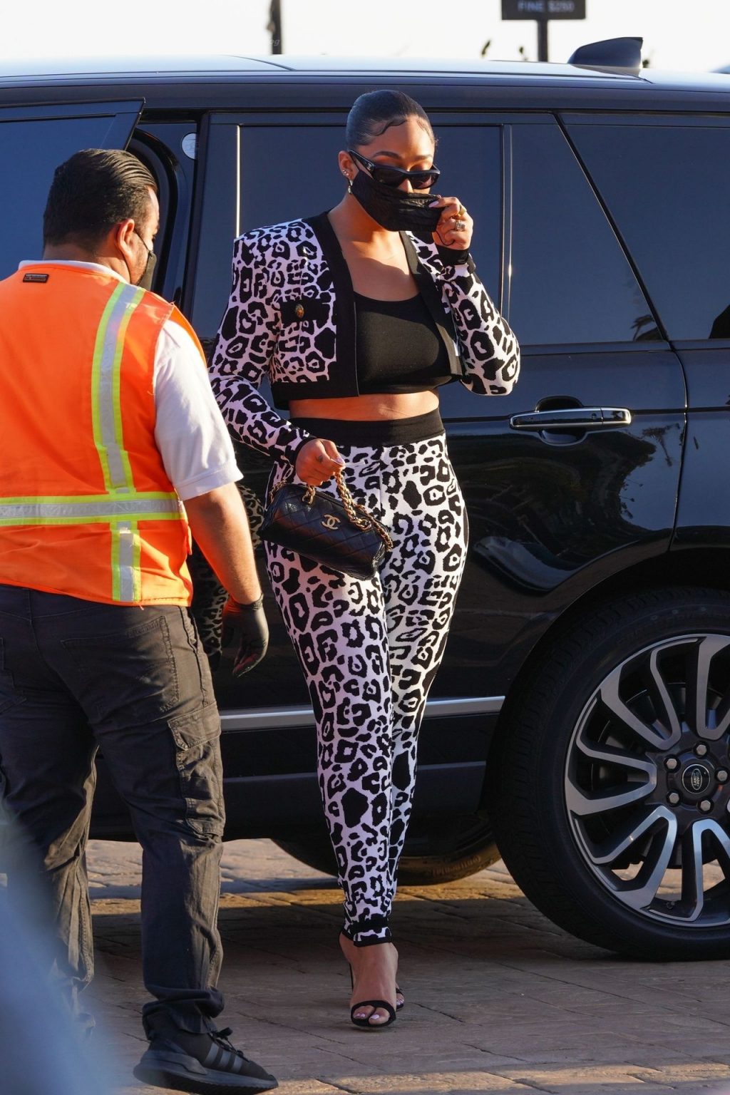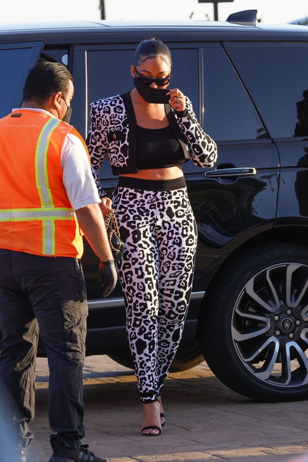 Jordyn Woods e la famiglia festeggiano il 53° compleanno di sua madre Elizabeth Woods al ristorante Nobu a Malibu, 31/03/2021. Jordyn ha mostrato il suo seno in una fantasia bianco e nero a macchie di mucca con una maglia nera trasparente.