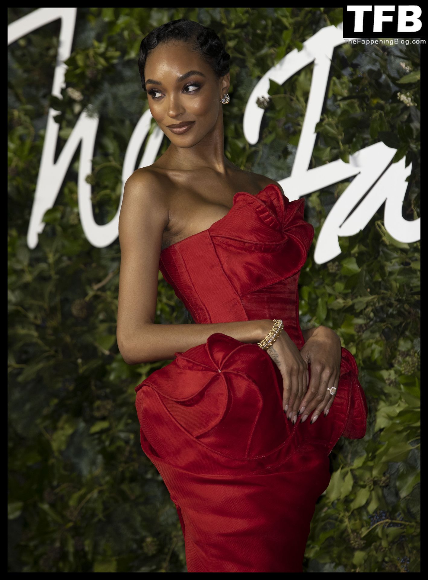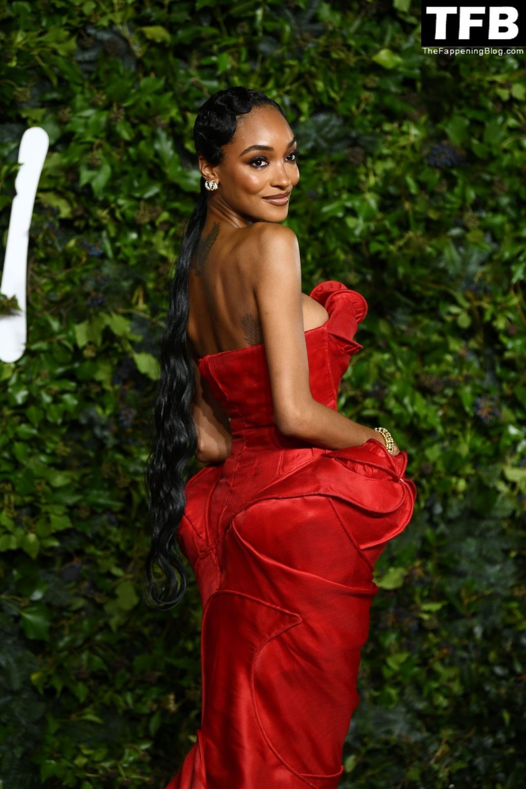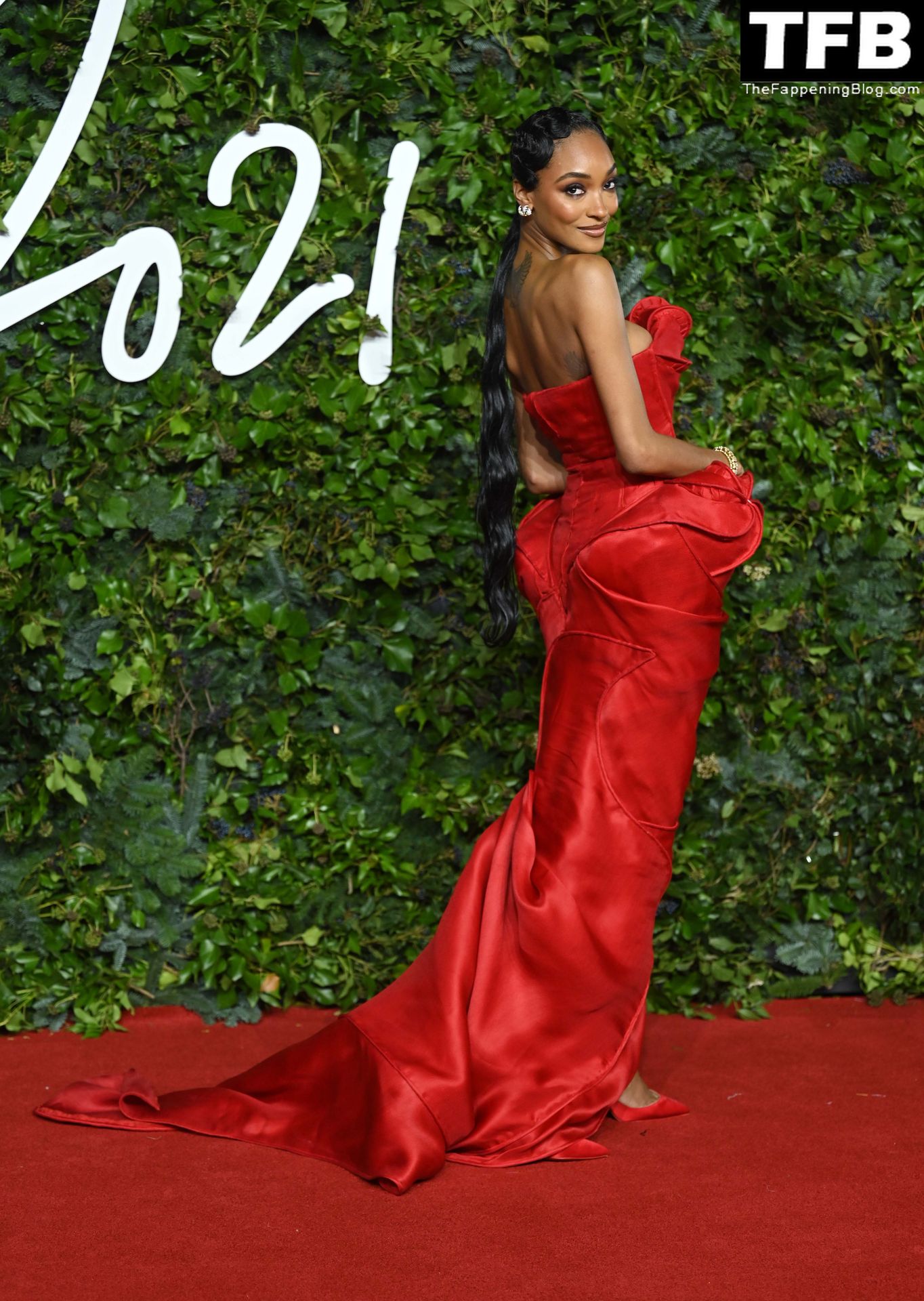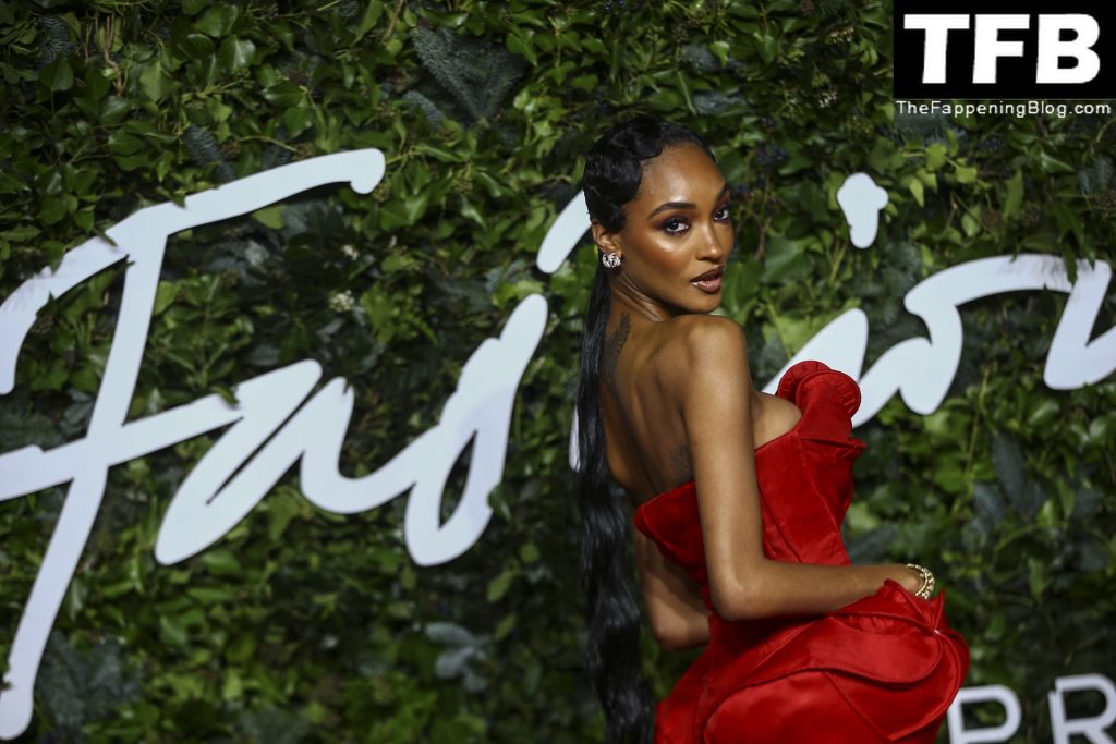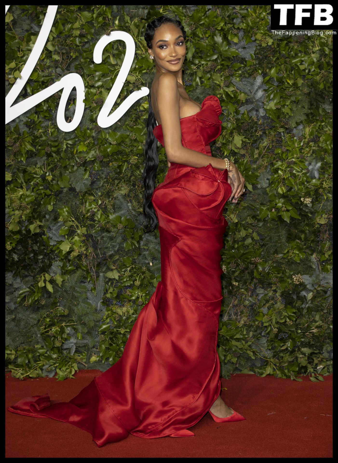 Modella Jourdan Dunn mostra il seno, indossando un vestito rosso mentre partecipa ai Fashion Awards 2021 al Royal Albert Hall di Londra, 29/11/2021.