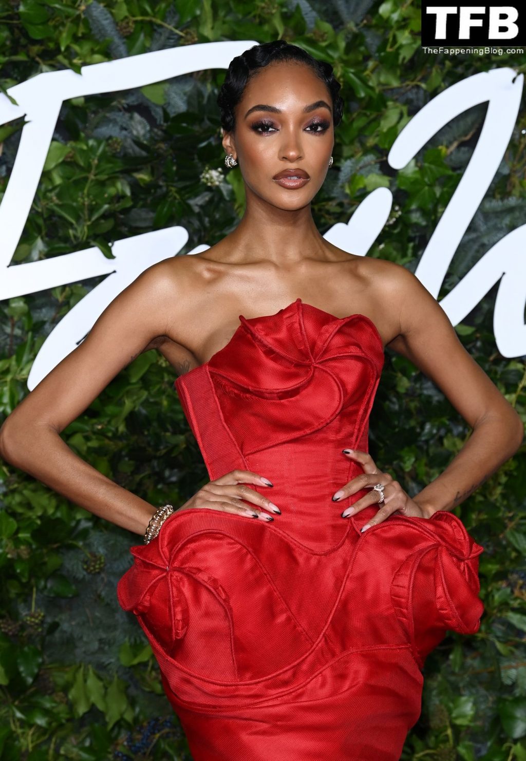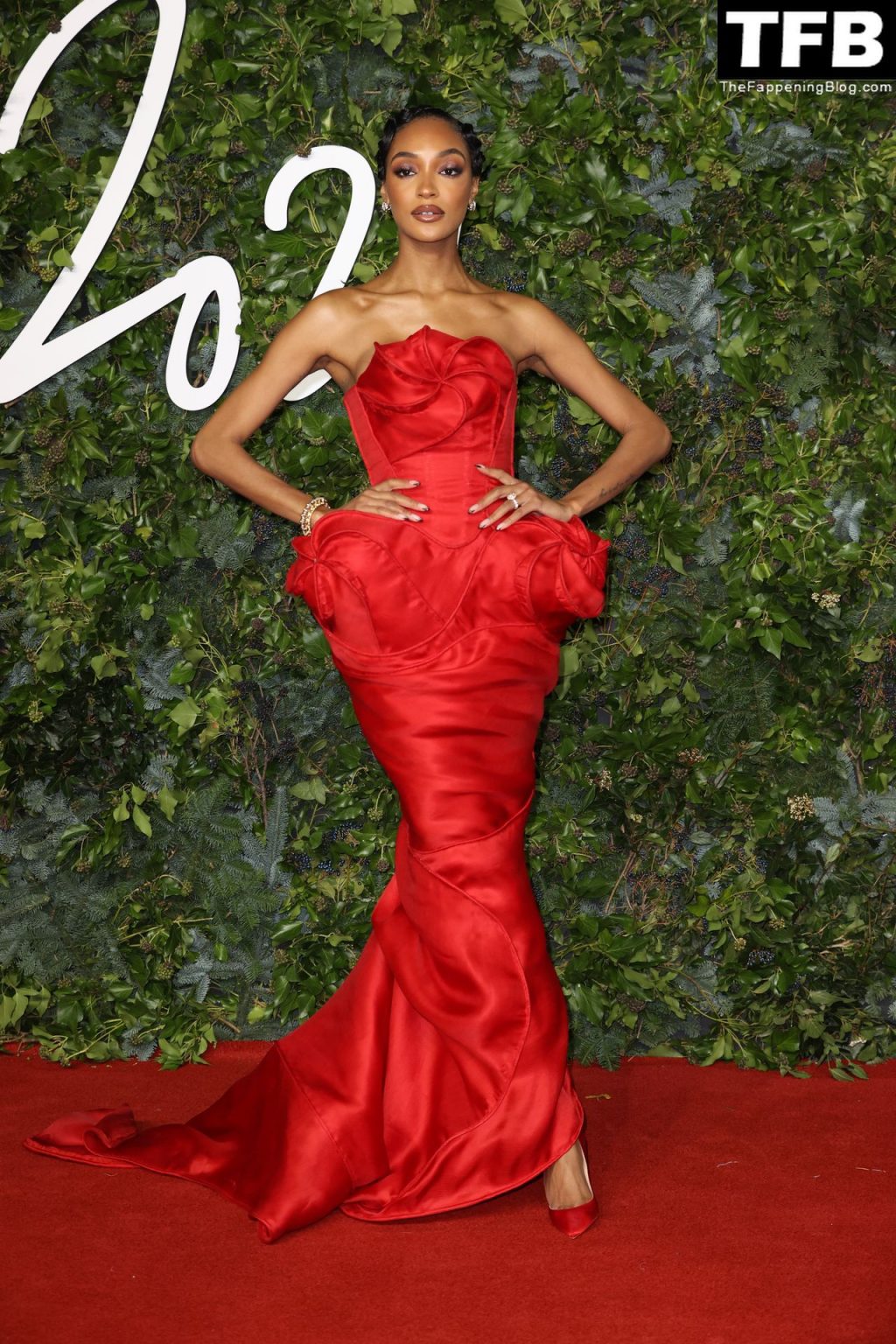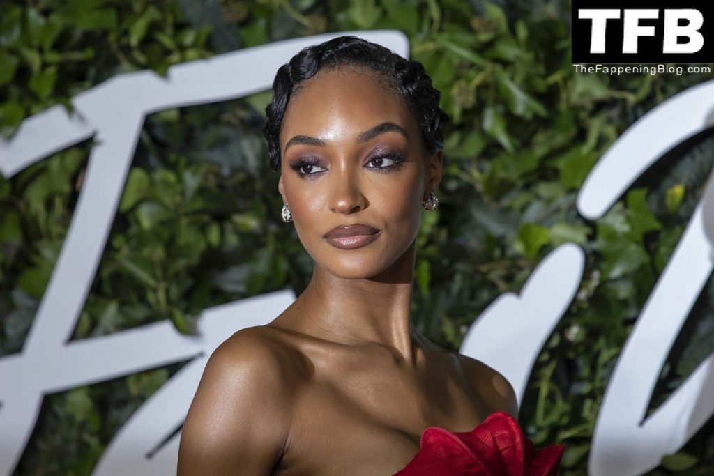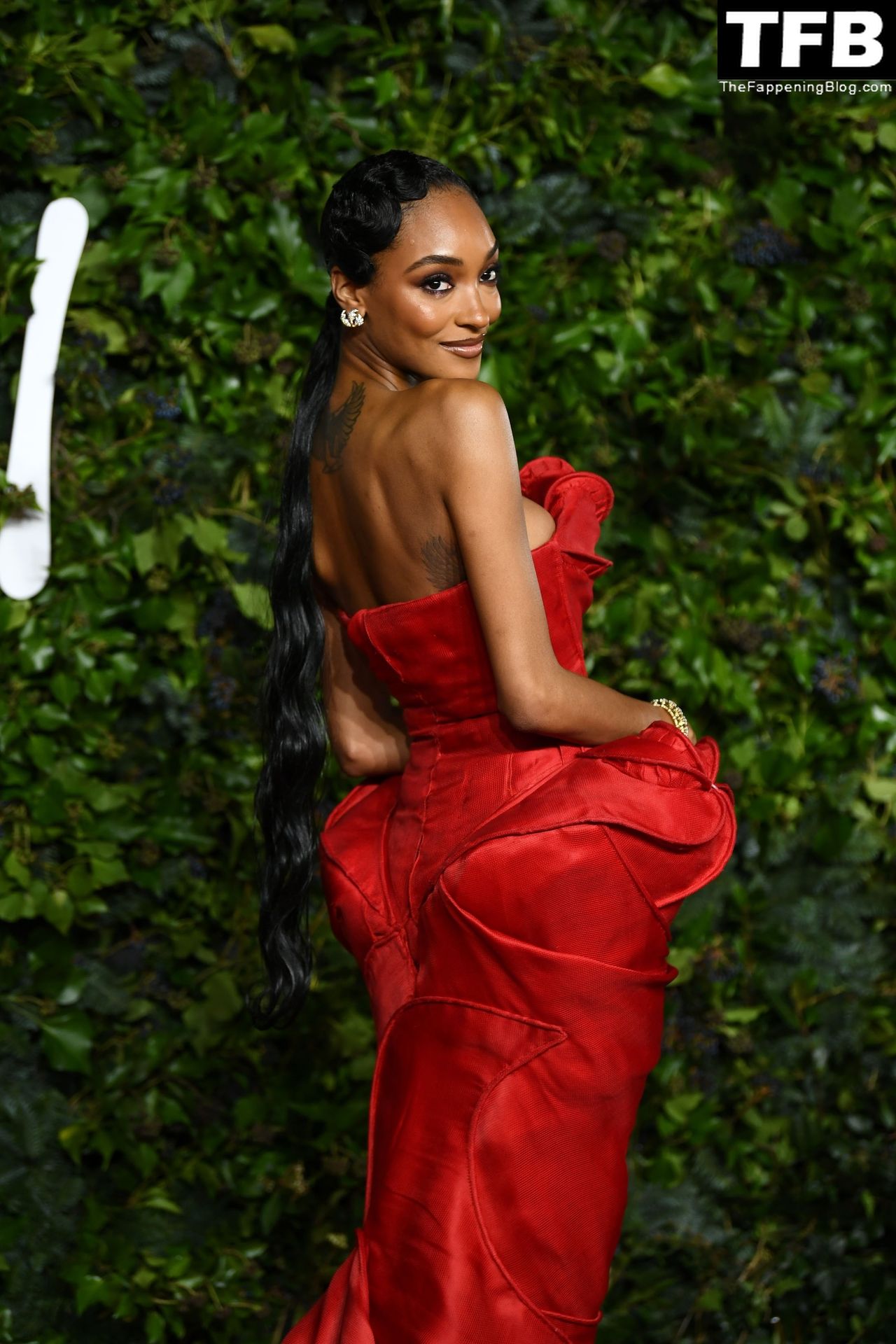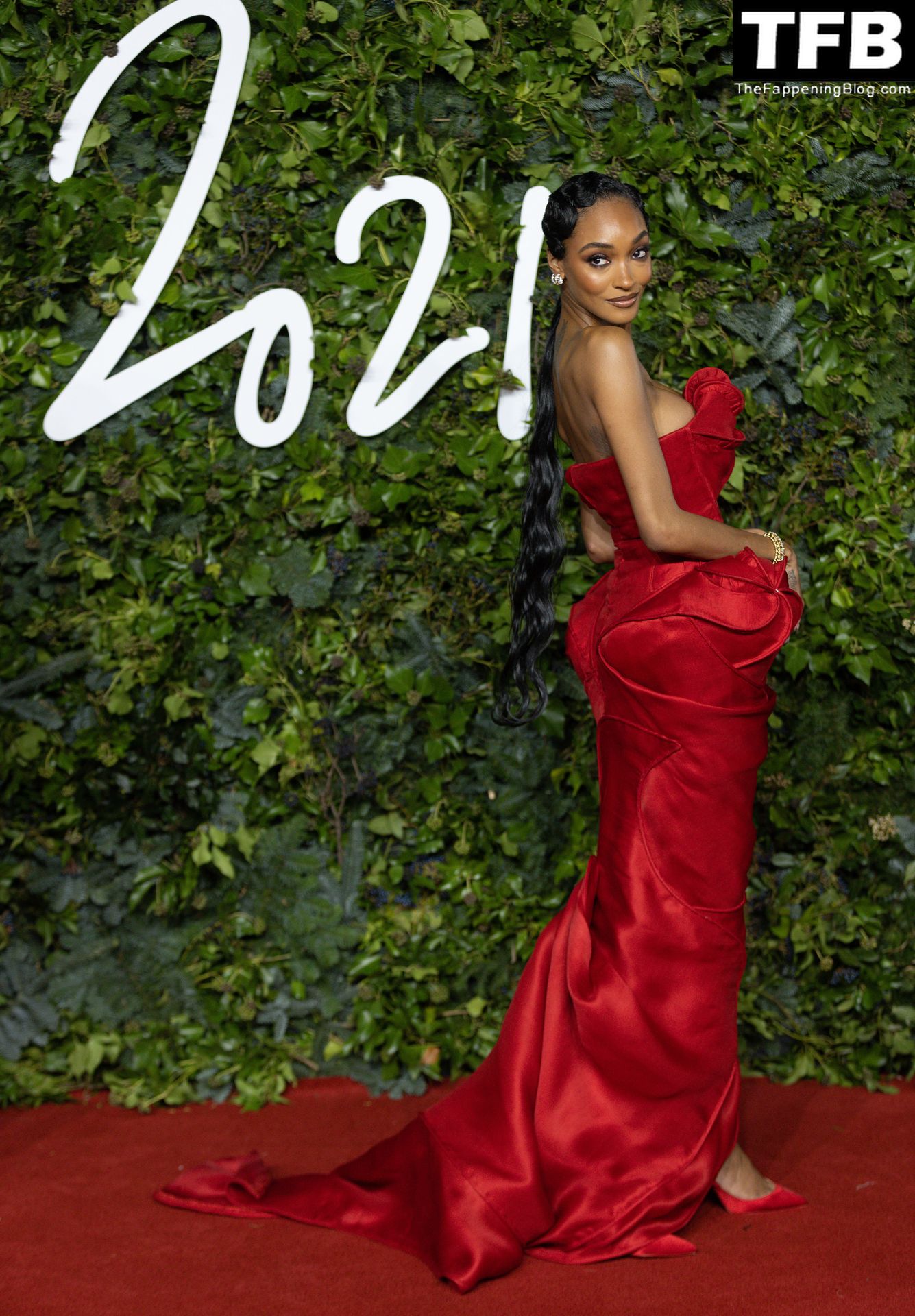 Modella Jourdan Dunn mostra il seno, indossando un vestito rosso mentre partecipa ai Fashion Awards 2021 al Royal Albert Hall di Londra, 29/11/2021.