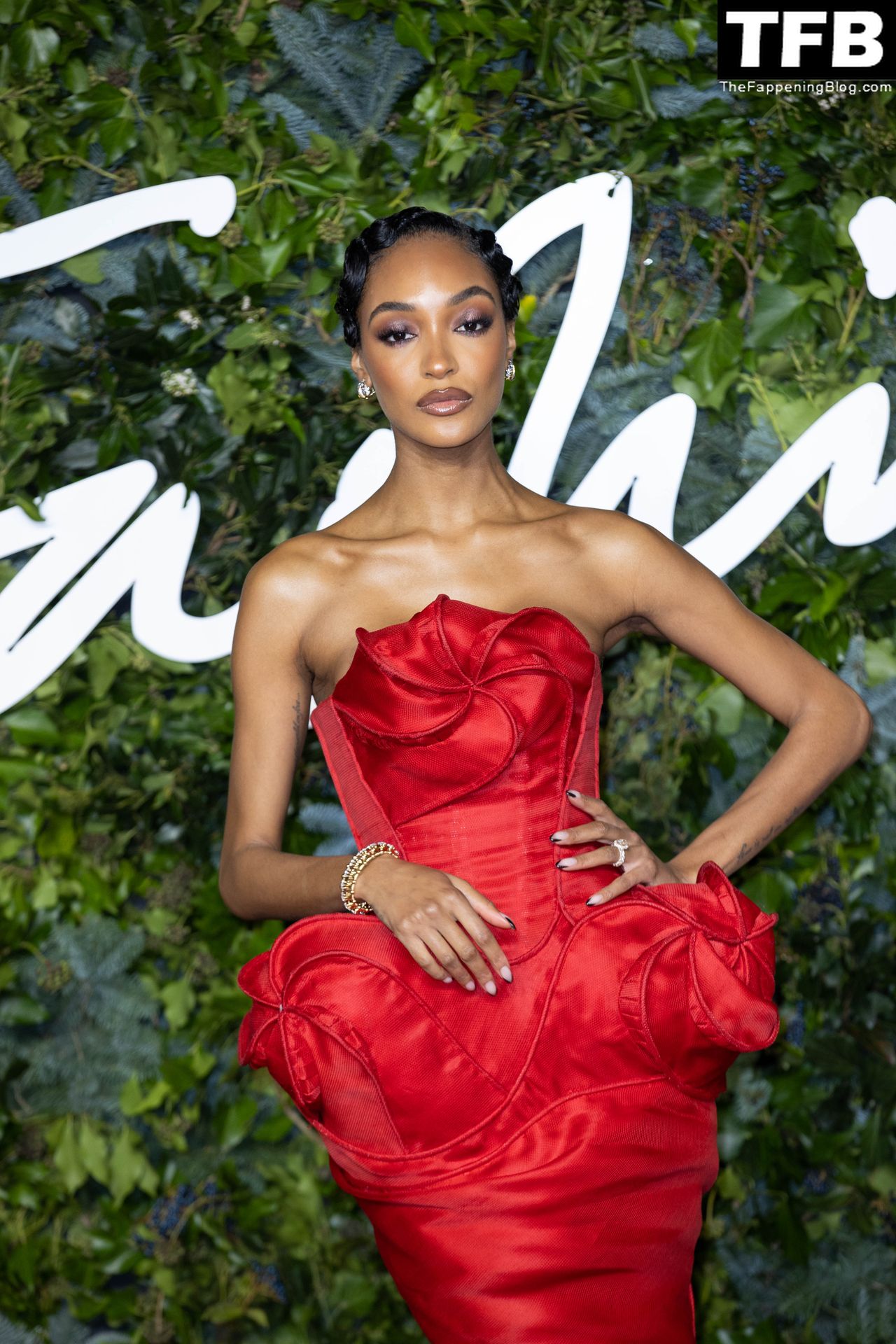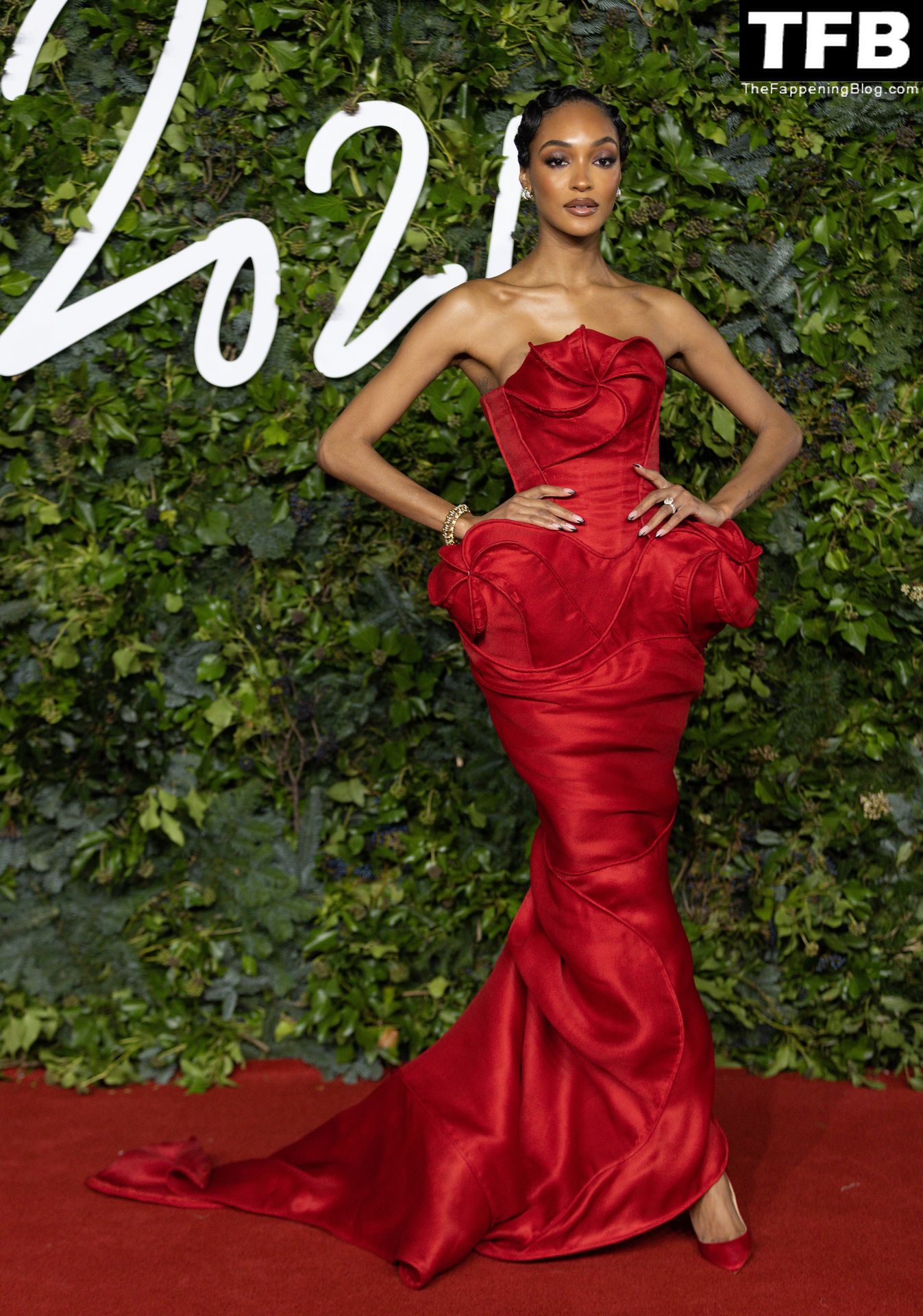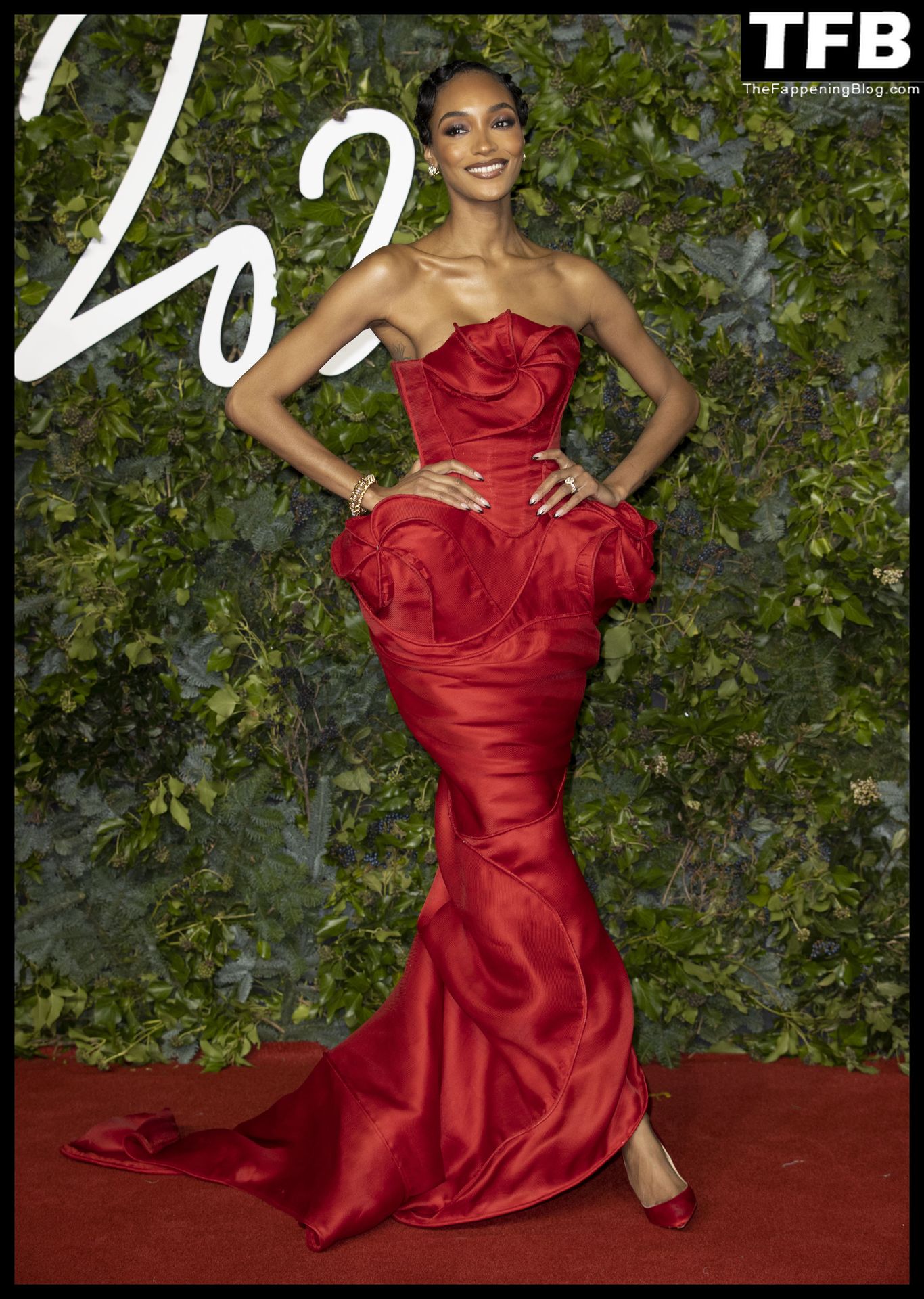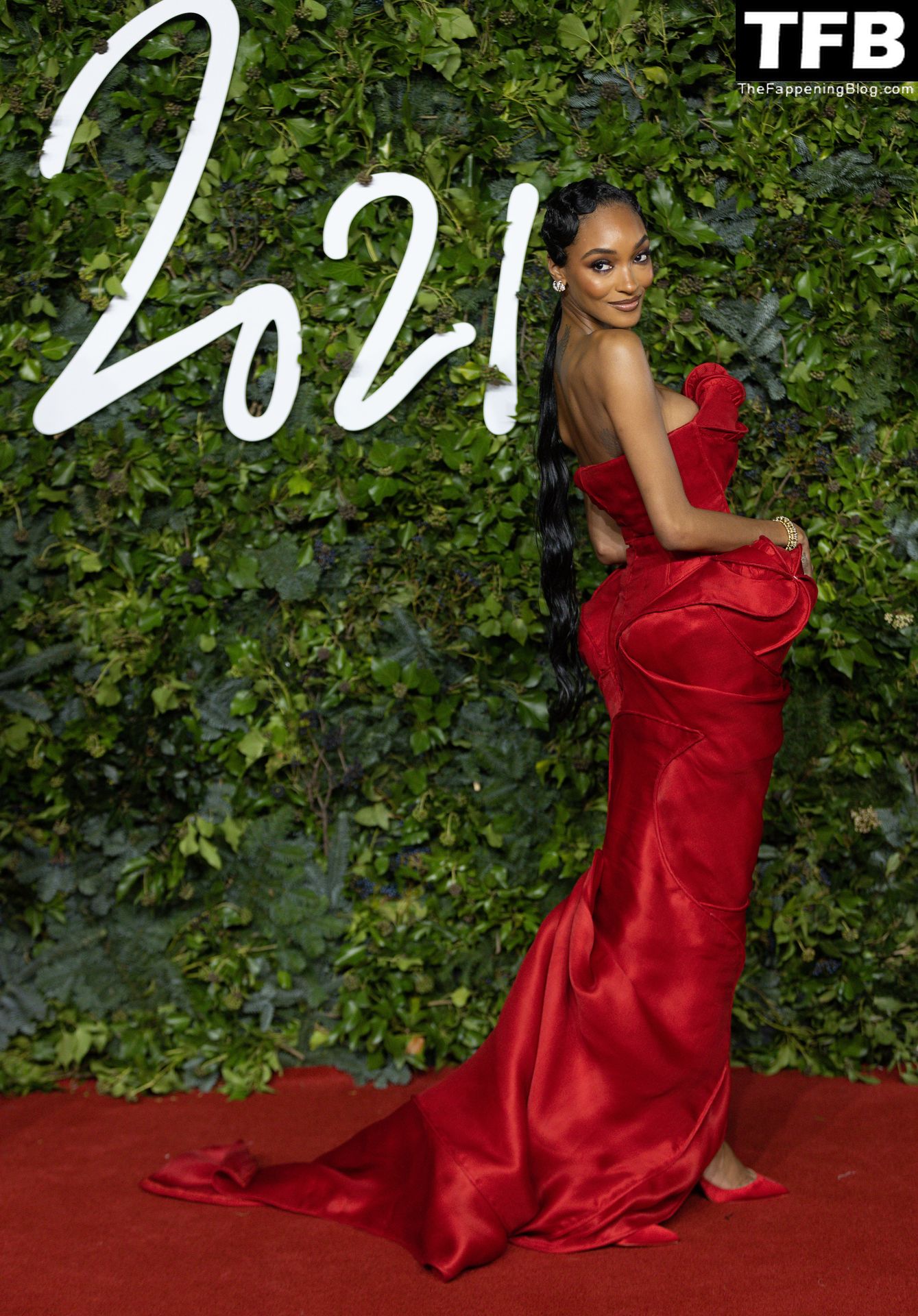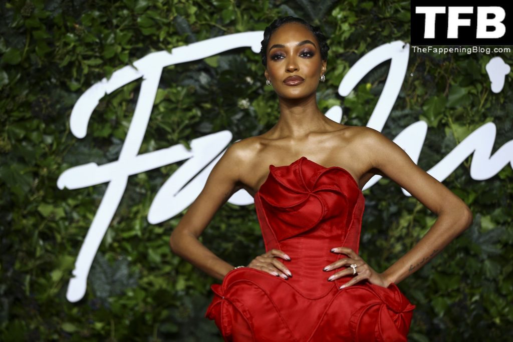 Modella Jourdan Dunn mostra il seno, indossando un vestito rosso mentre partecipa ai Fashion Awards 2021 al Royal Albert Hall di Londra, 29/11/2021.