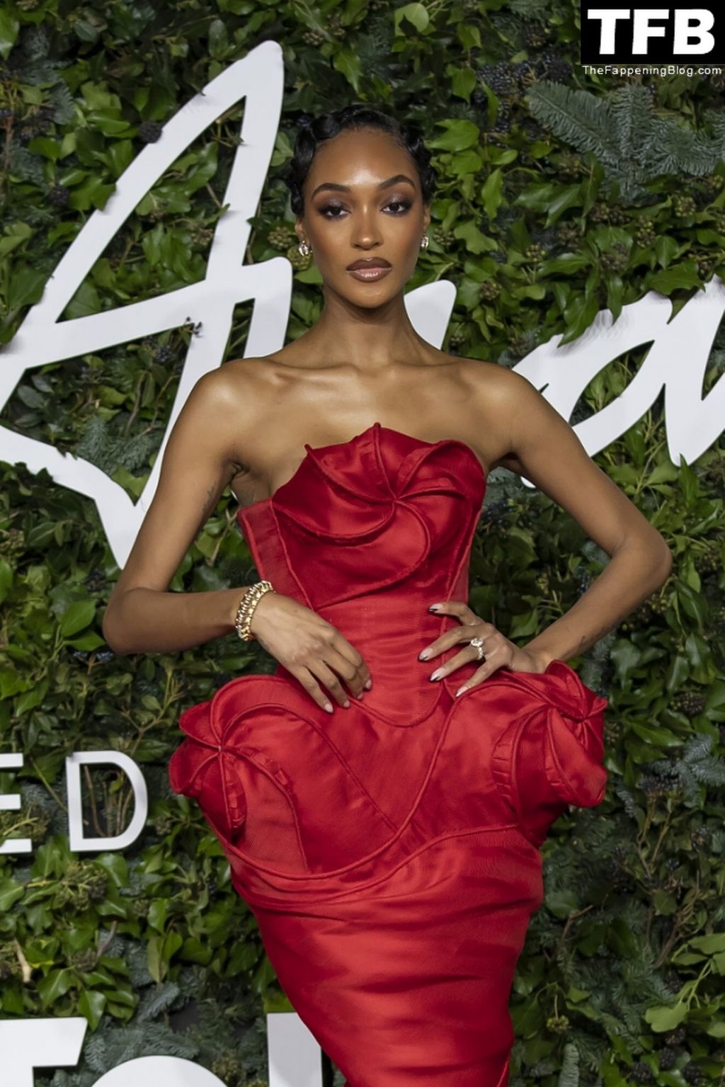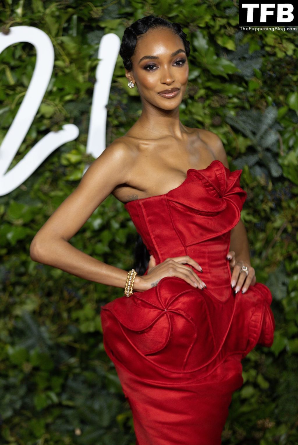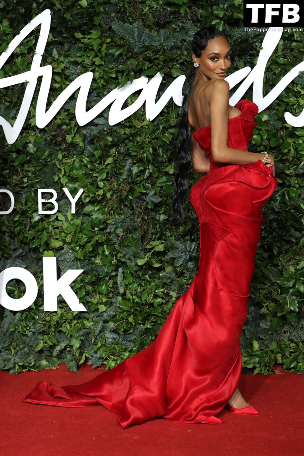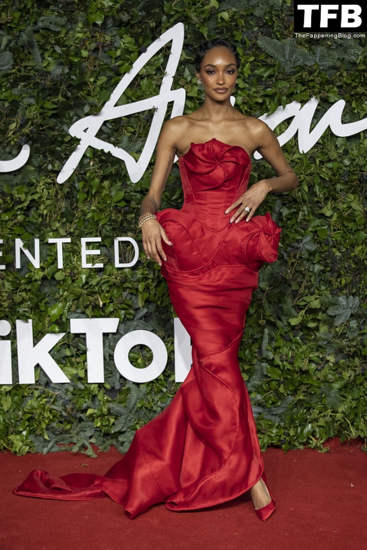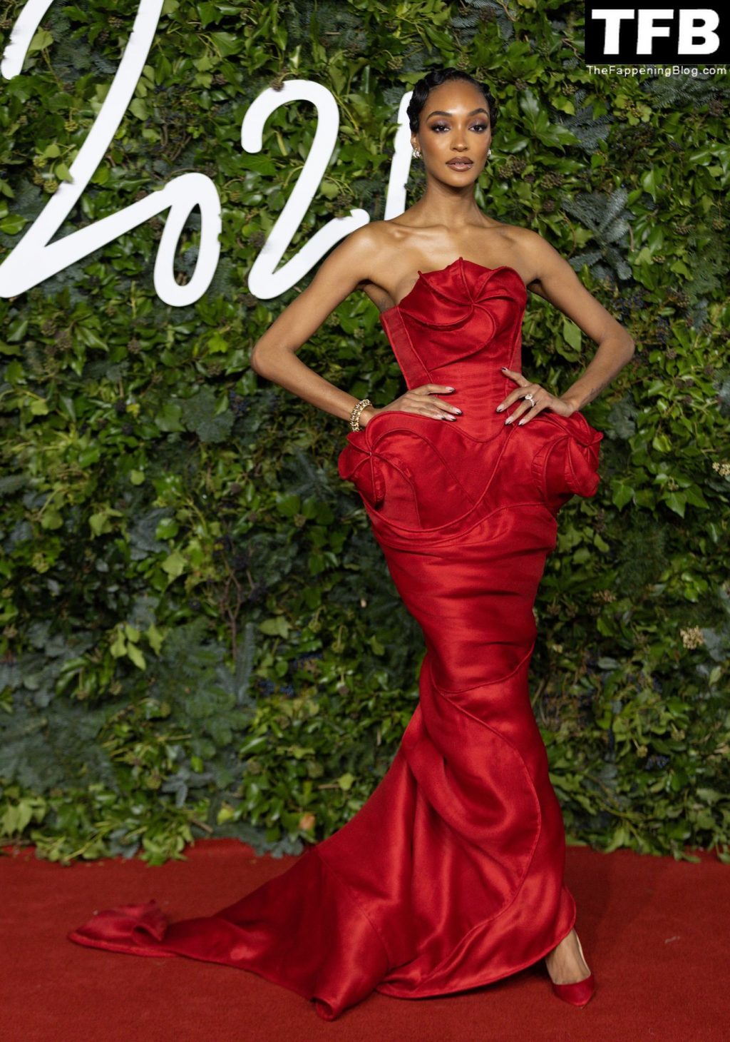Modella Jourdan Dunn mostra il seno, indossando un vestito rosso mentre partecipa ai Fashion Awards 2021 al Royal Albert Hall di Londra, 29/11/2021.