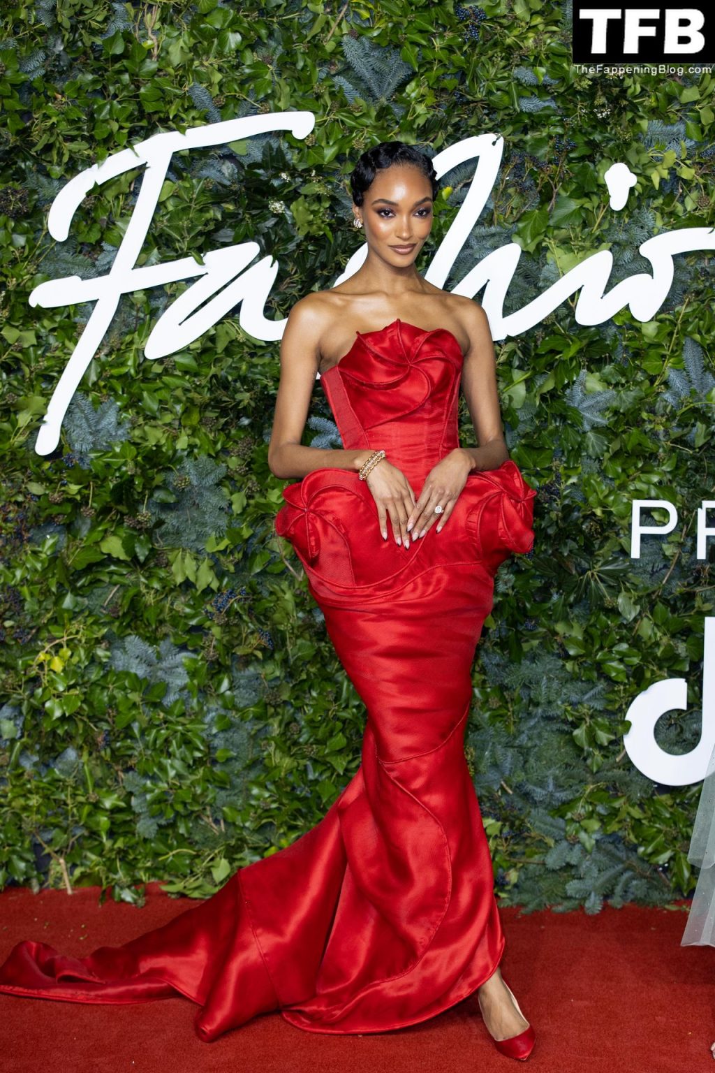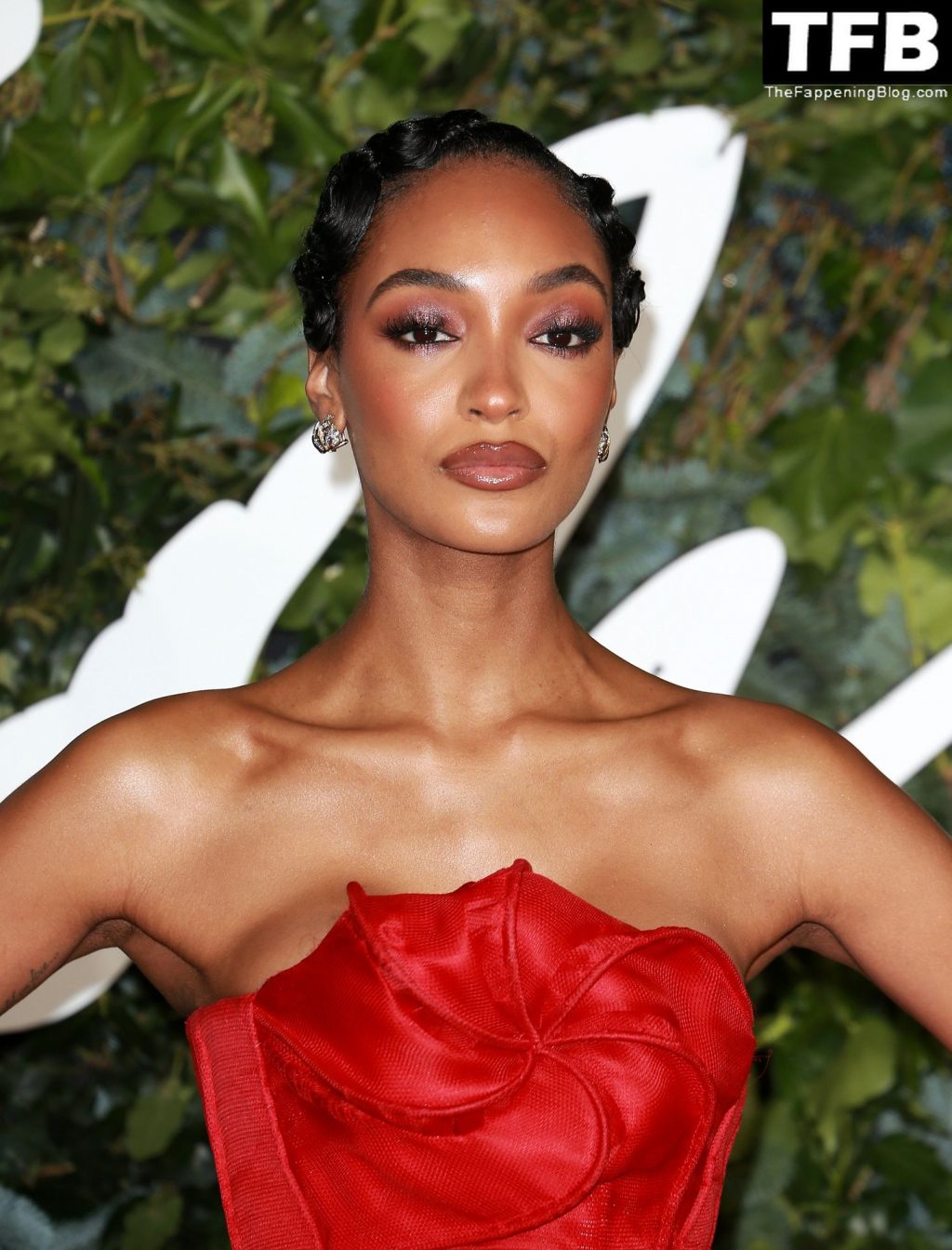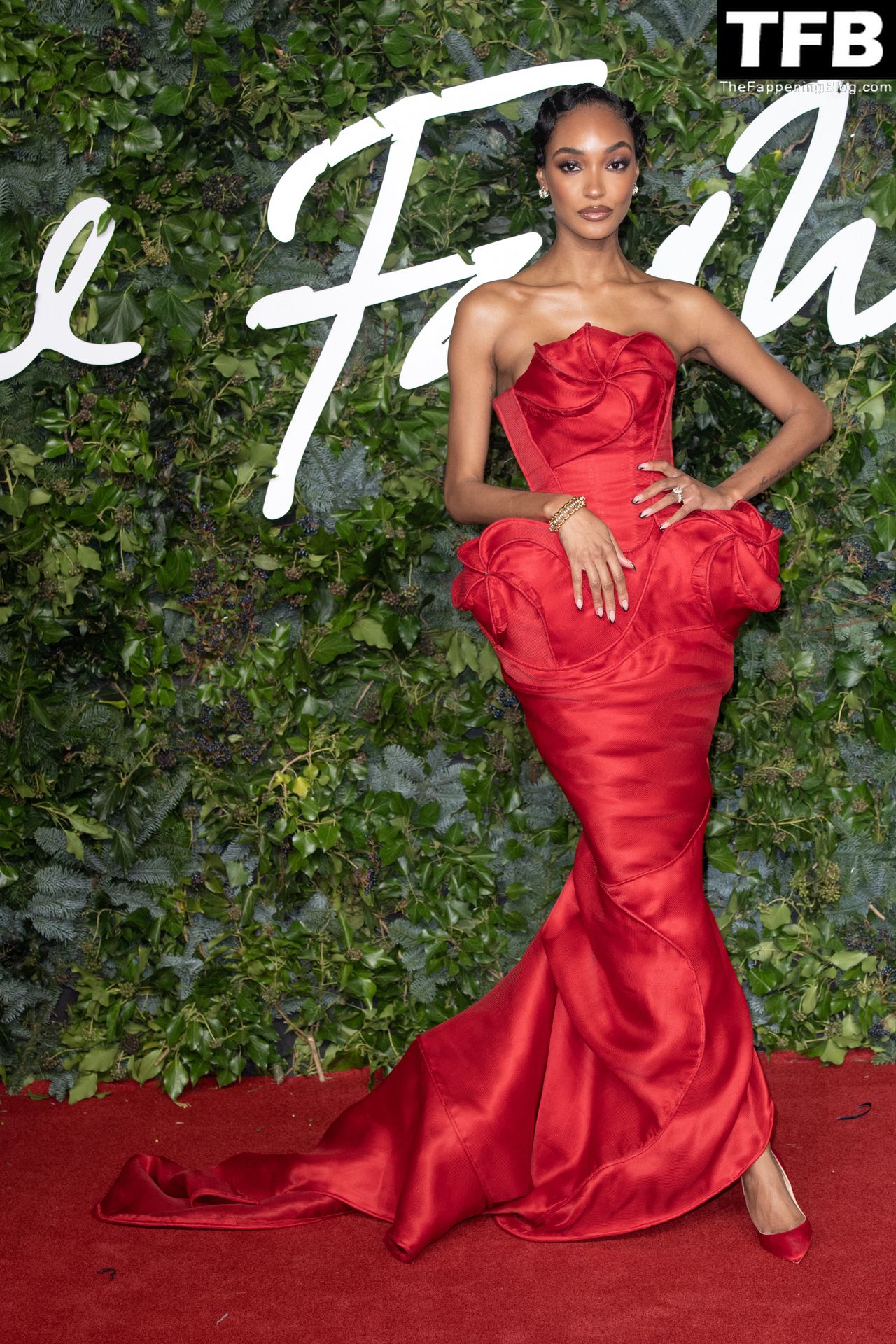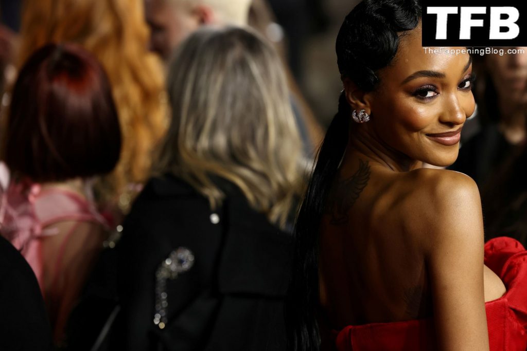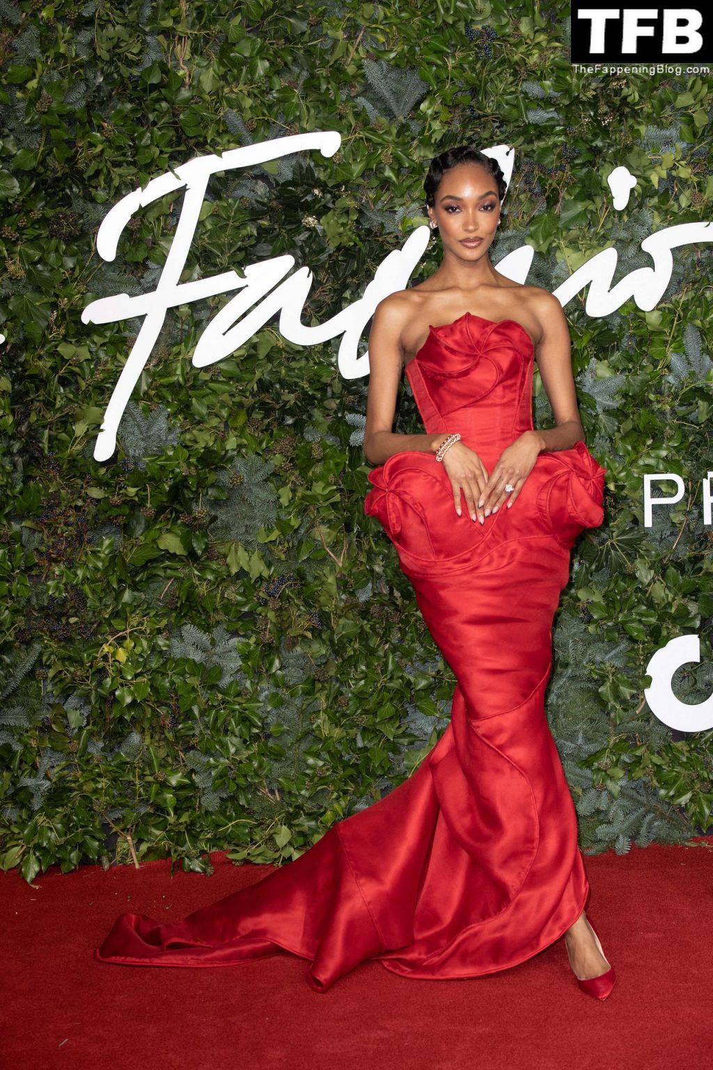 Modella Jourdan Dunn mostra il seno, indossando un vestito rosso mentre partecipa ai Fashion Awards 2021 al Royal Albert Hall di Londra, 29/11/2021.