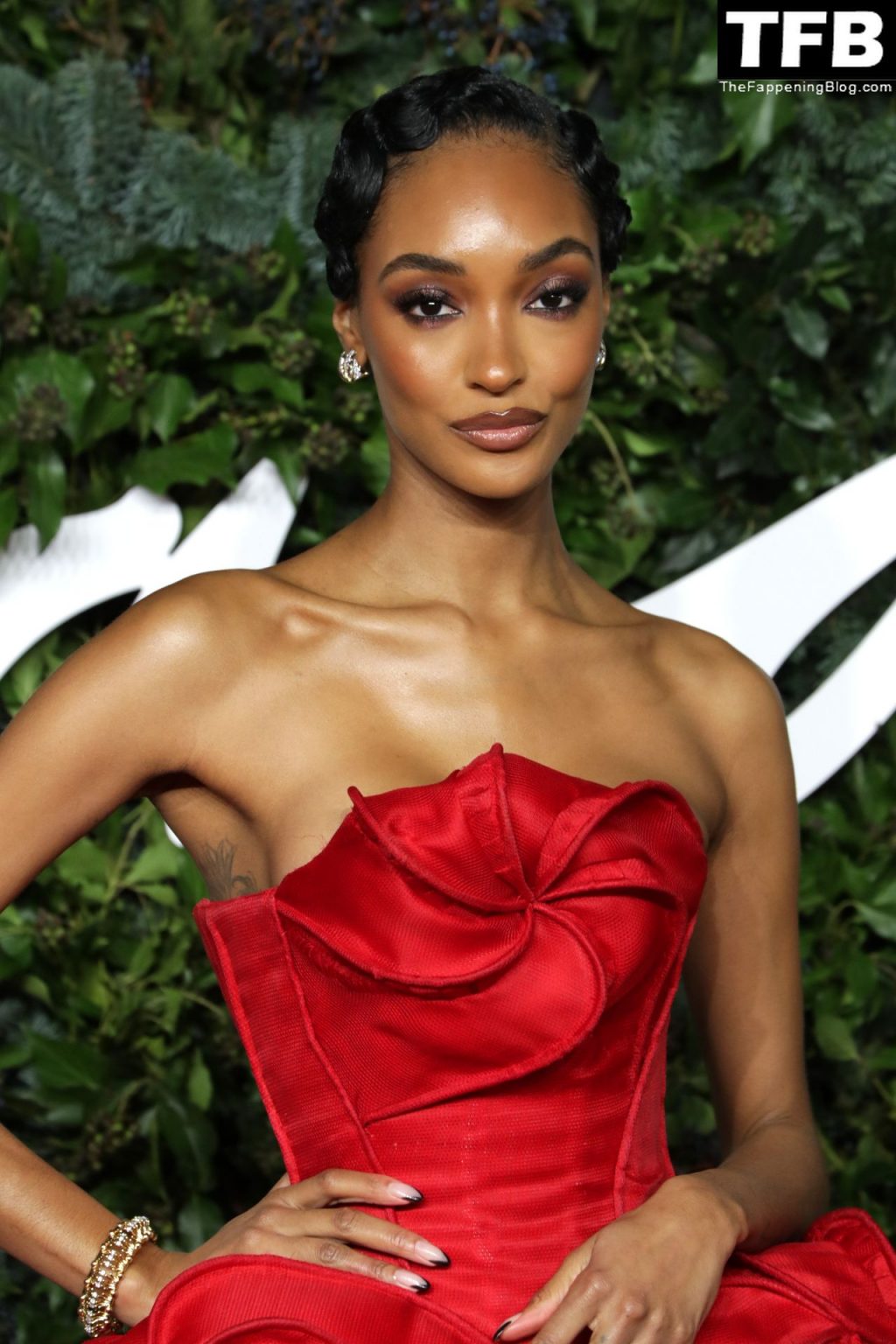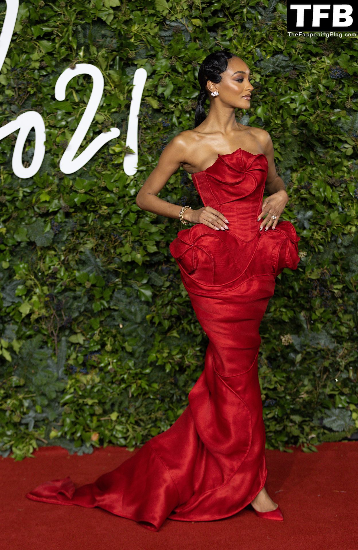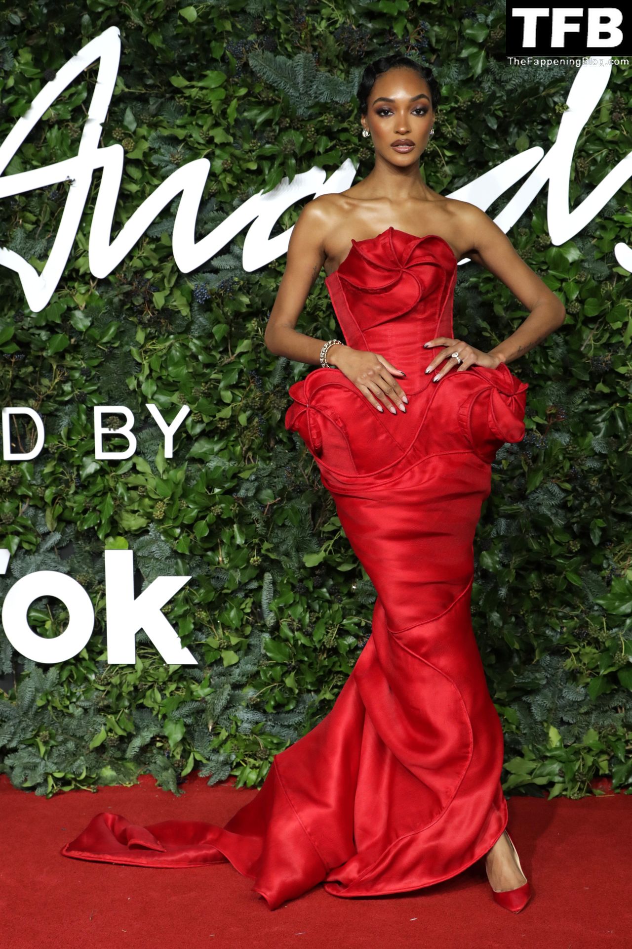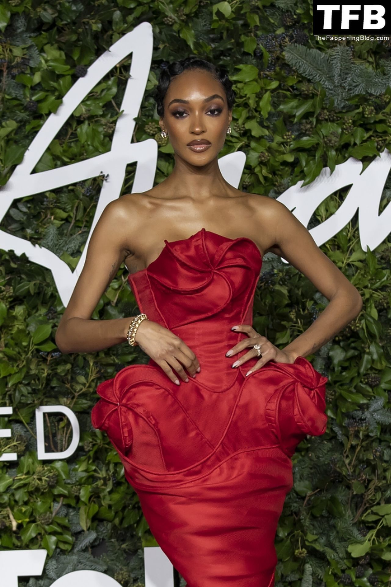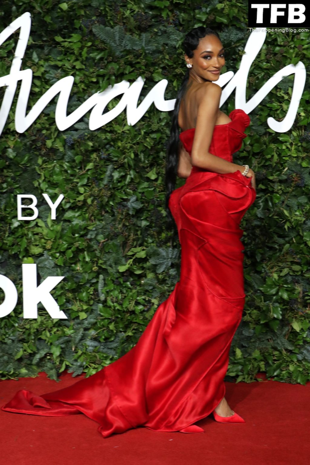 Modella Jourdan Dunn mostra il seno, indossando un vestito rosso mentre partecipa ai Fashion Awards 2021 al Royal Albert Hall di Londra, 29/11/2021.