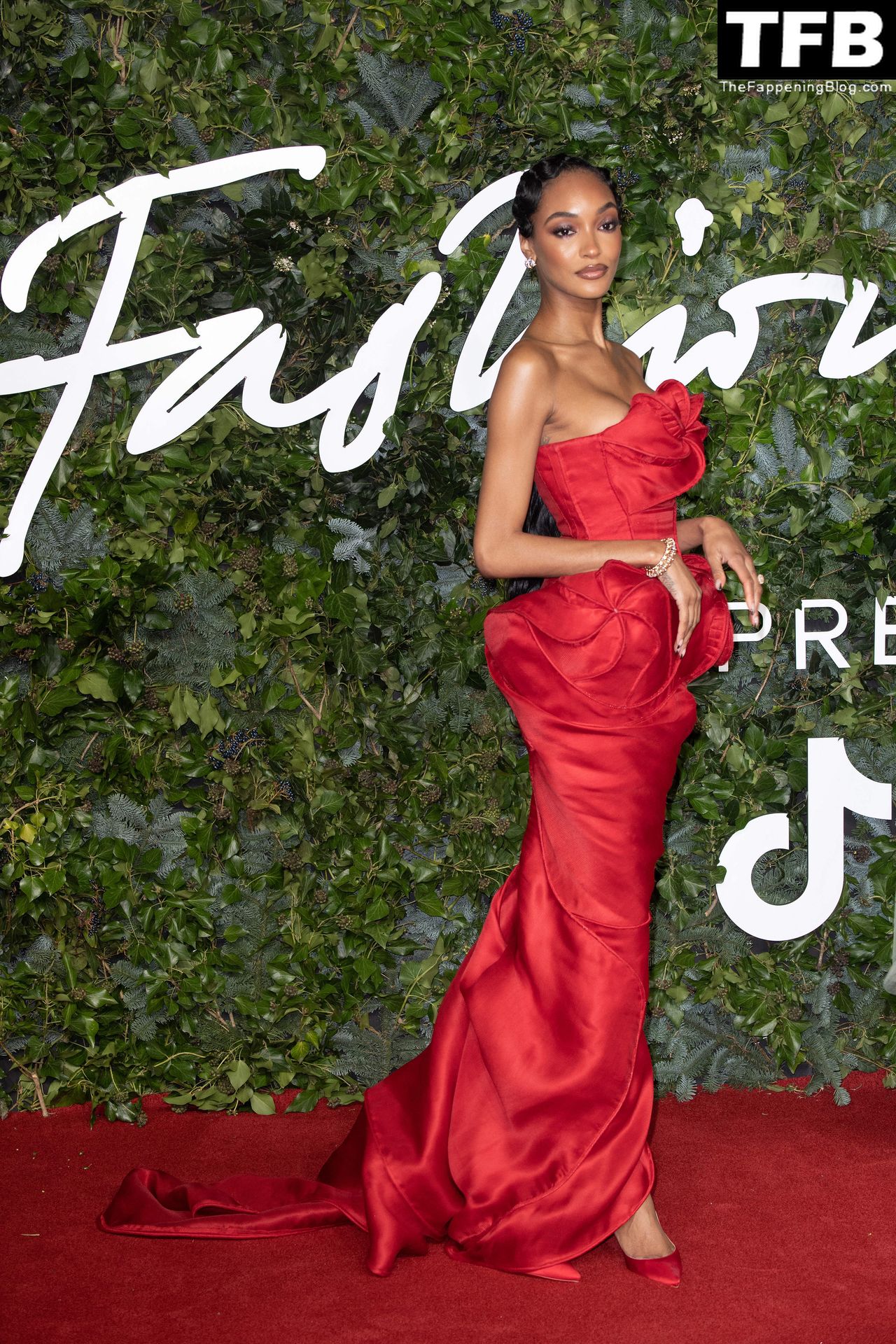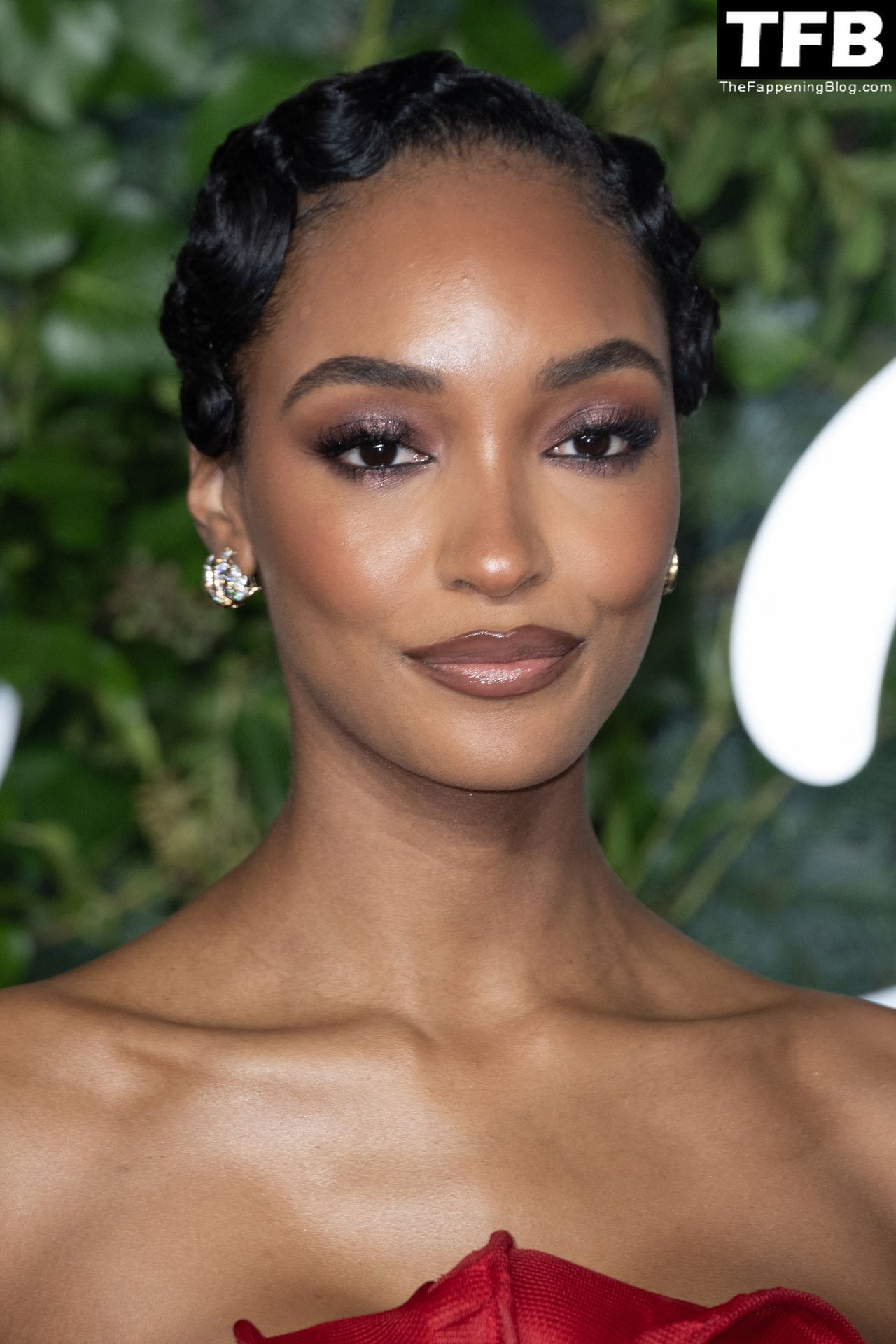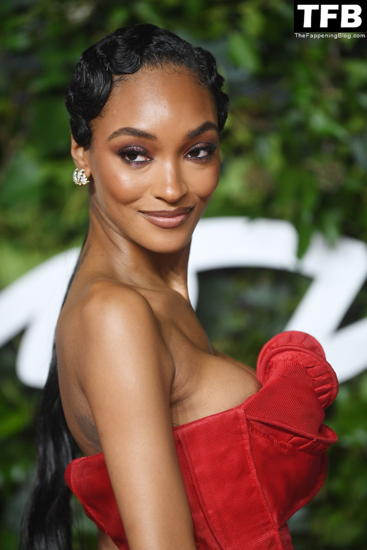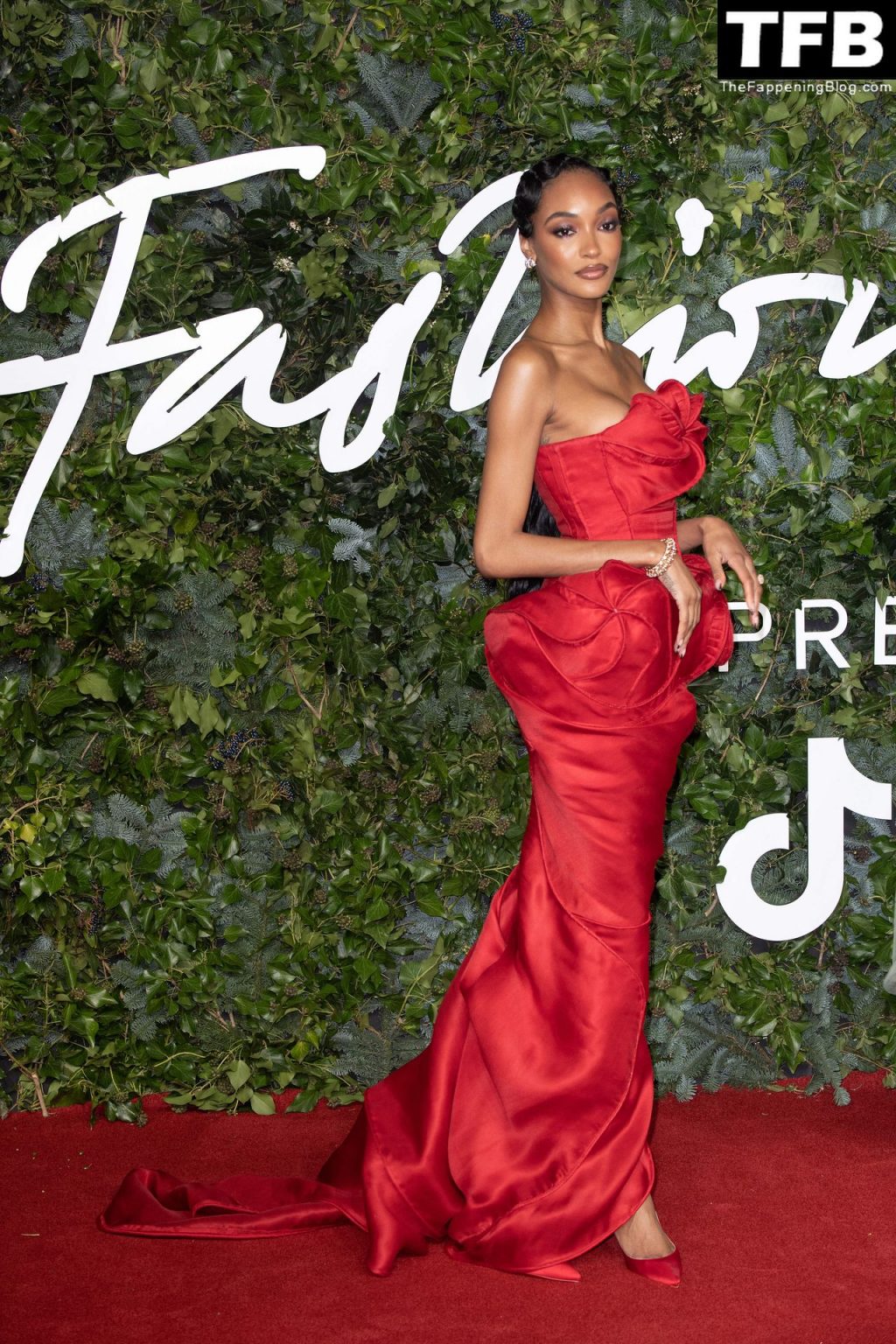 Modella Jourdan Dunn mostra il seno, indossando un vestito rosso mentre partecipa ai Fashion Awards 2021 al Royal Albert Hall di Londra, 29/11/2021.