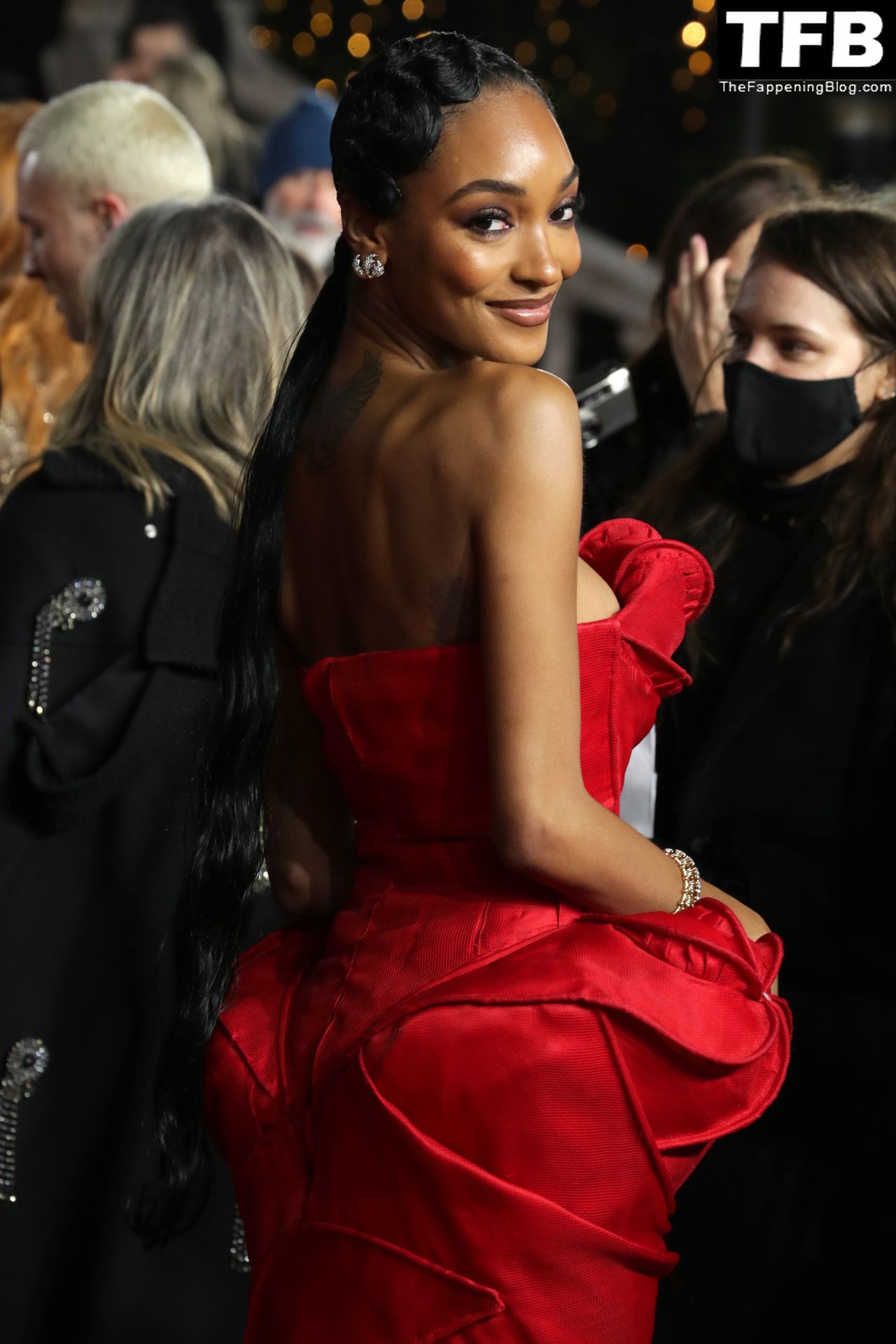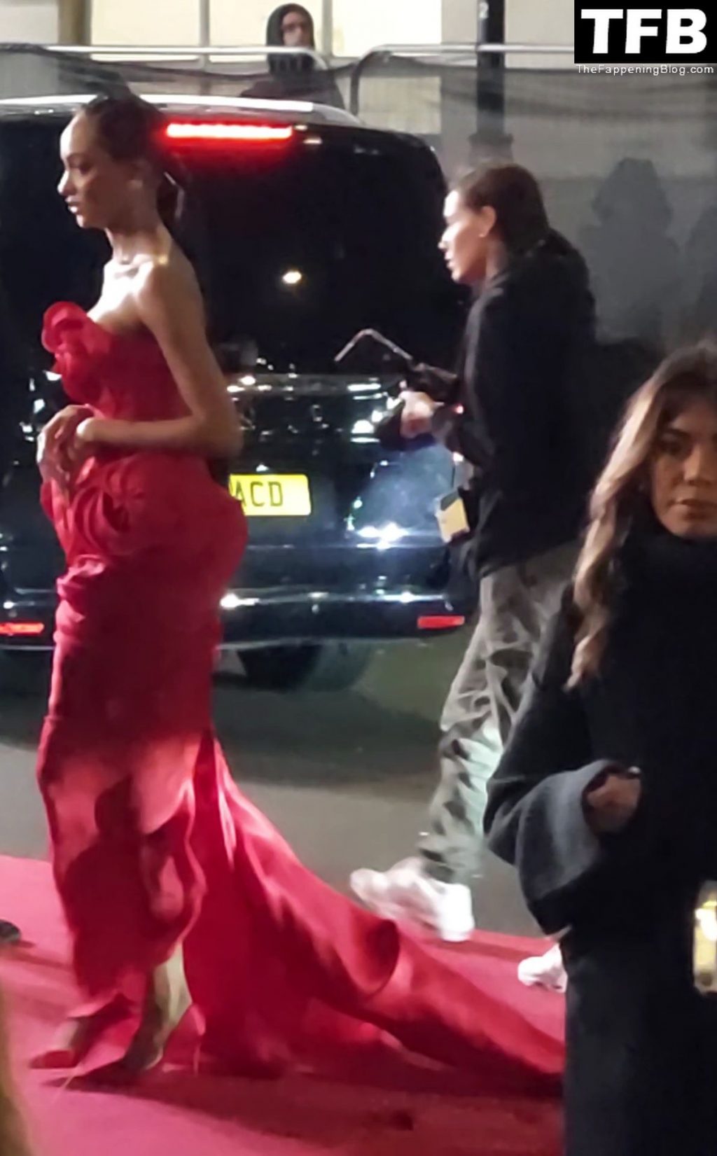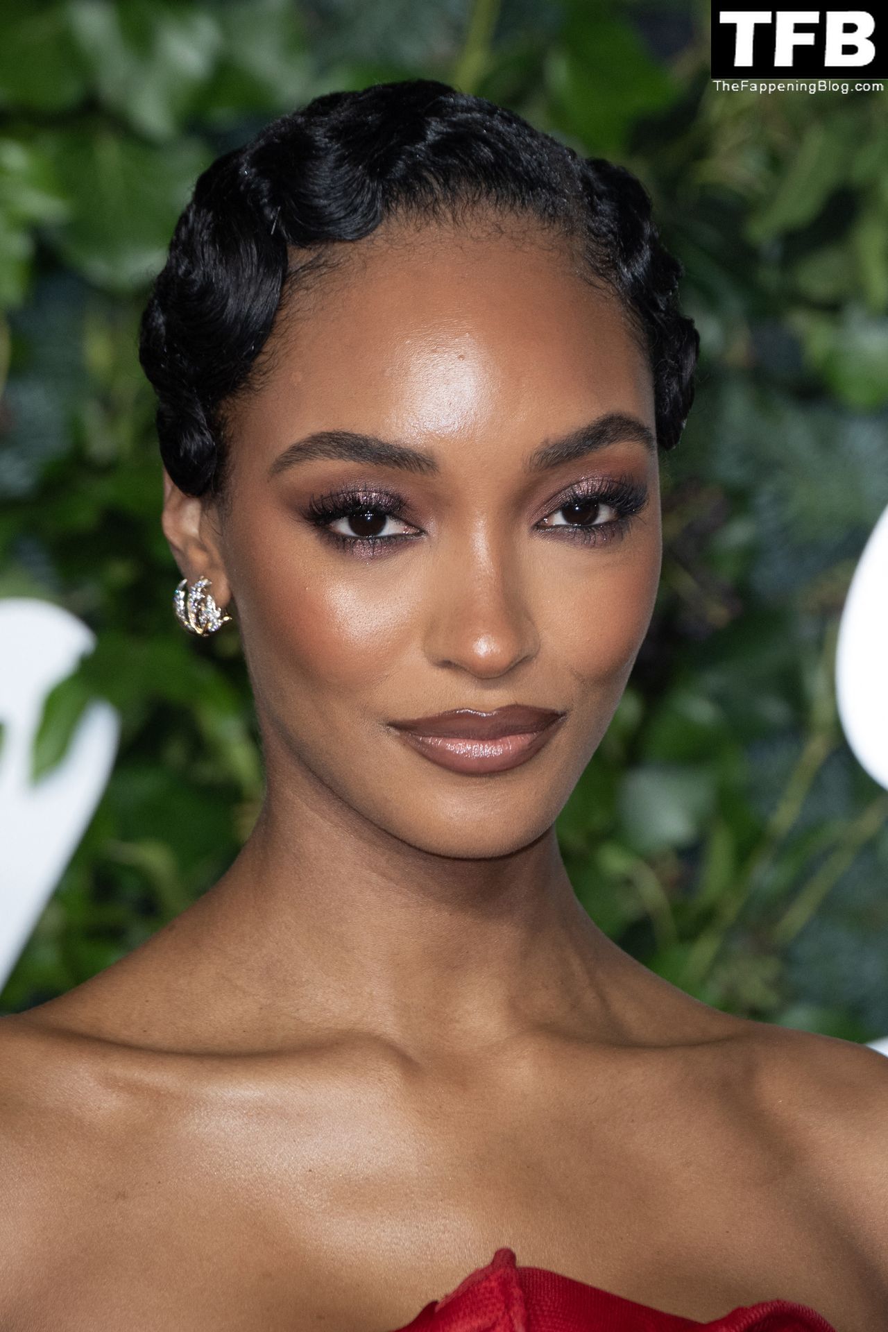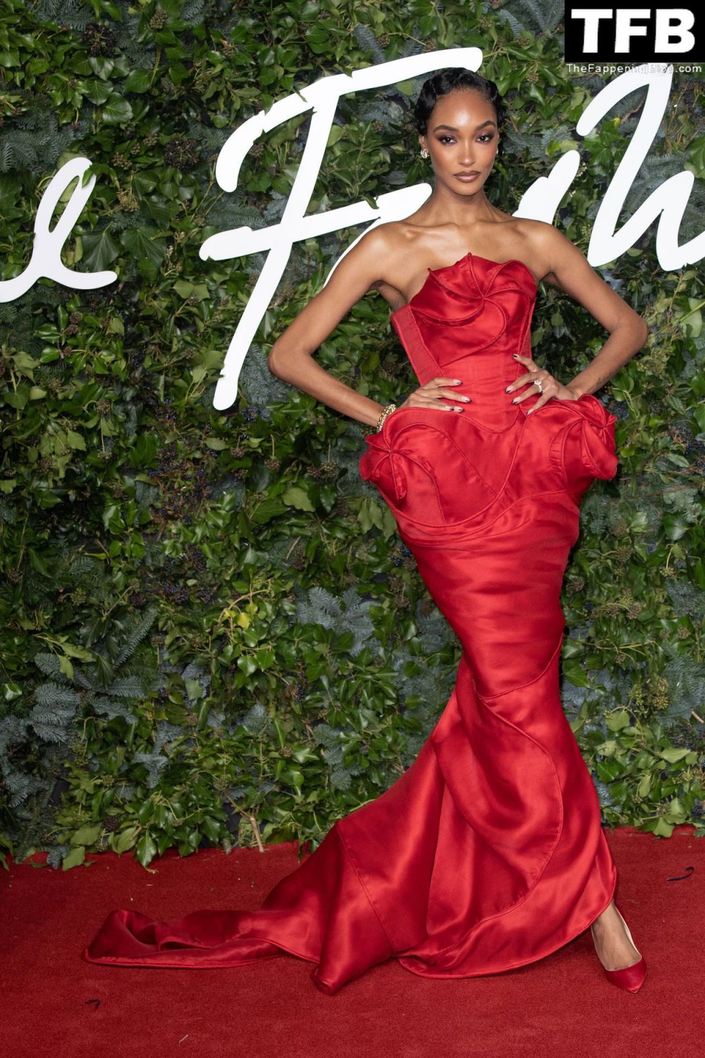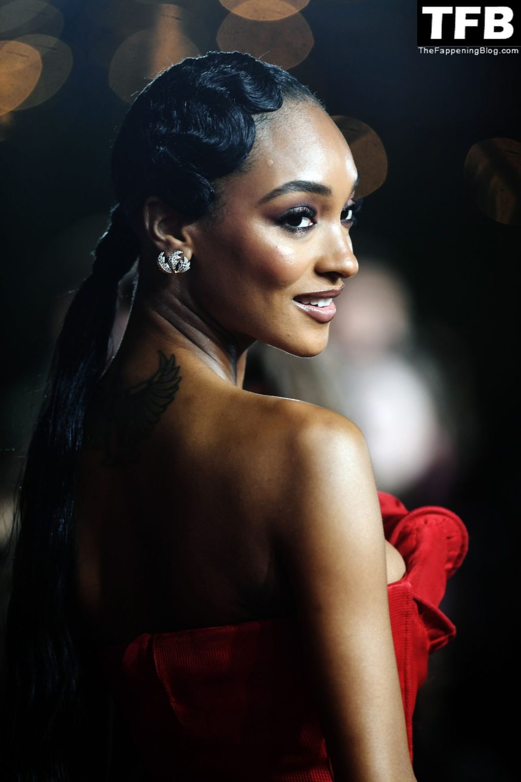 Modella Jourdan Dunn mostra il seno, indossando un vestito rosso mentre partecipa ai Fashion Awards 2021 al Royal Albert Hall di Londra, 29/11/2021.