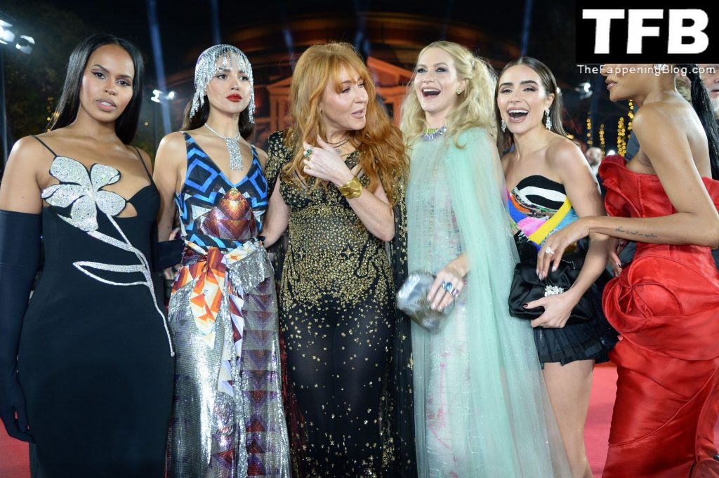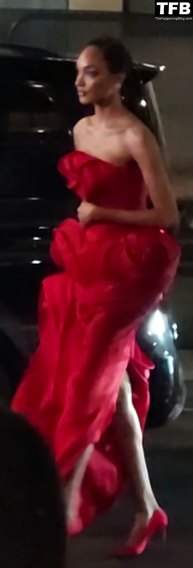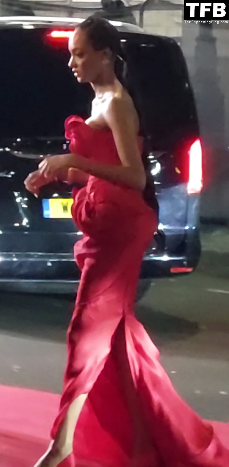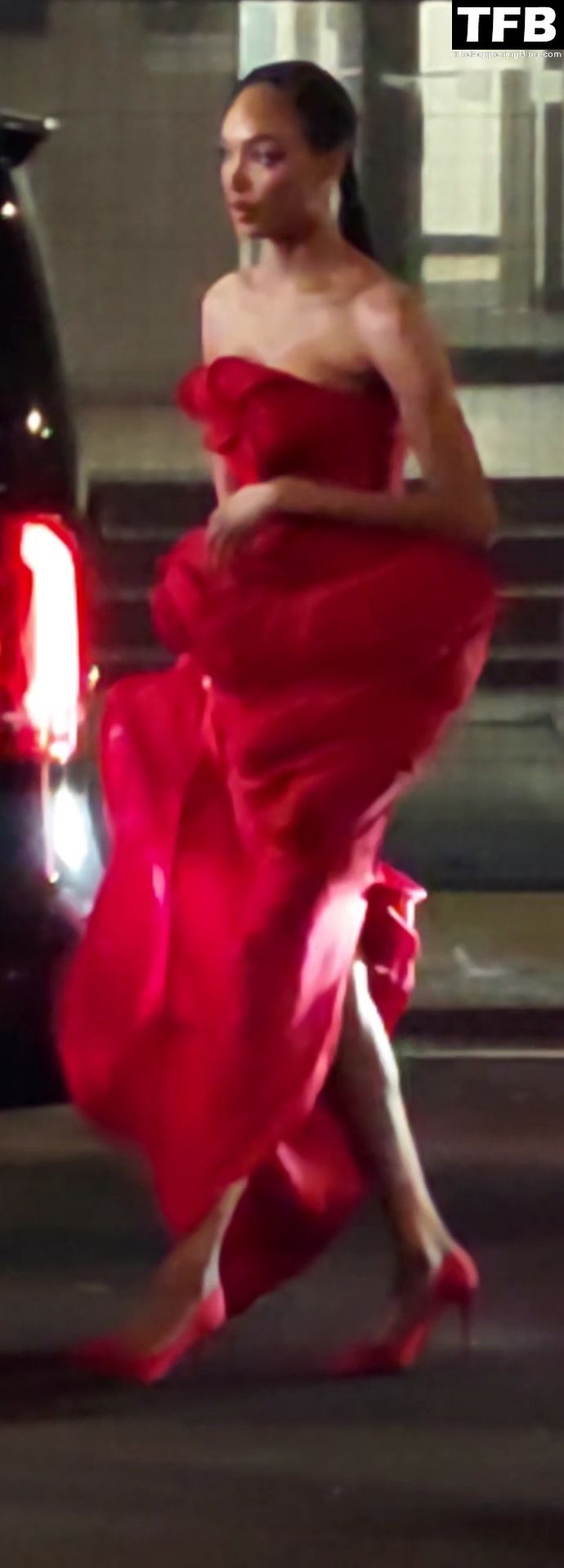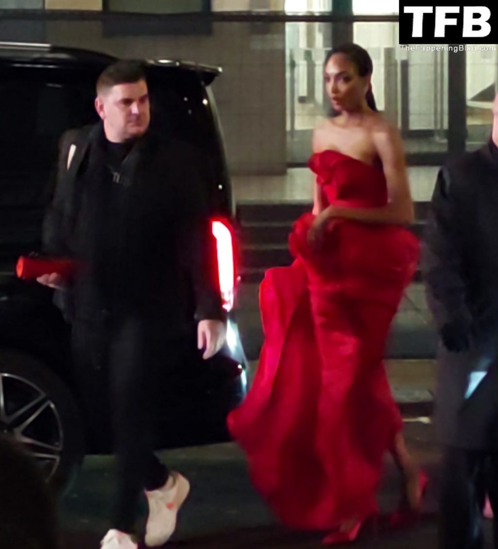 Modella Jourdan Dunn mostra il seno, indossando un vestito rosso mentre partecipa ai Fashion Awards 2021 al Royal Albert Hall di Londra, 29/11/2021.