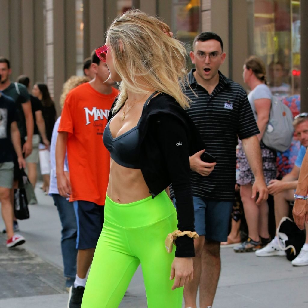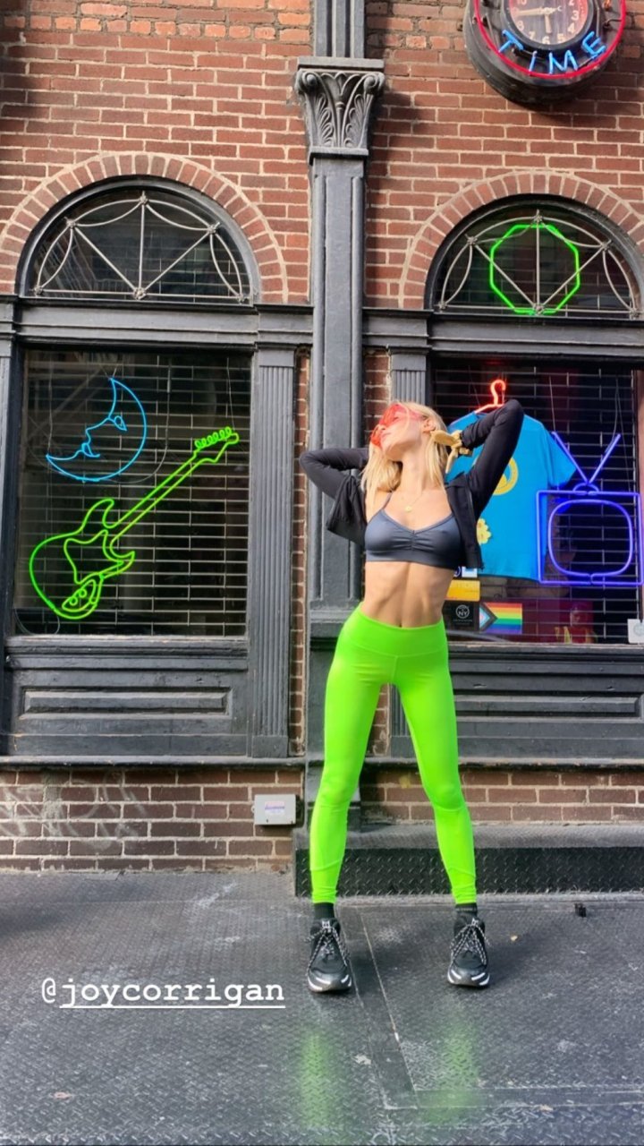Modella Joy Corrigan, indossando collant verde neon e reggiseno nero, sorprende i pedoni durante un servizio fotografico improvvisato a Soho, New York City, 31/08/2019.