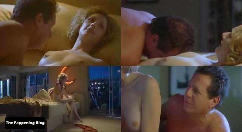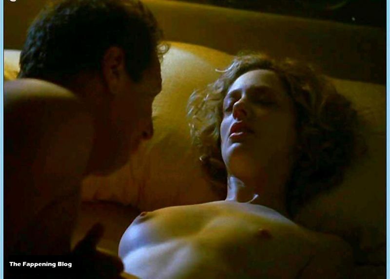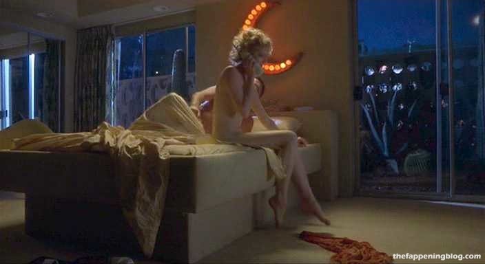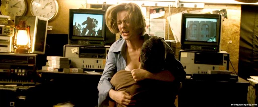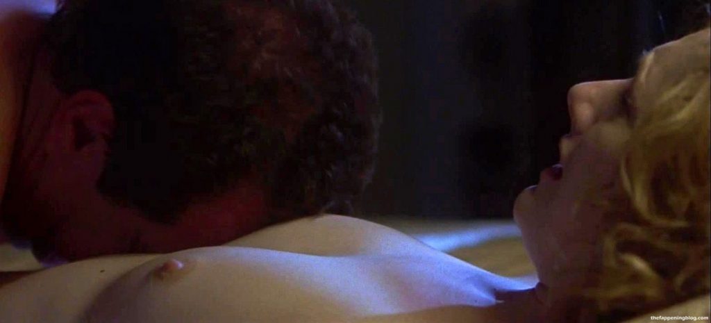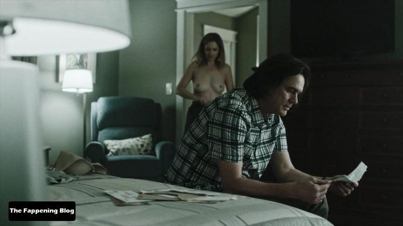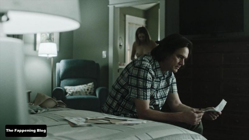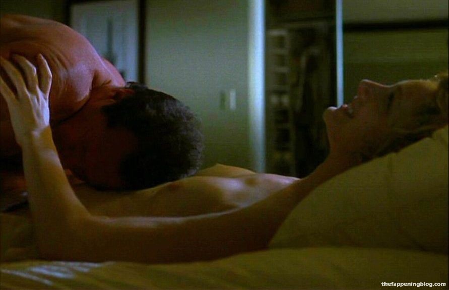 Then, we see her undressing, stripping down to sexy lingerie, and showing boobs as she climbs into the bed with Hank.