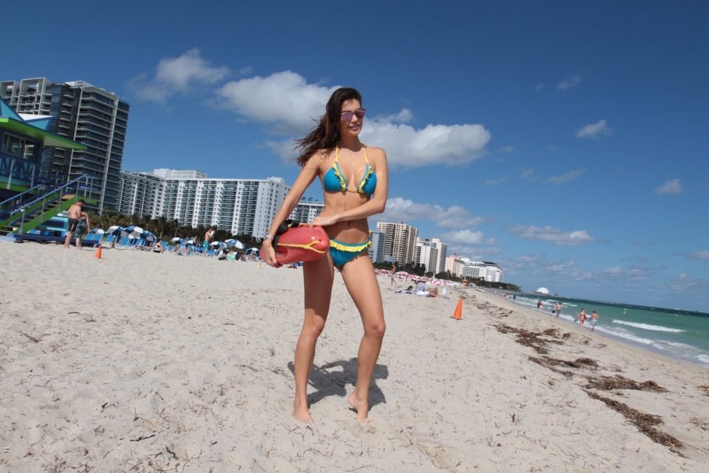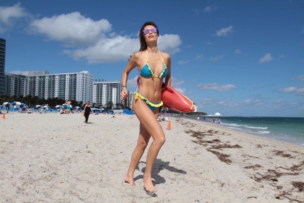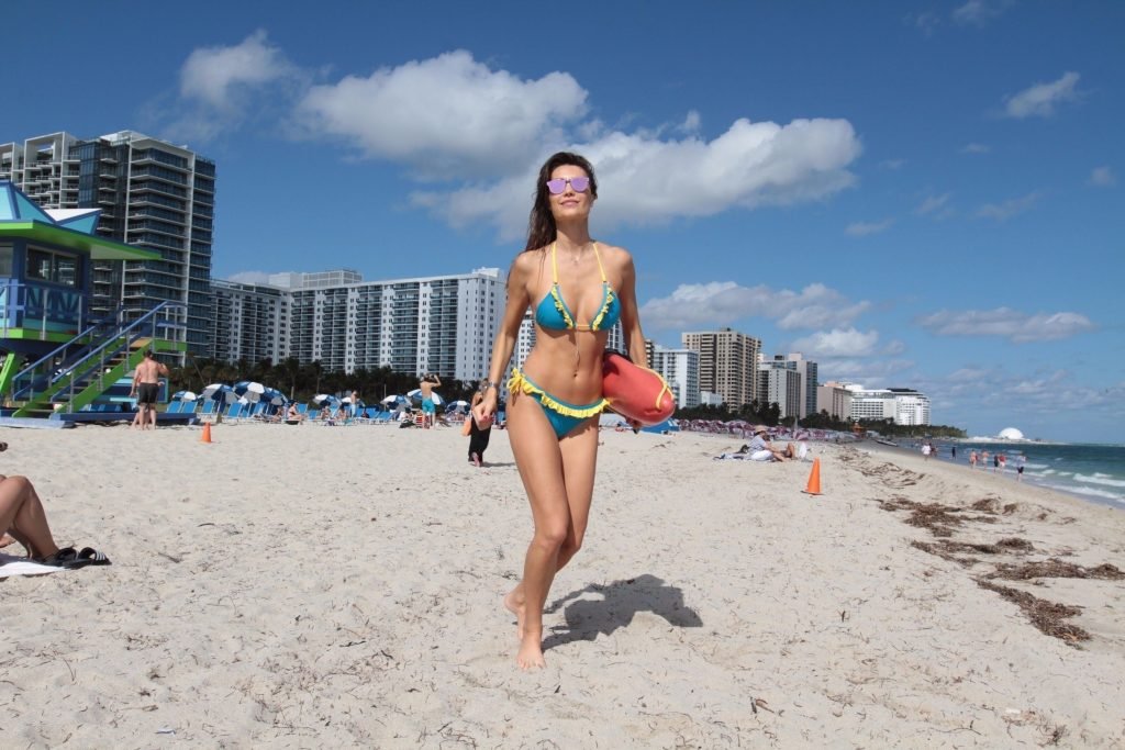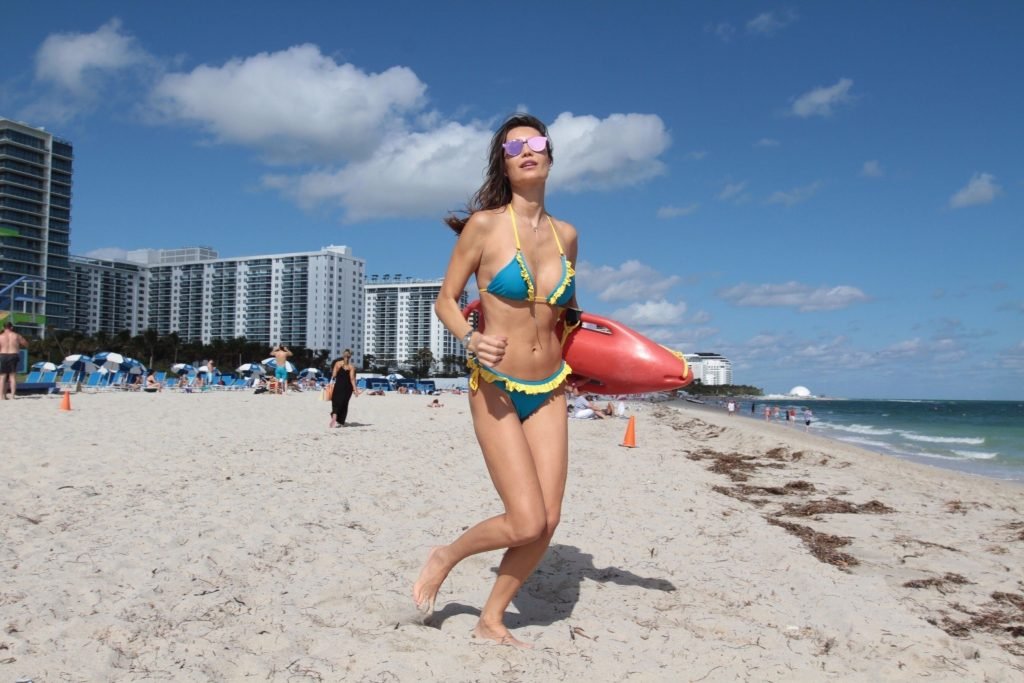 Modella e stilista di costumi da bagno Julia Pereira (30) mostra il suo corpo in bikini sulla spiaggia di Miami, 12/02/2017.