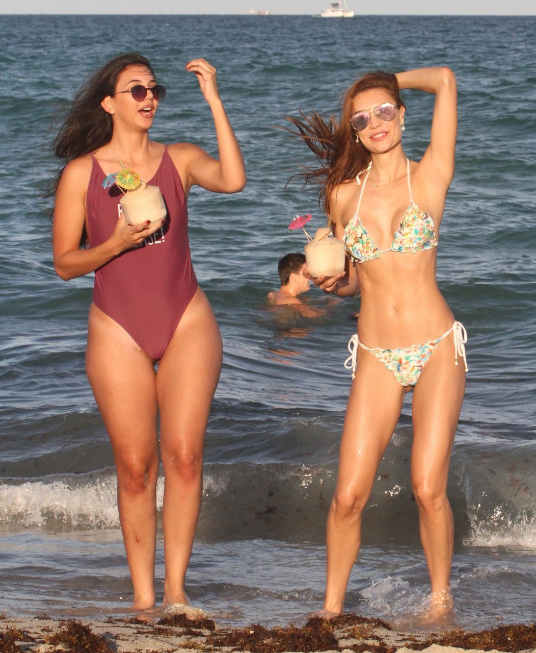 Supermodella Julia Pereira indossa un bikini con nastro viola e non solo dalla sua collezione sulla spiaggia di Miami Beach, 03/04/2019, Julia’s Beachwear. Julia ora sta disegnando la sua linea di bikini prodotti in Brasile e venduti in tutto il mondo.