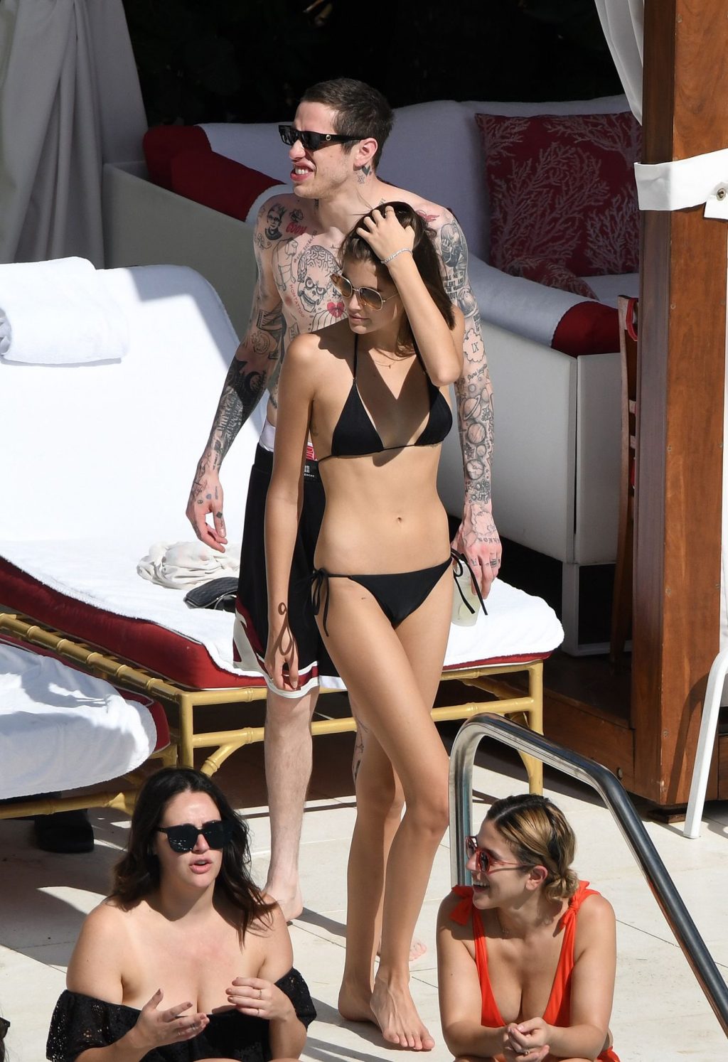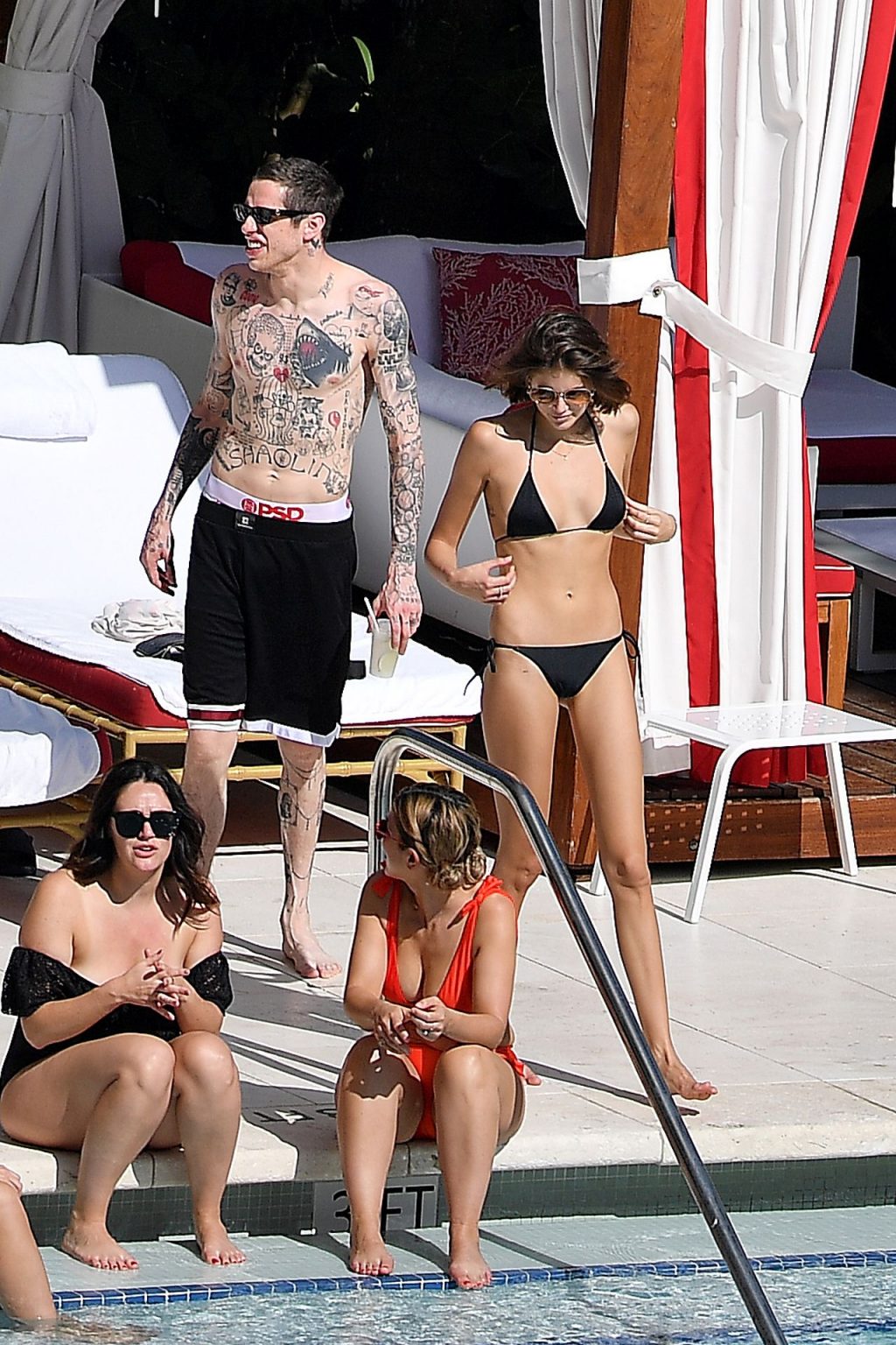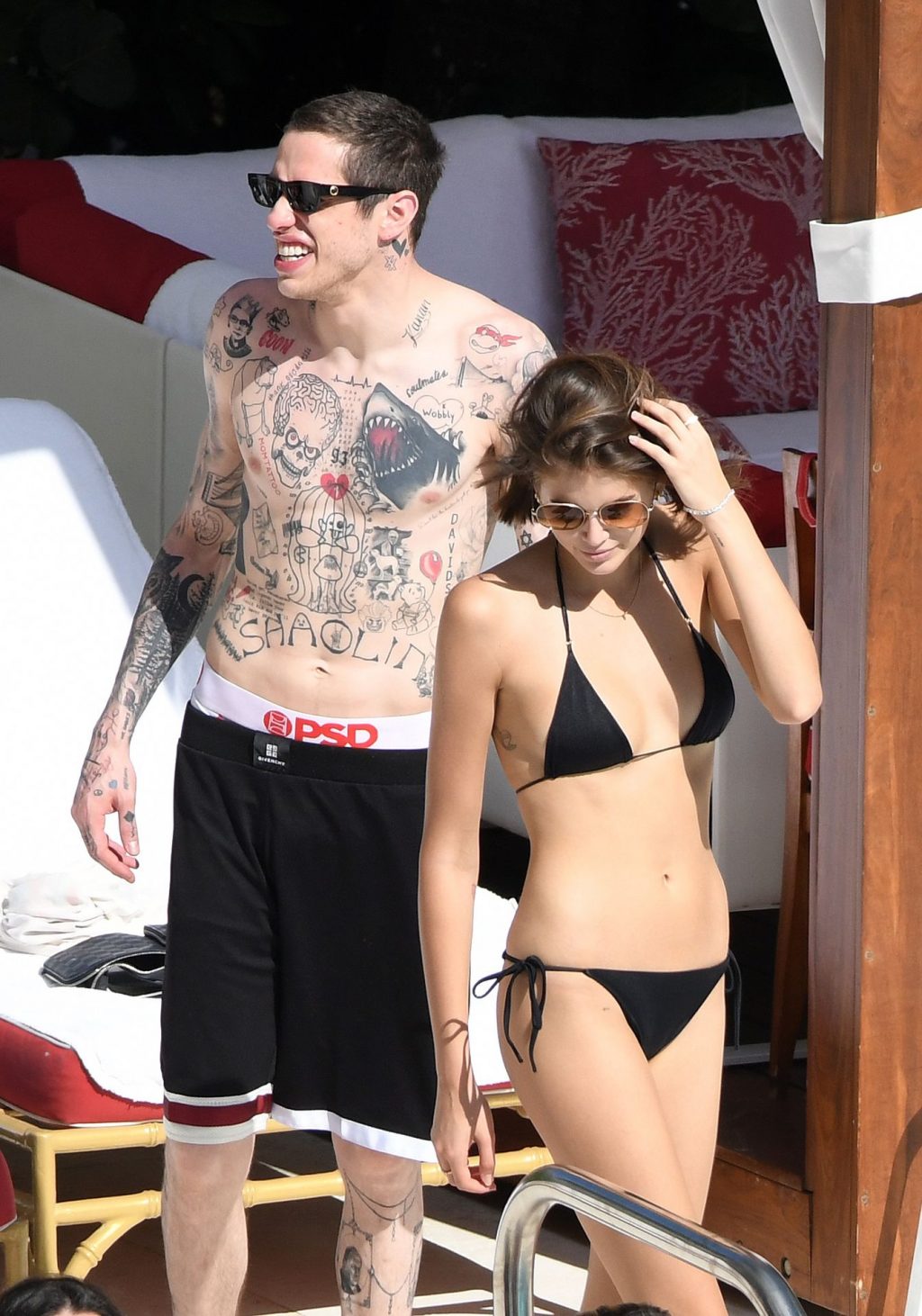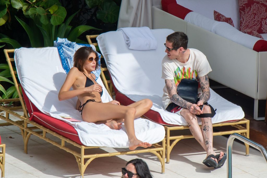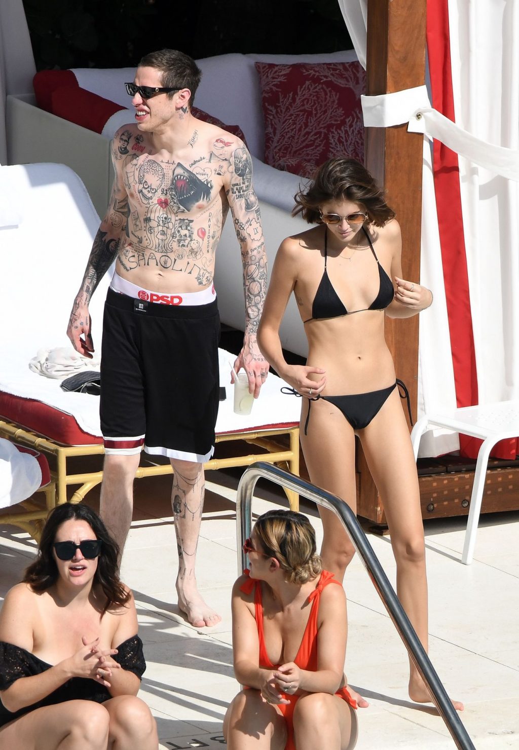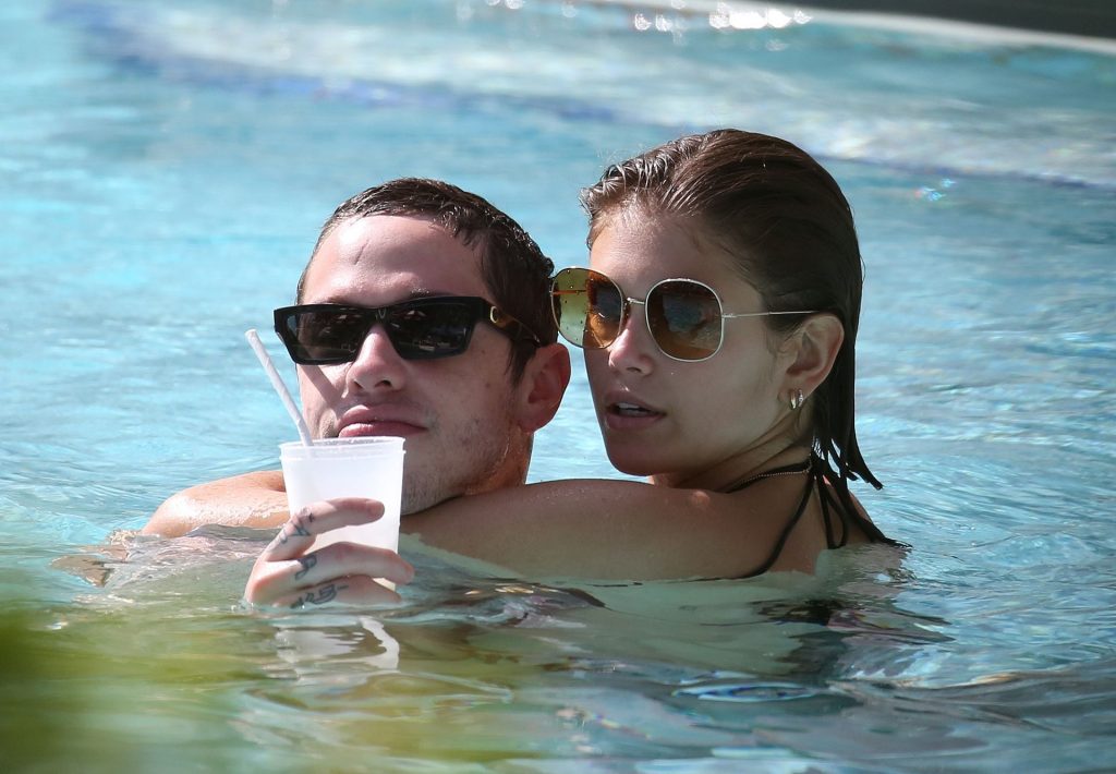 La figlia di Cindy Crawford, la modella Kaia Gerber, indossa un bikini nero mentre bacia il fidanzato Pete Davidson a bordo piscina a Miami, 23/11/2019.