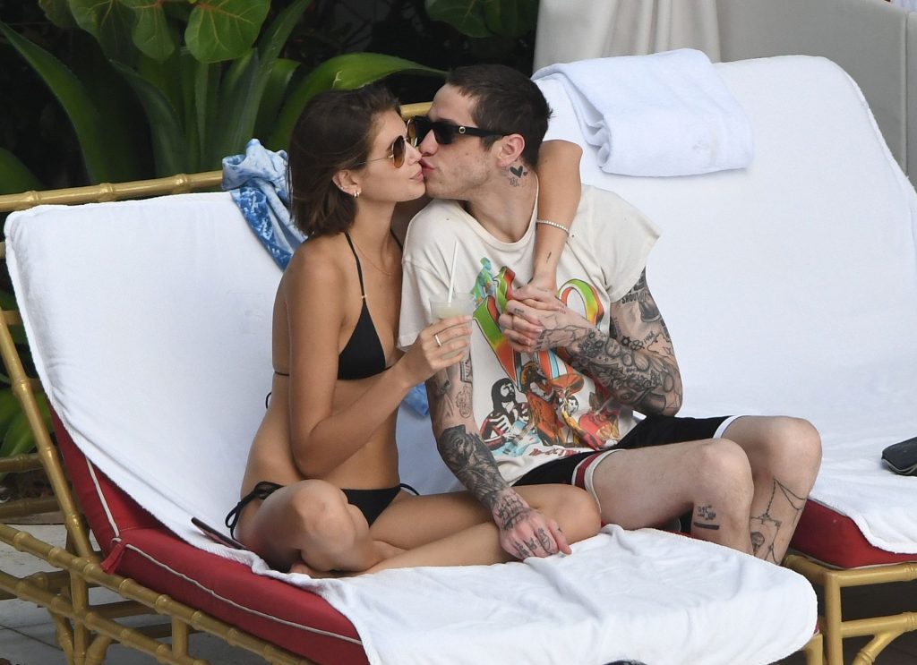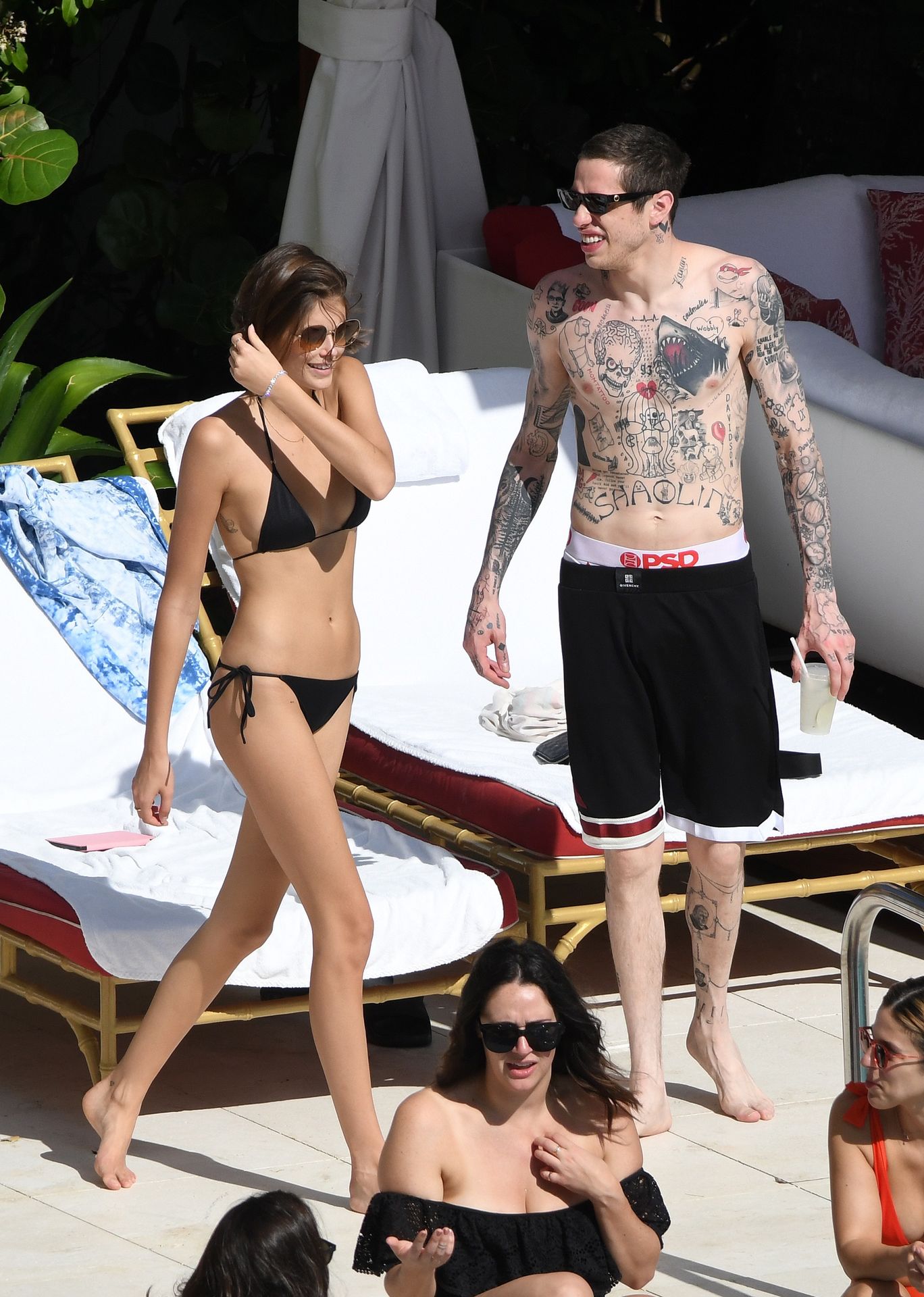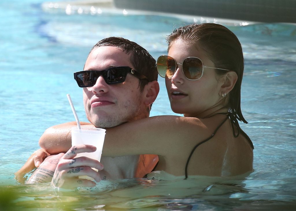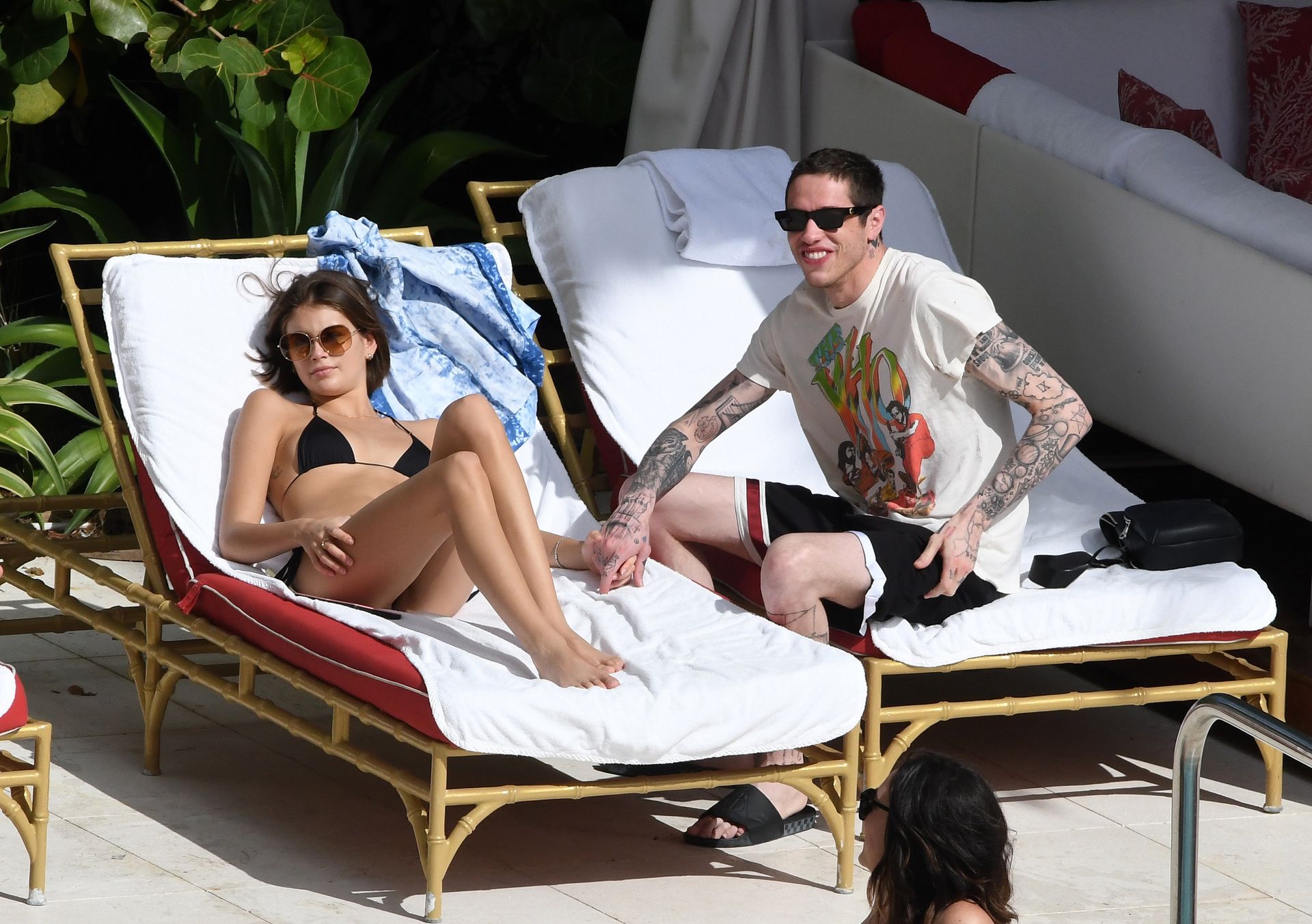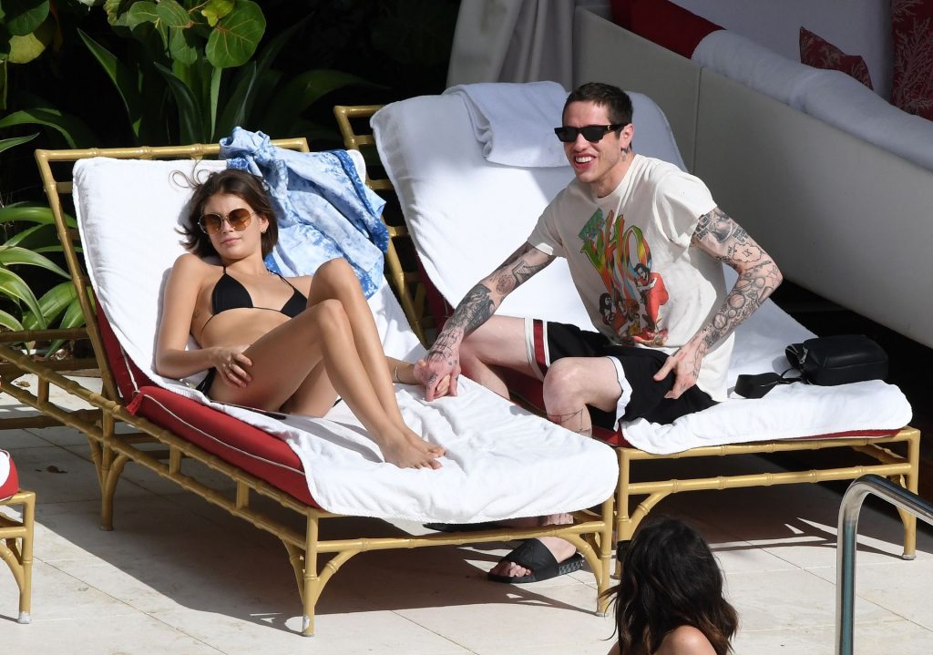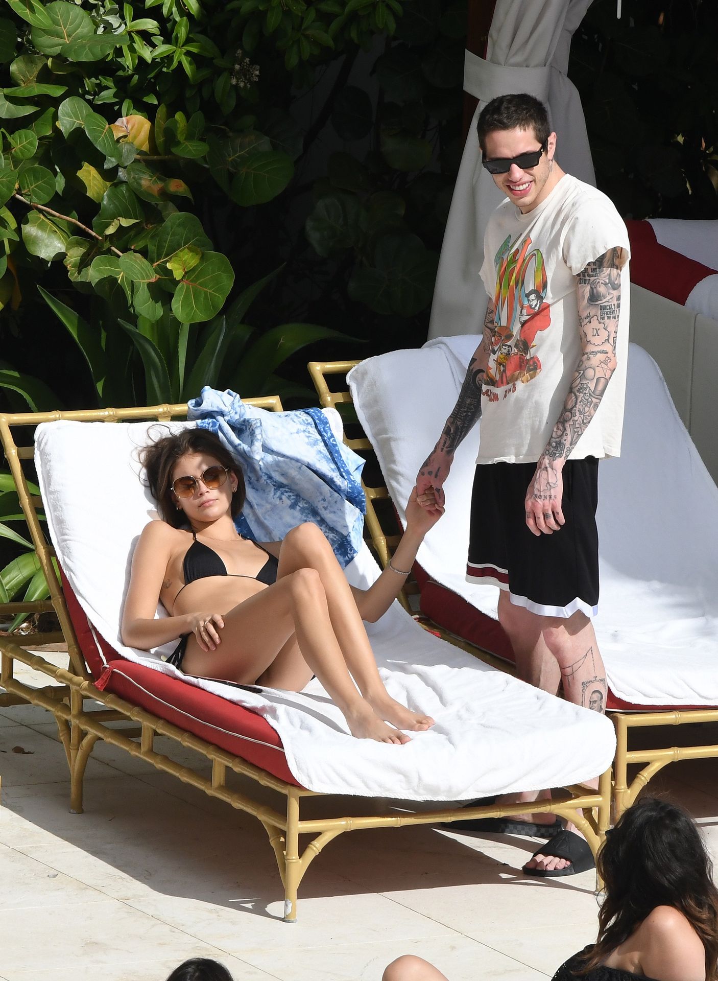 La figlia di Cindy Crawford, la modella Kaia Gerber, indossa un bikini nero mentre bacia il fidanzato Pete Davidson a bordo piscina a Miami, 23/11/2019.