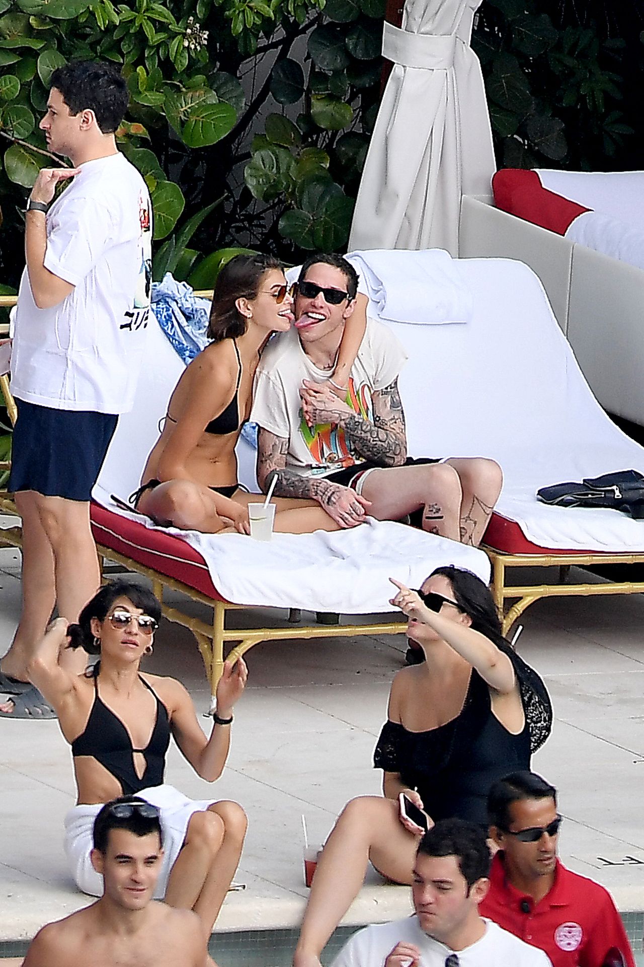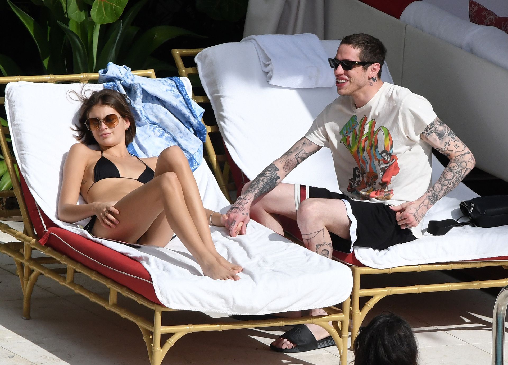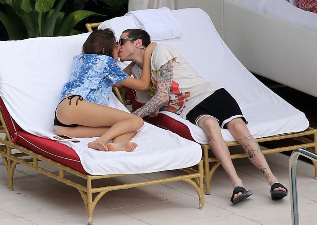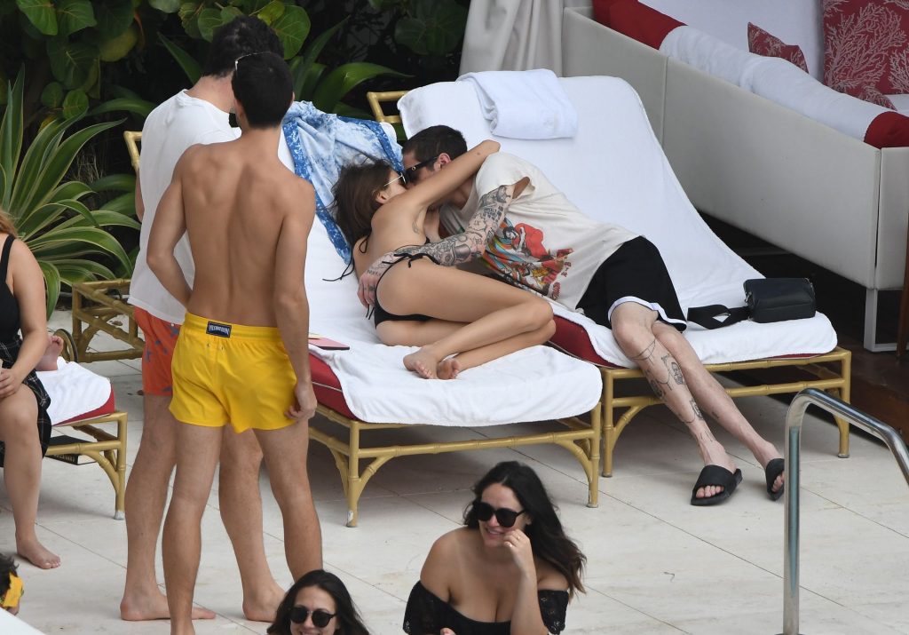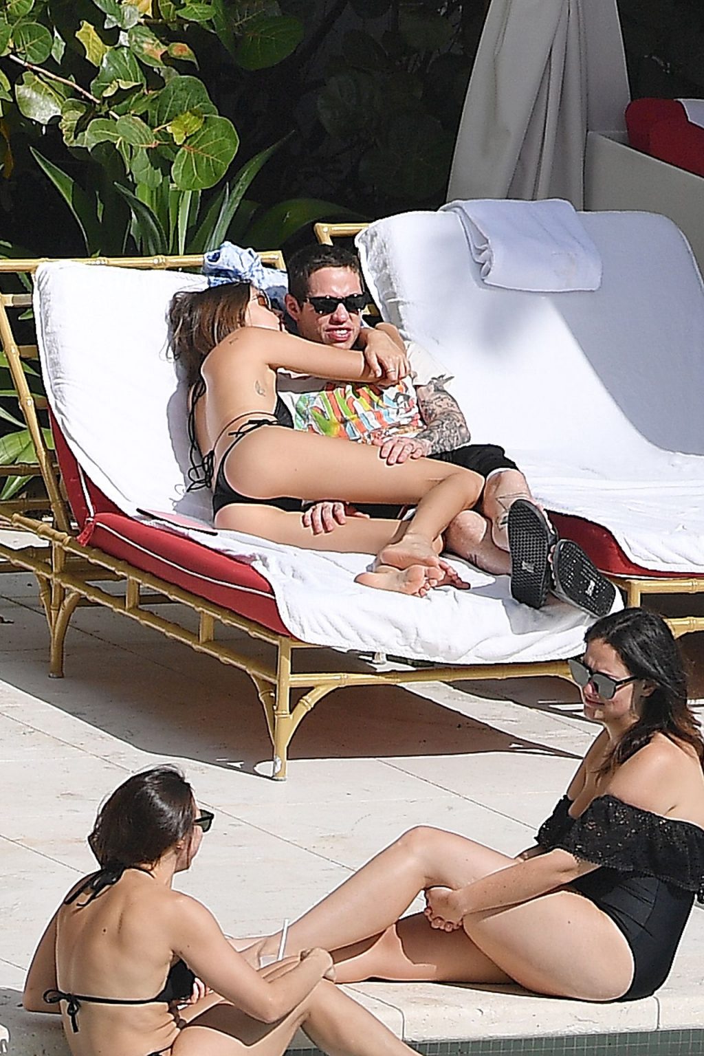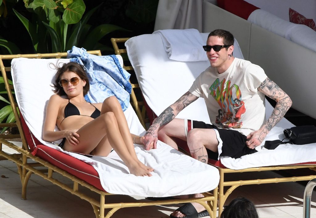 La figlia di Cindy Crawford, la modella Kaia Gerber, indossa un bikini nero mentre bacia il fidanzato Pete Davidson a bordo piscina a Miami, 23/11/2019.