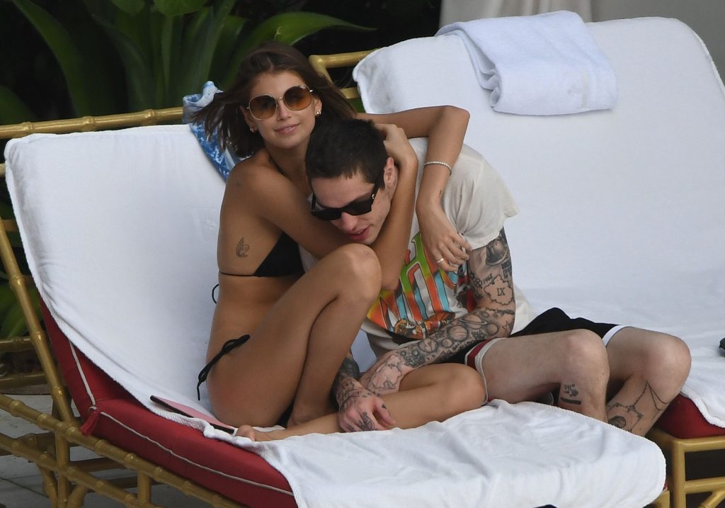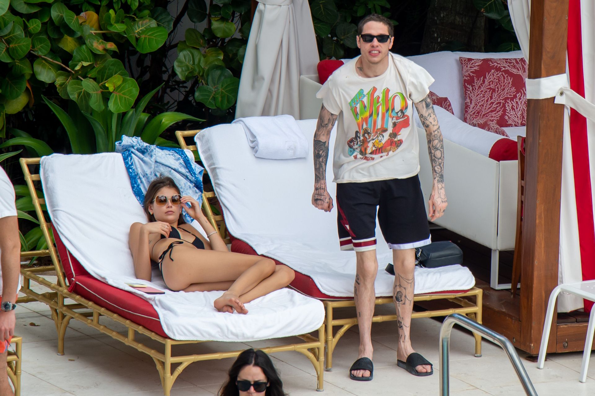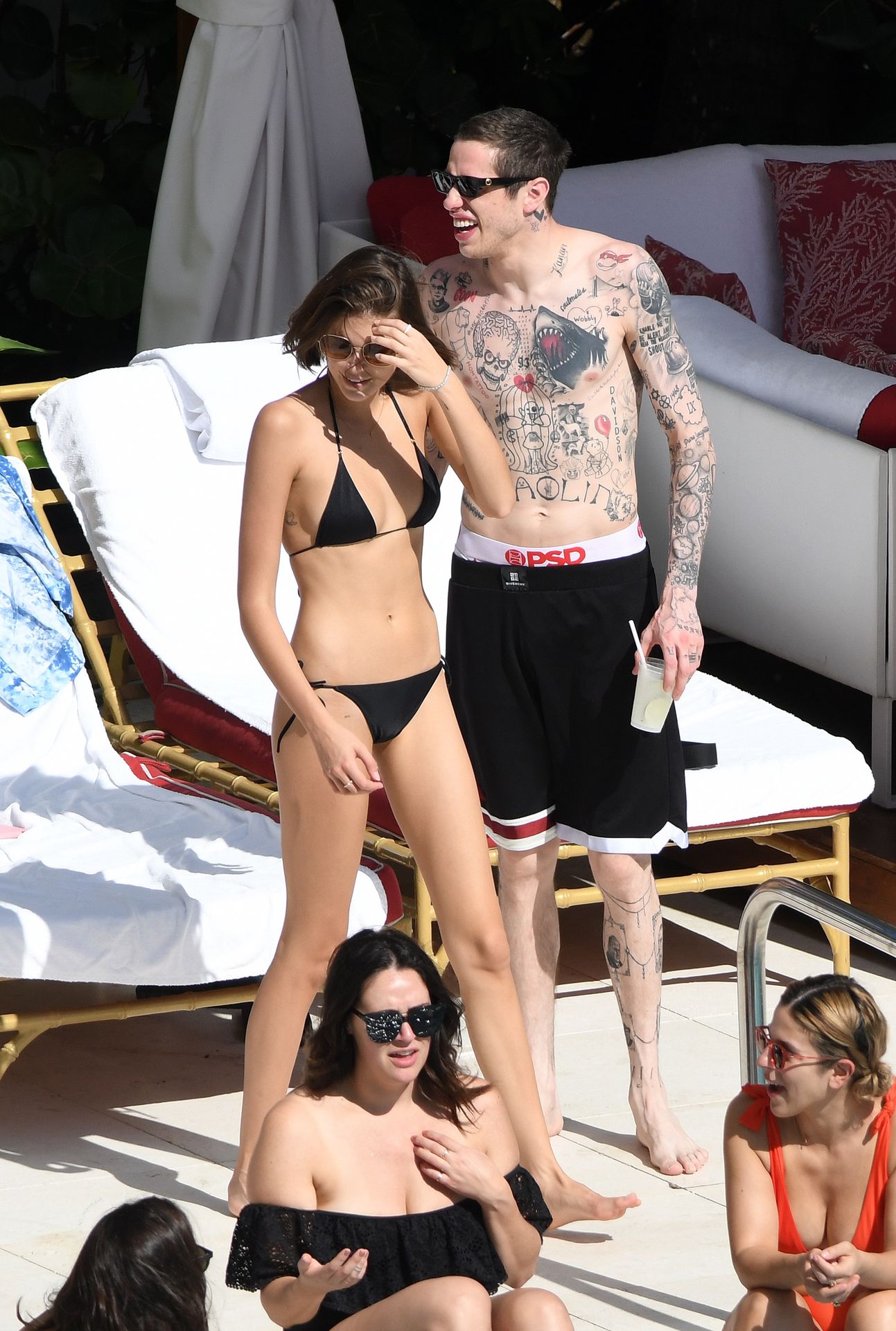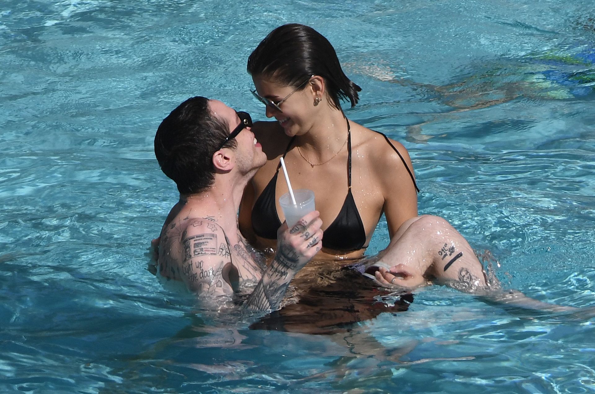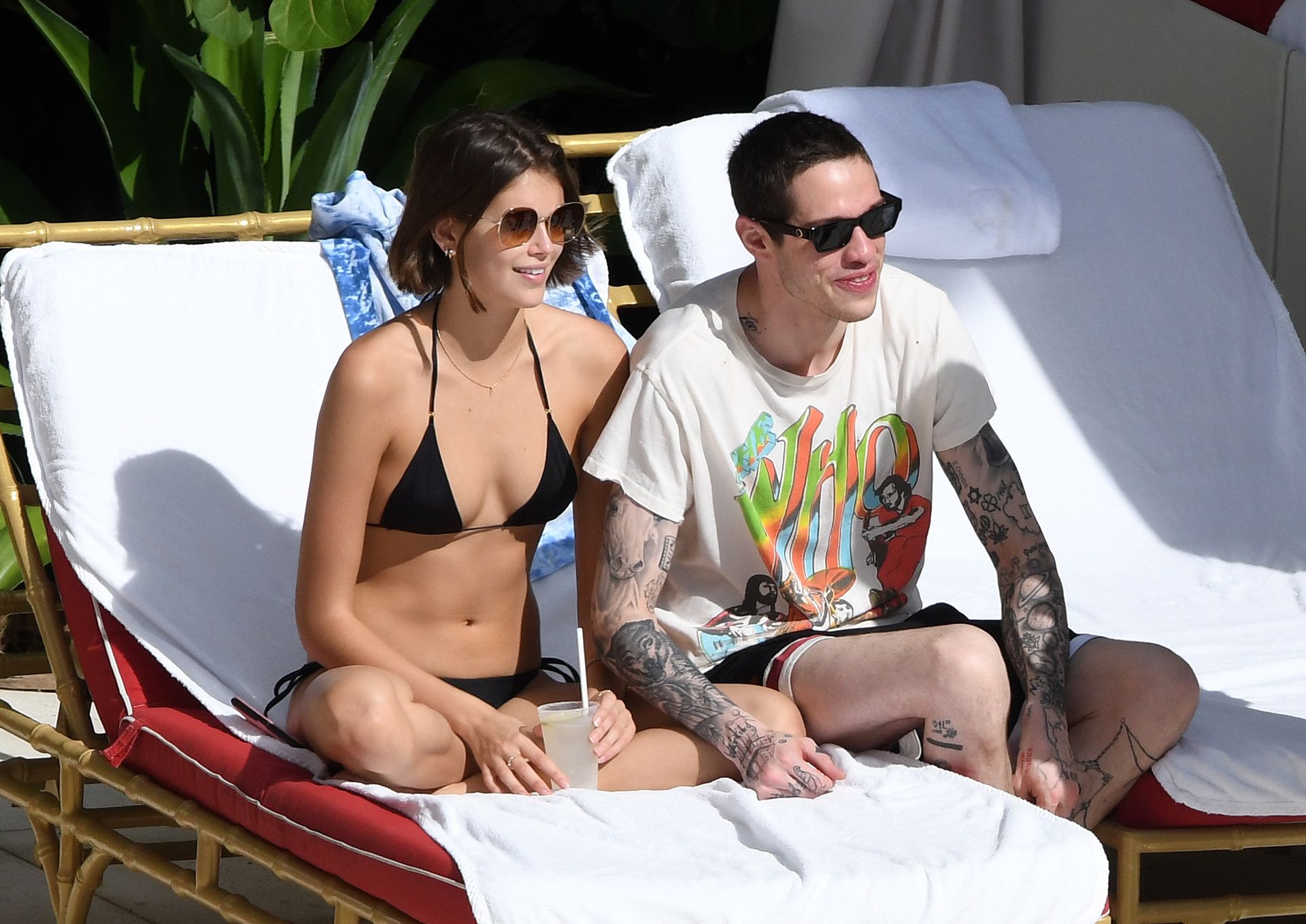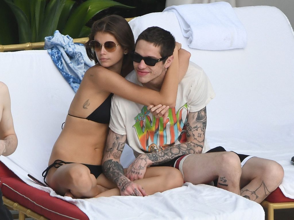 La figlia di Cindy Crawford, la modella Kaia Gerber, indossa un bikini nero mentre bacia il fidanzato Pete Davidson a bordo piscina a Miami, 23/11/2019.