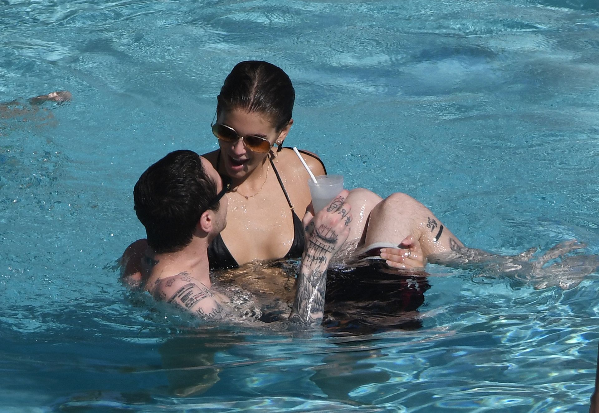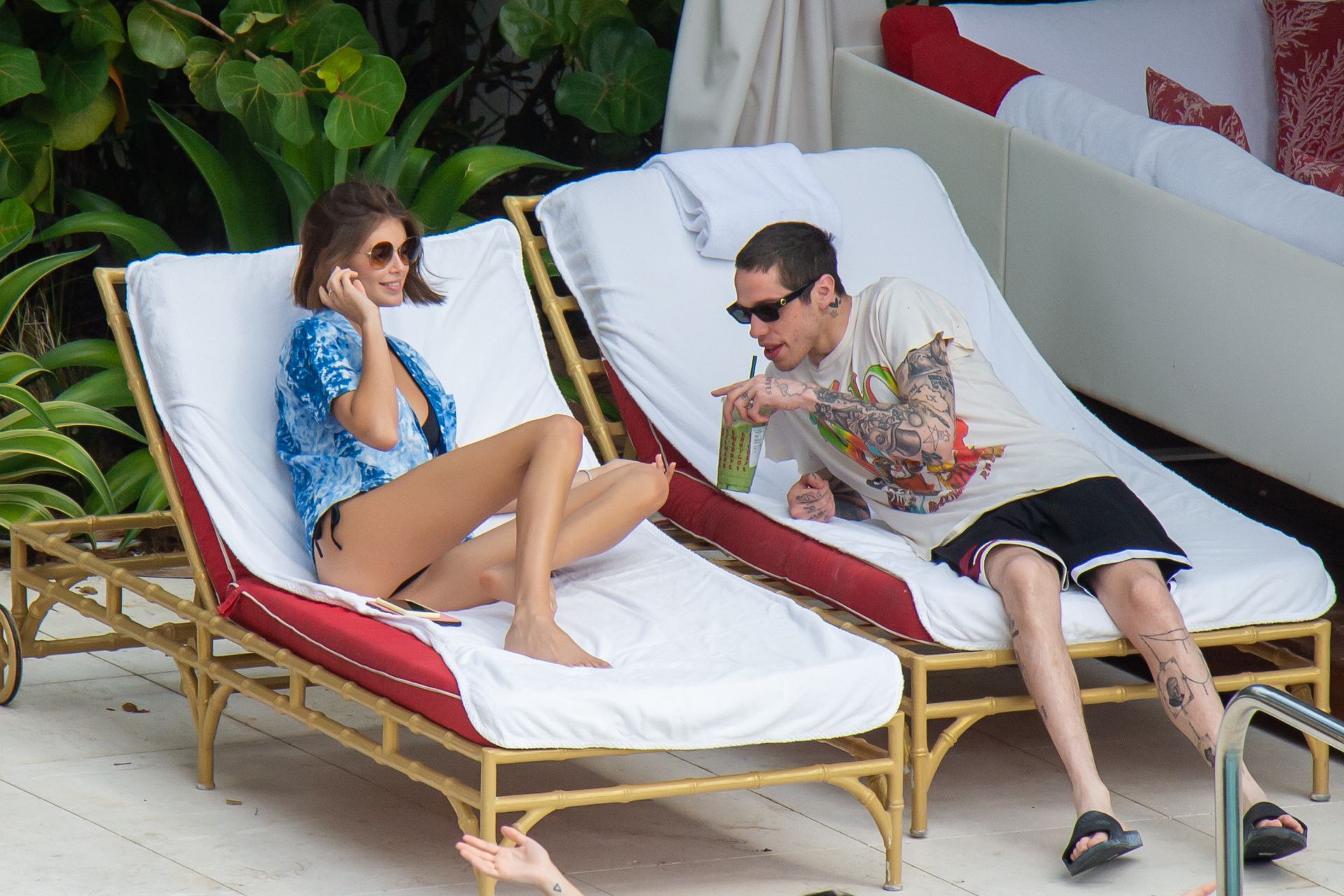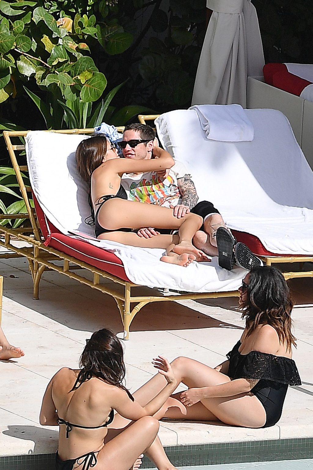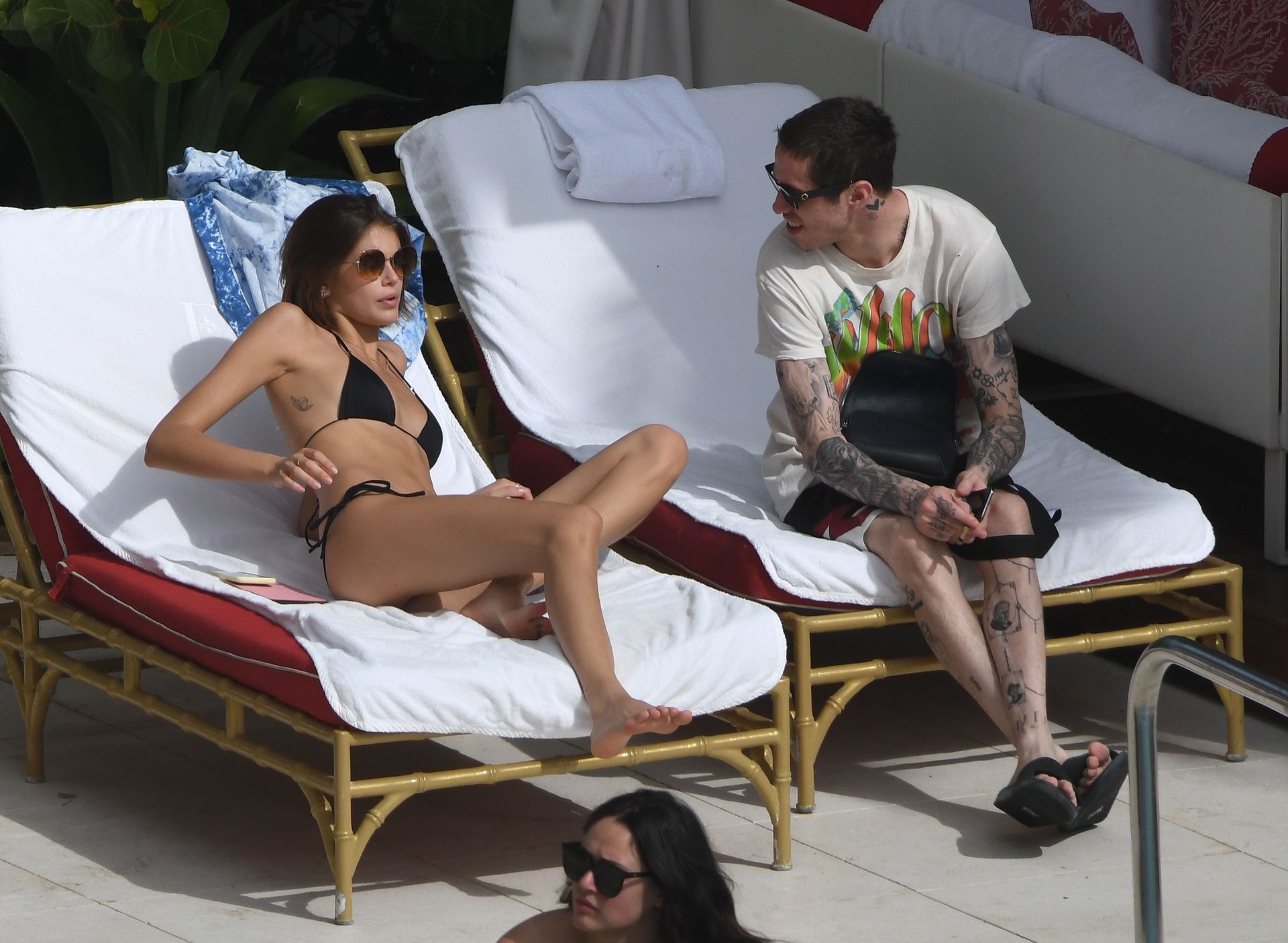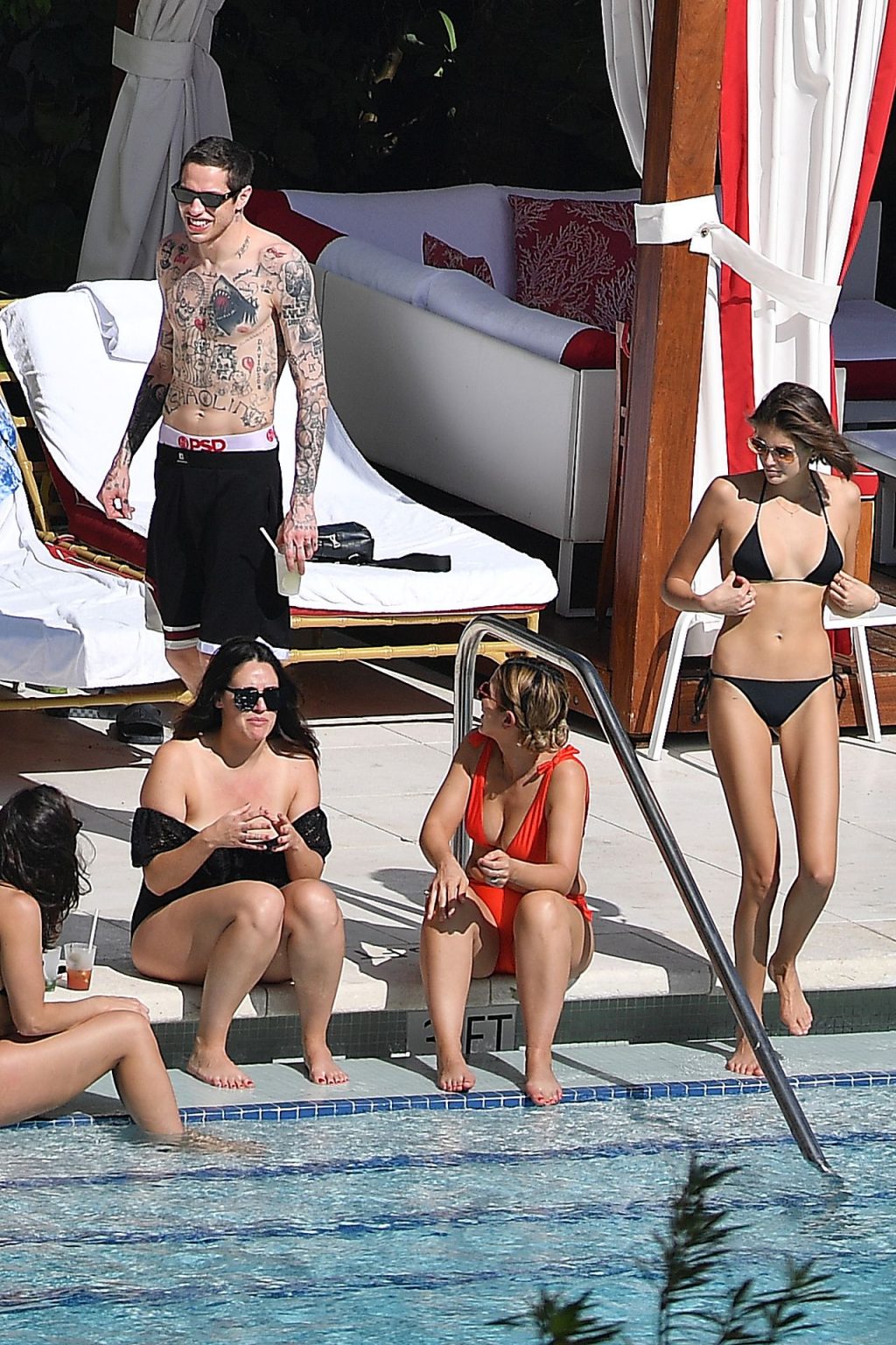 La figlia di Cindy Crawford, la modella Kaia Gerber, indossa un bikini nero mentre bacia il fidanzato Pete Davidson a bordo piscina a Miami, 23/11/2019.