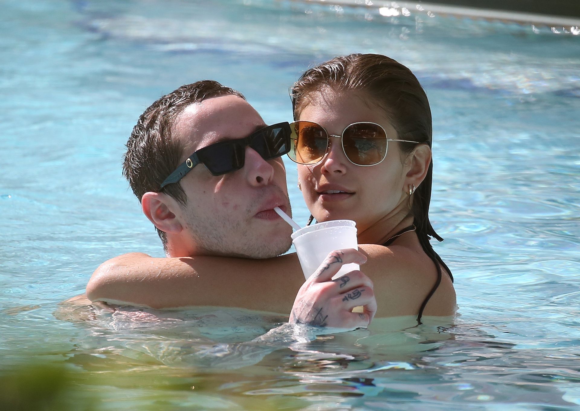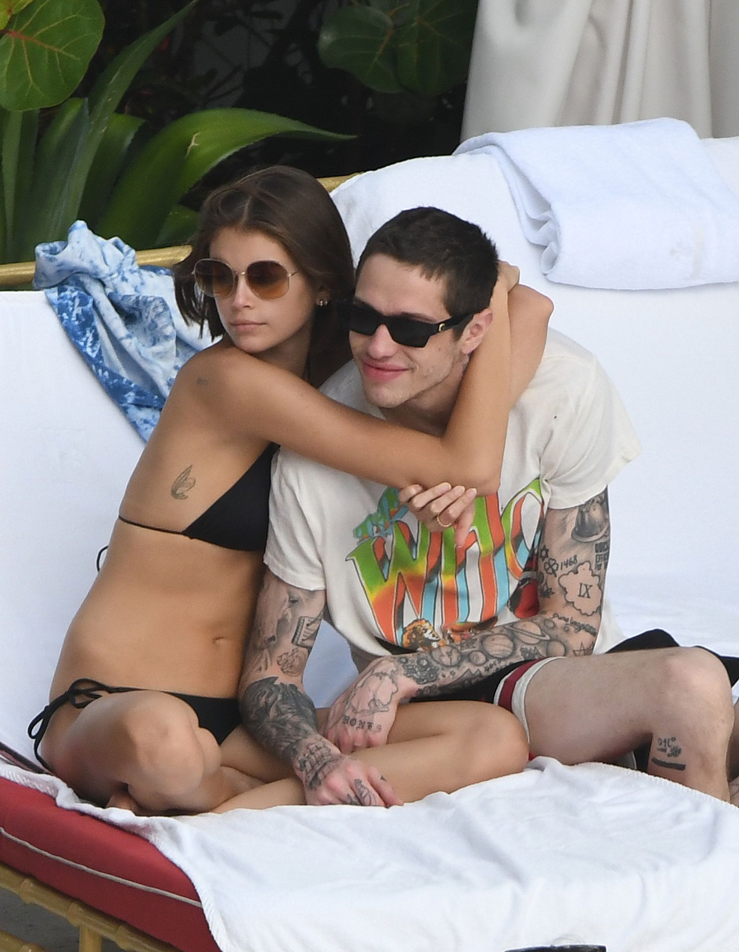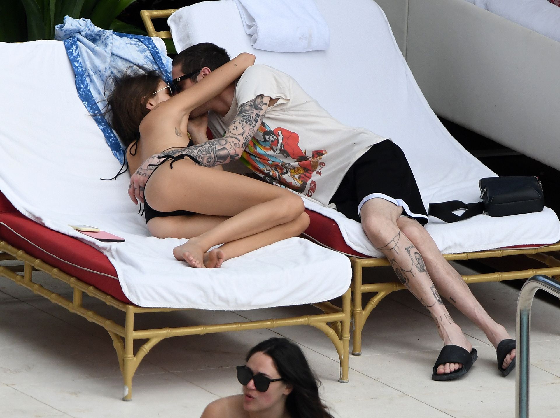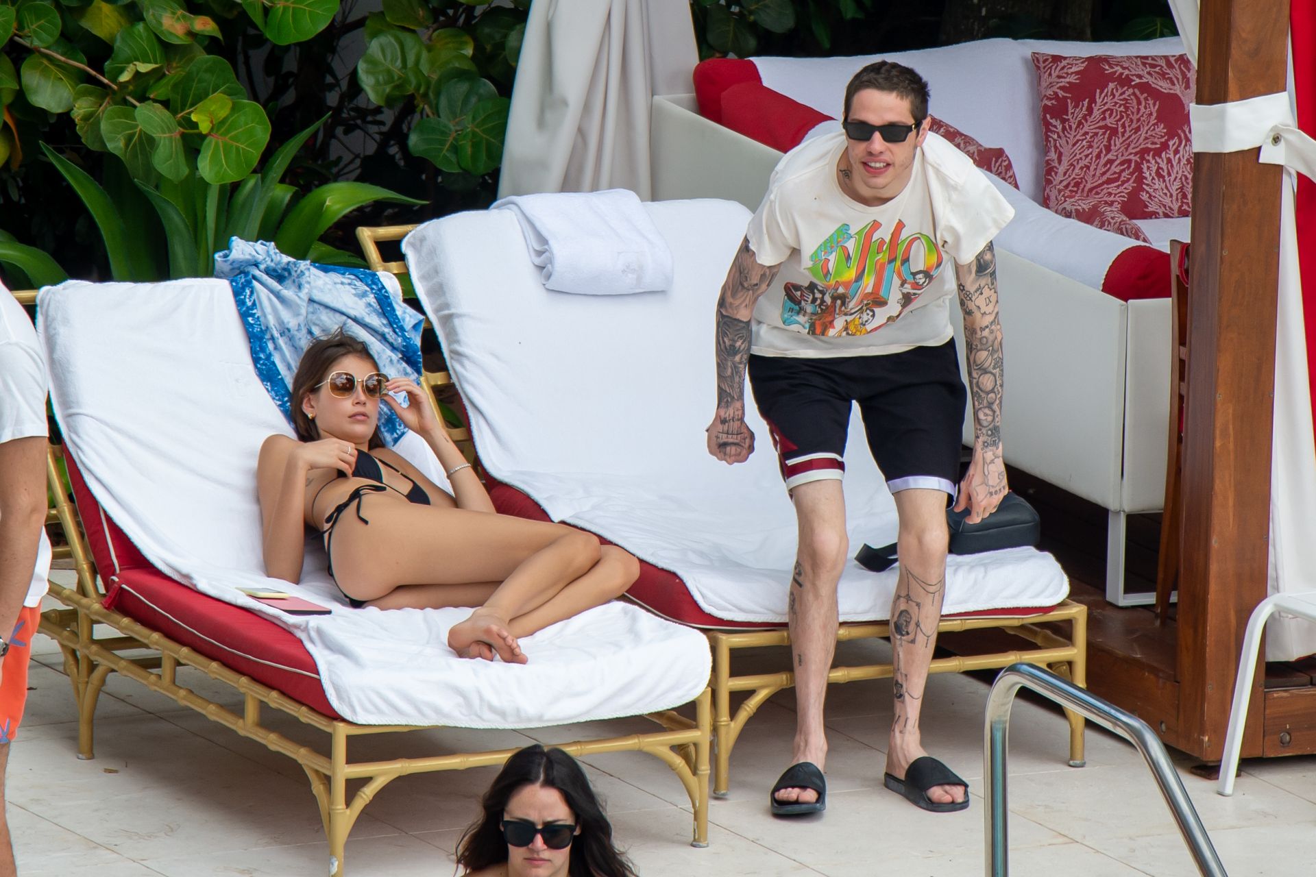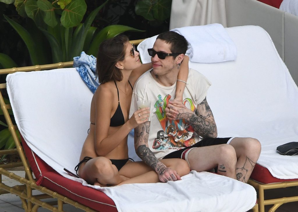 La figlia di Cindy Crawford, la modella Kaia Gerber, indossa un bikini nero mentre bacia il fidanzato Pete Davidson a bordo piscina a Miami, 23/11/2019.