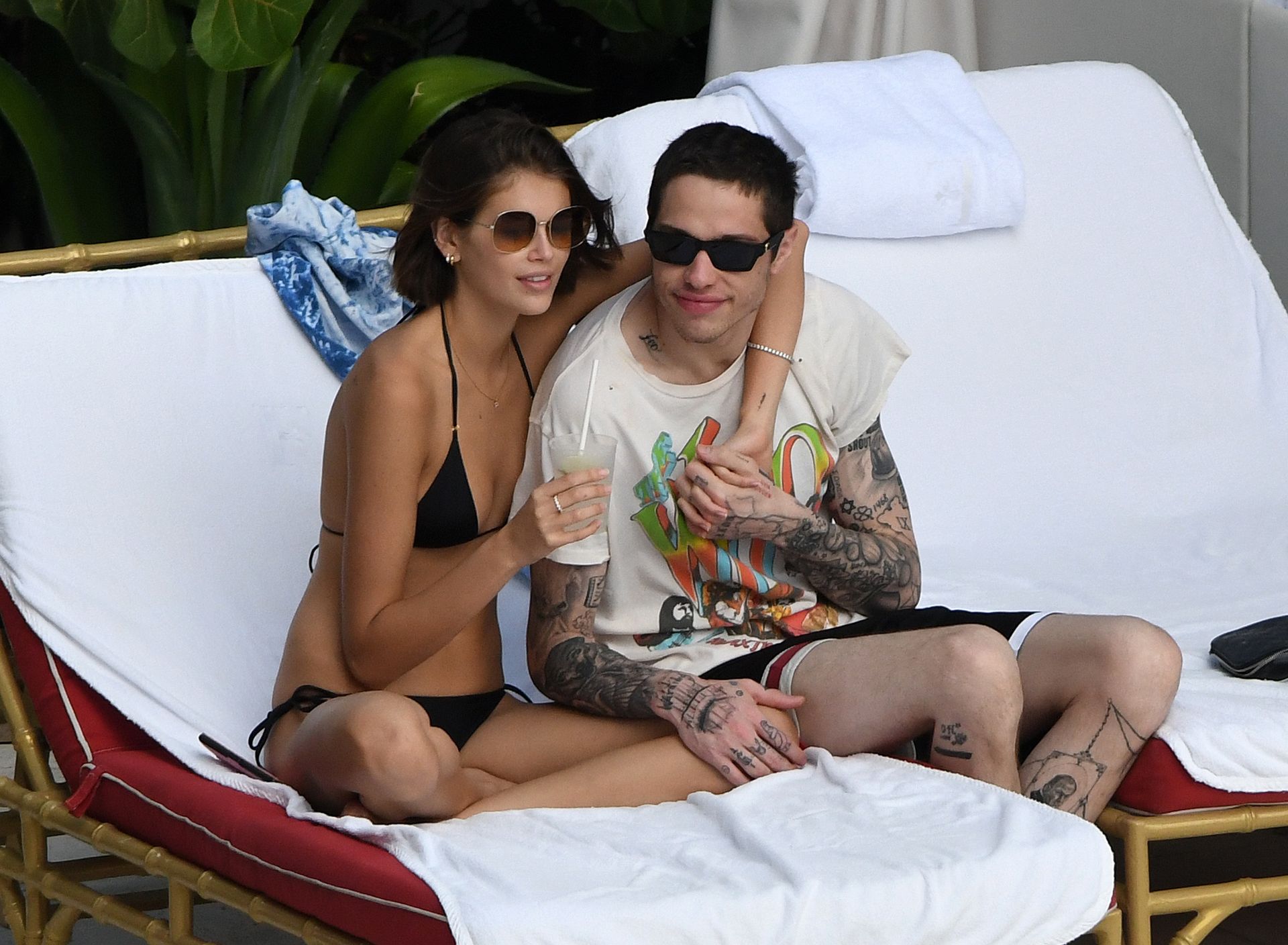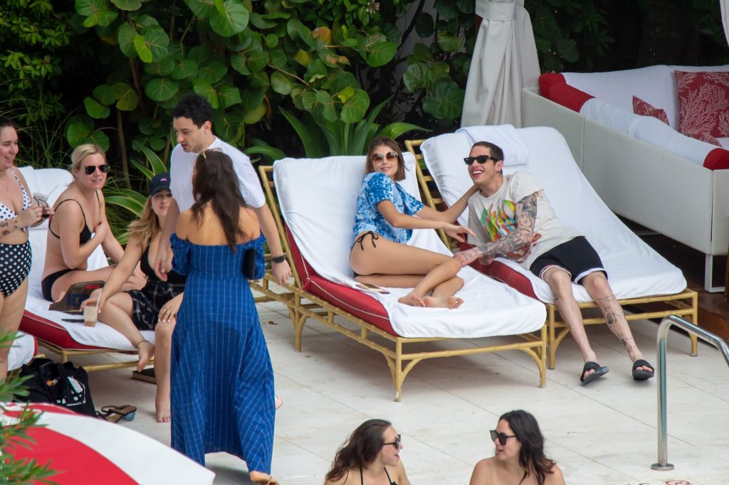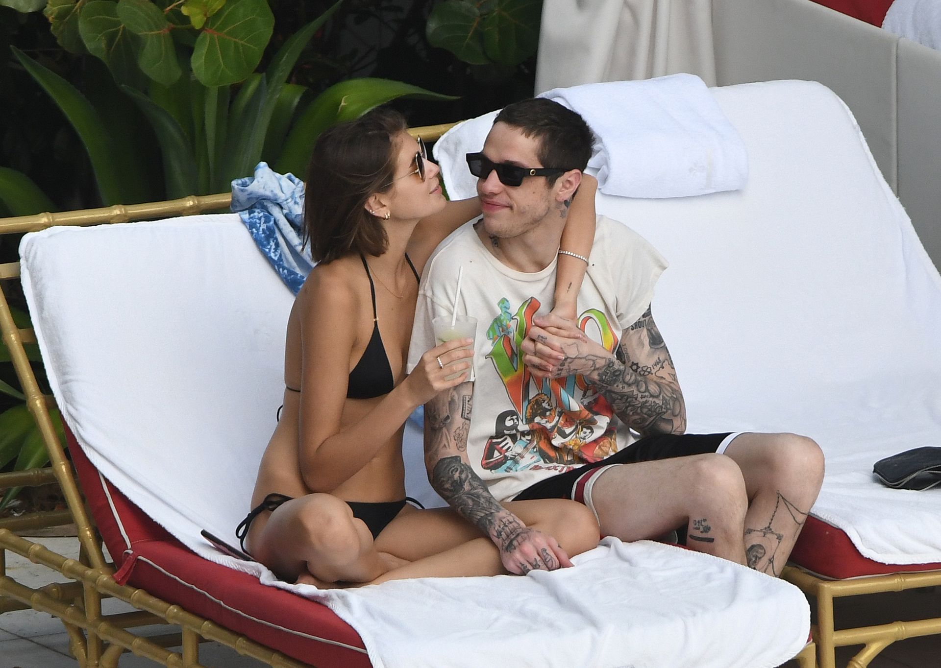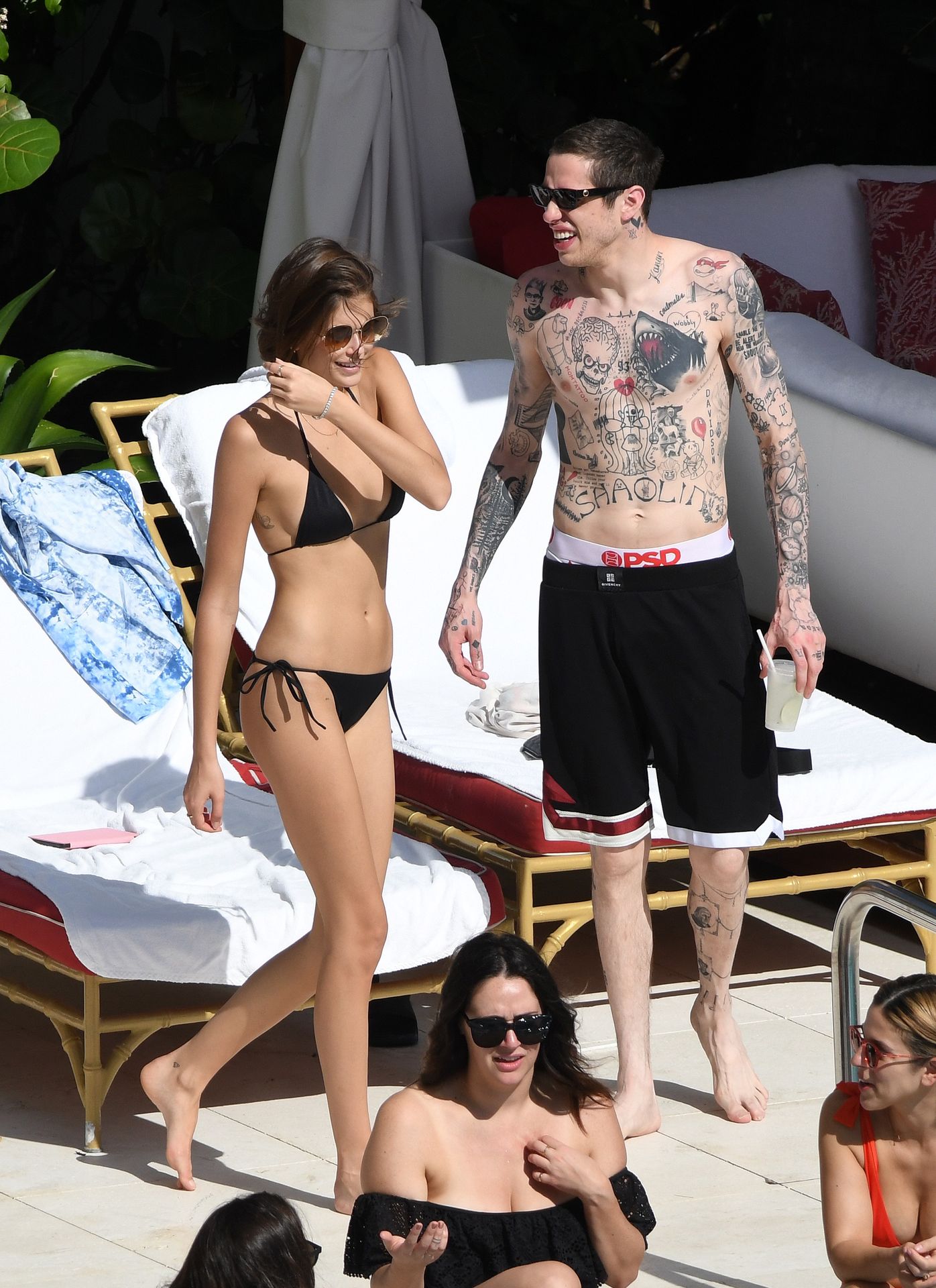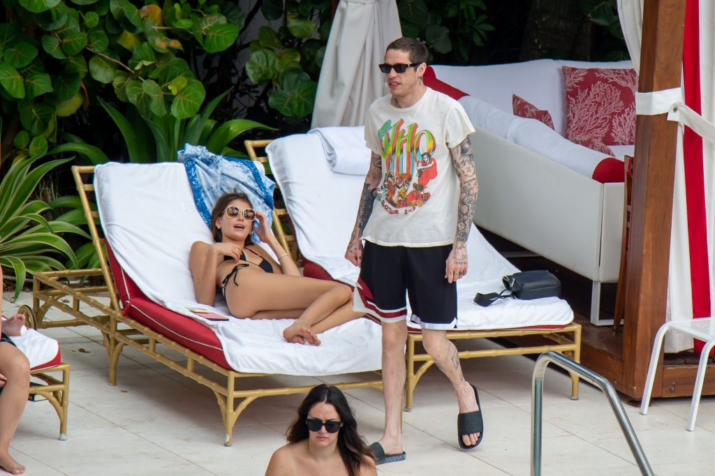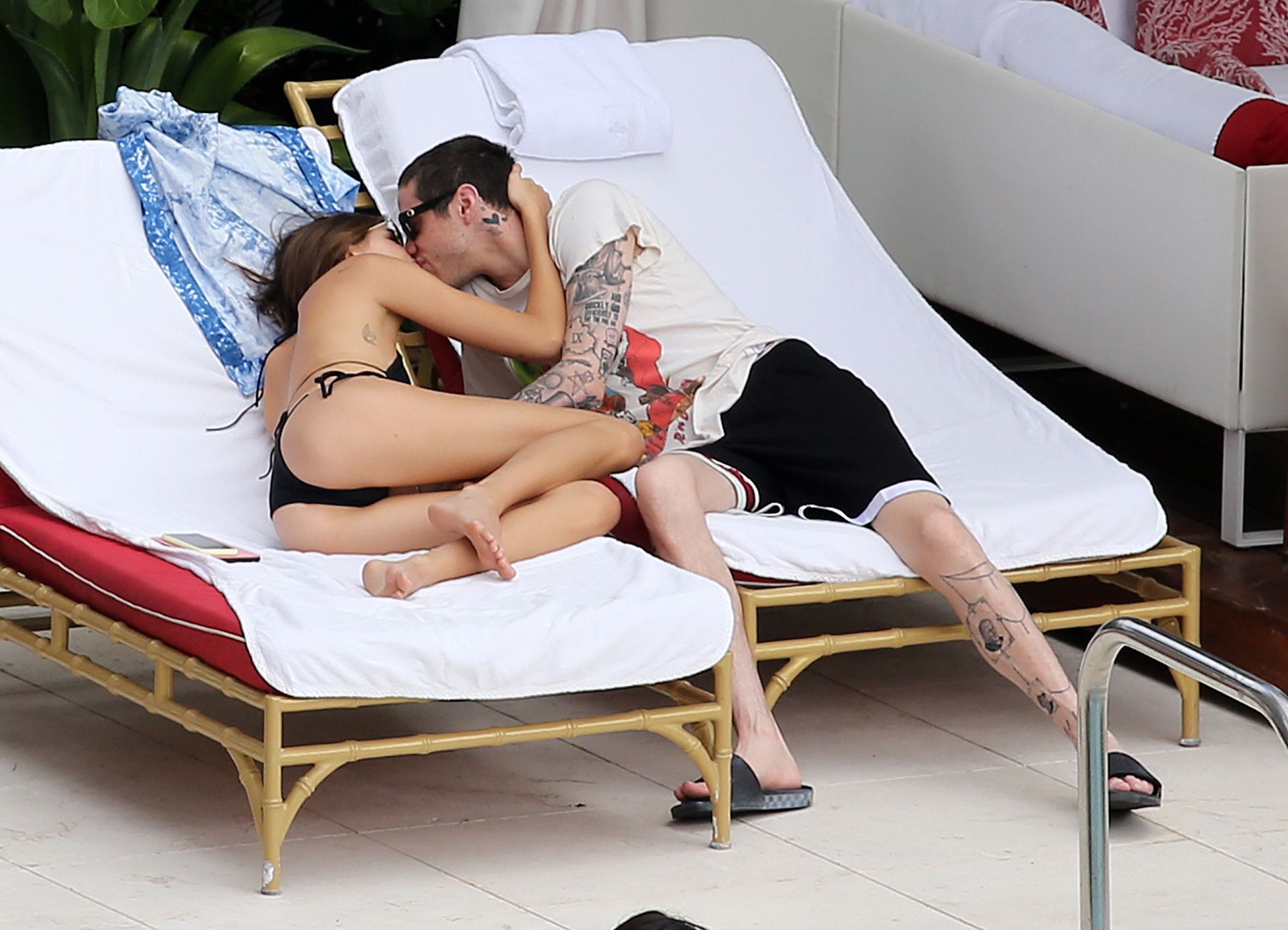 La figlia di Cindy Crawford, la modella Kaia Gerber, indossa un bikini nero mentre bacia il fidanzato Pete Davidson a bordo piscina a Miami, 23/11/2019.