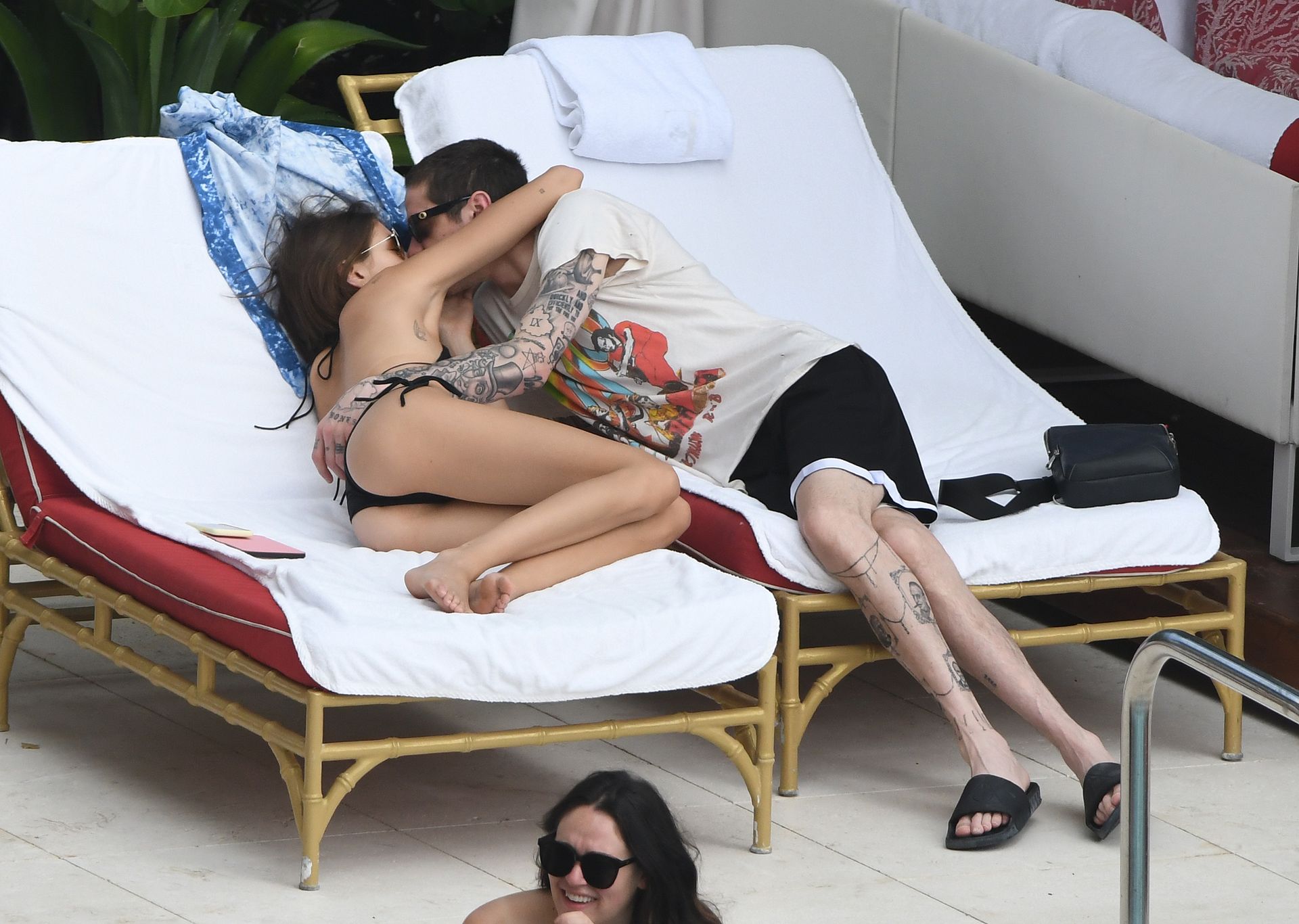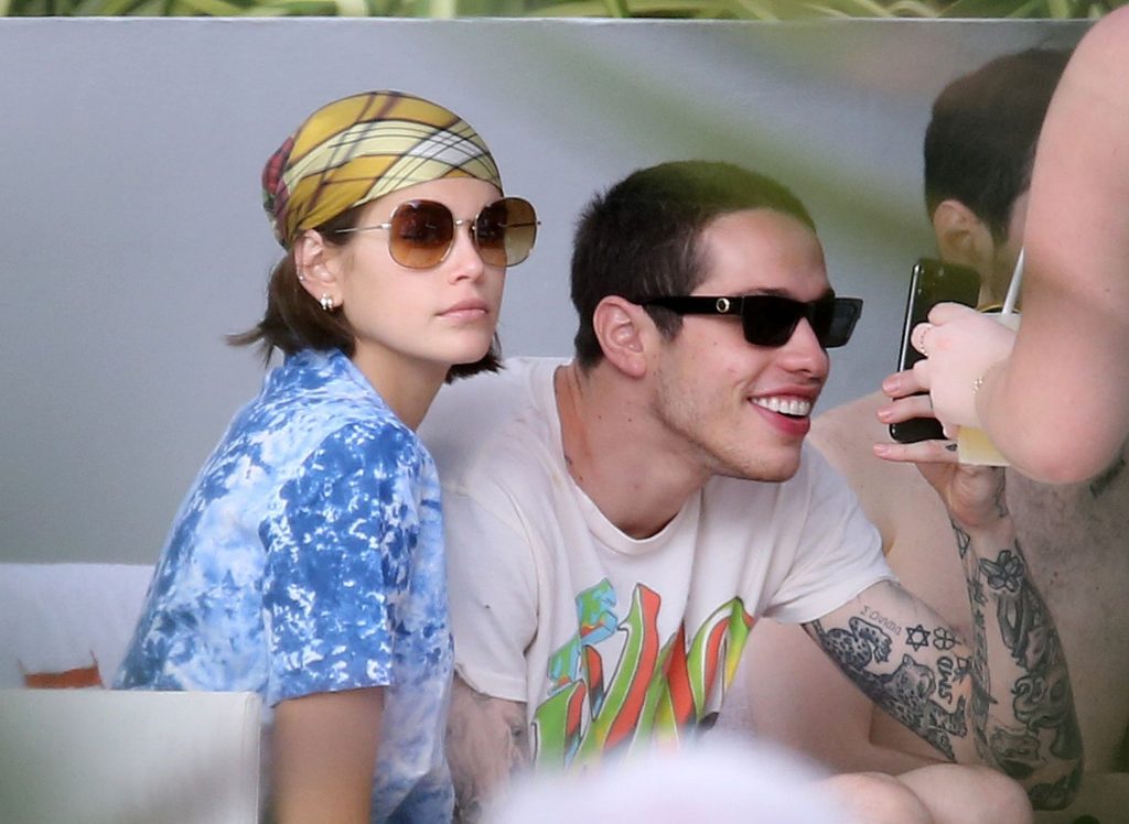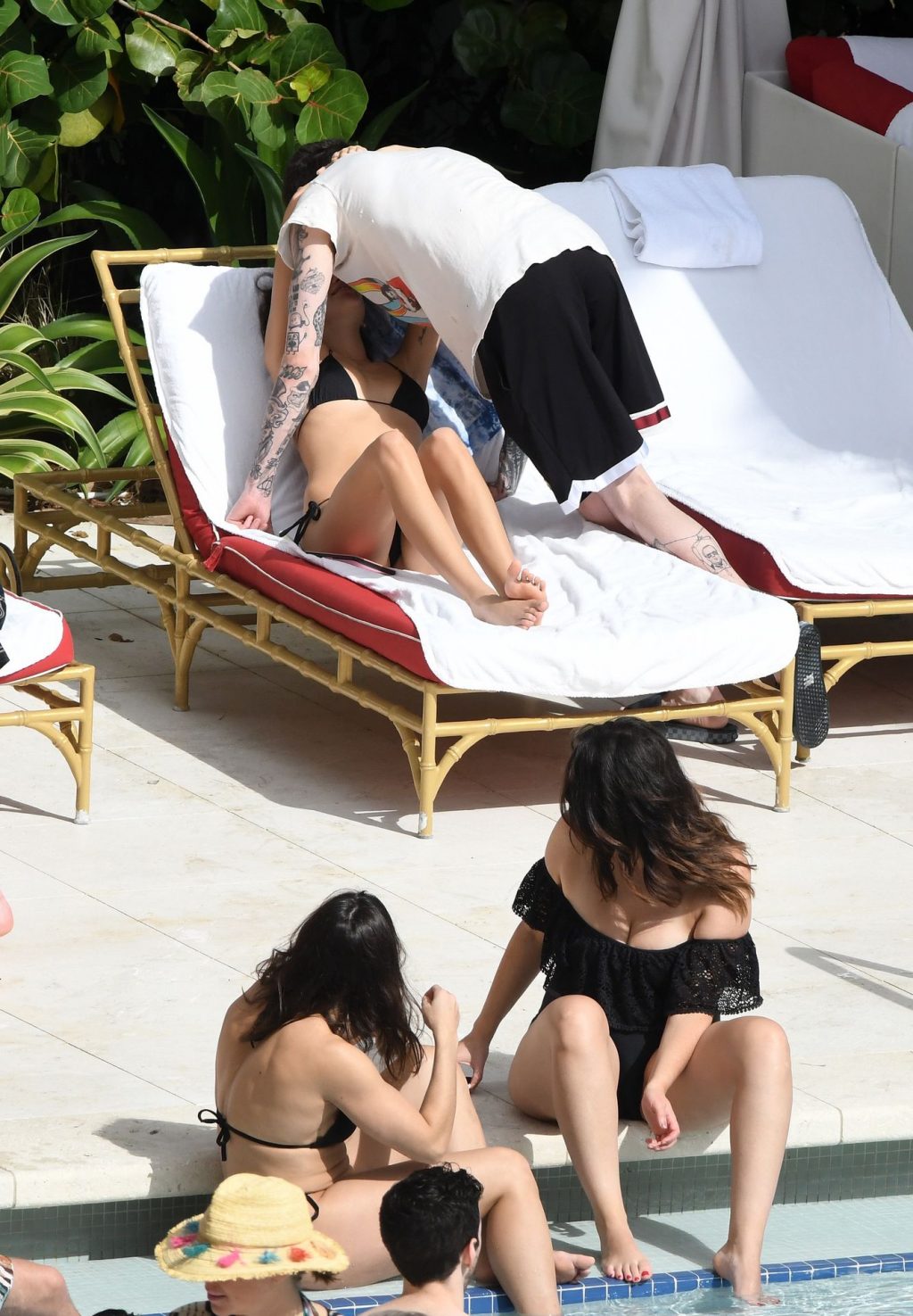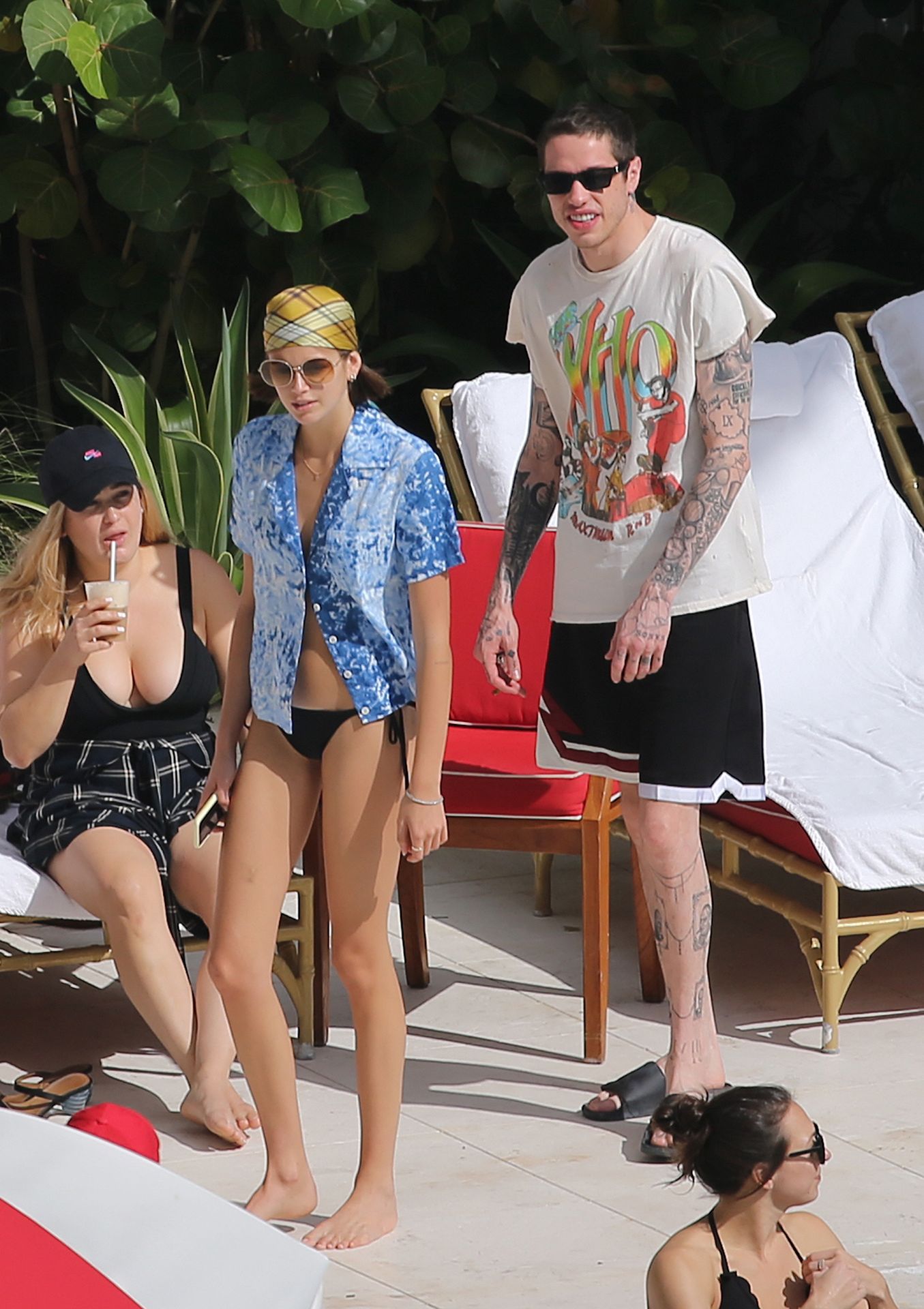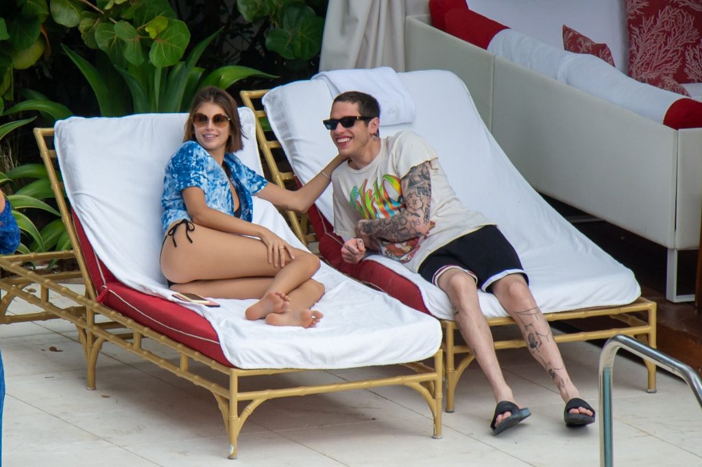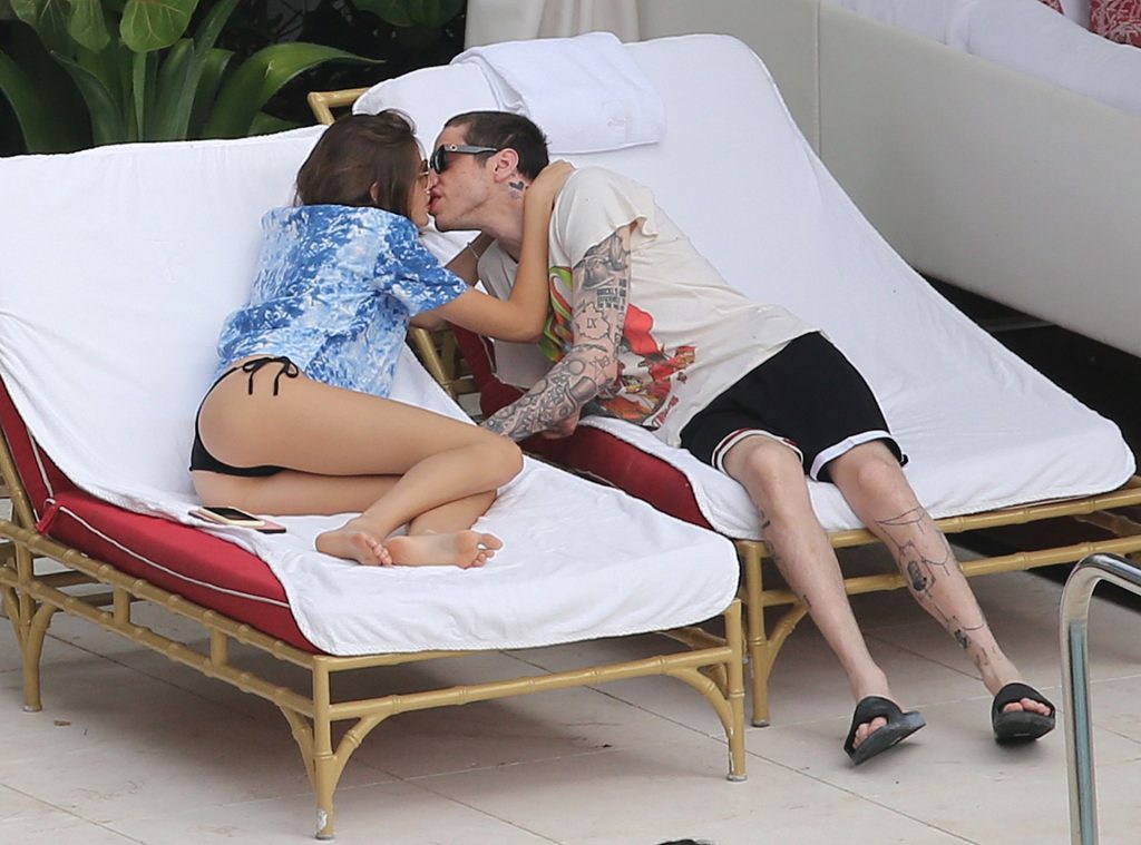La figlia di Cindy Crawford, la modella Kaia Gerber, indossa un bikini nero mentre bacia il fidanzato Pete Davidson a bordo piscina a Miami, 23/11/2019.
