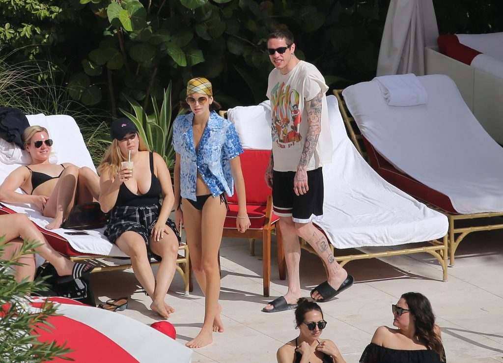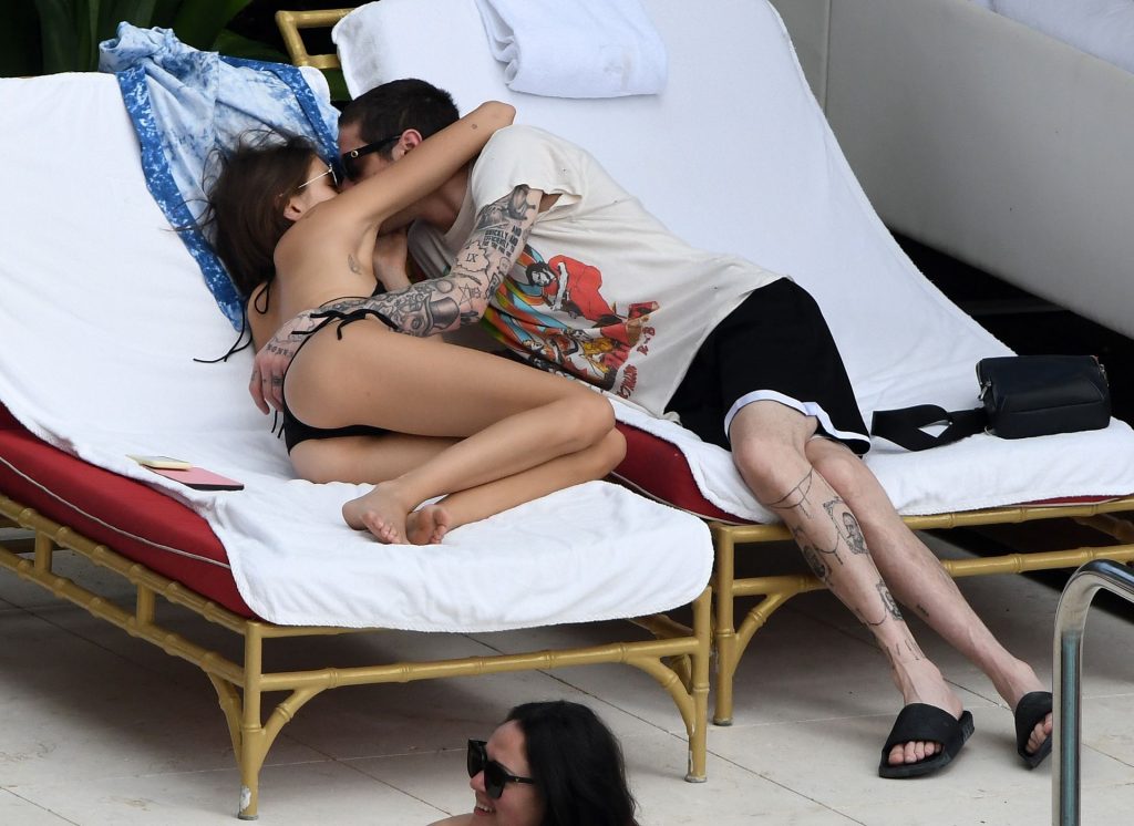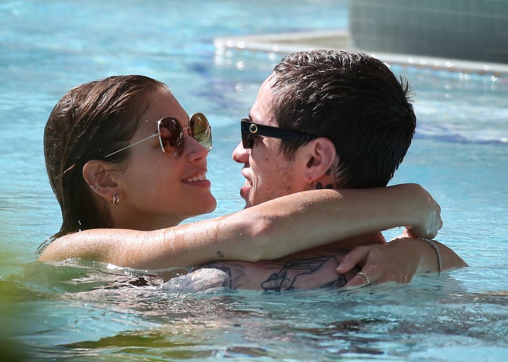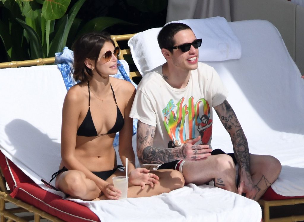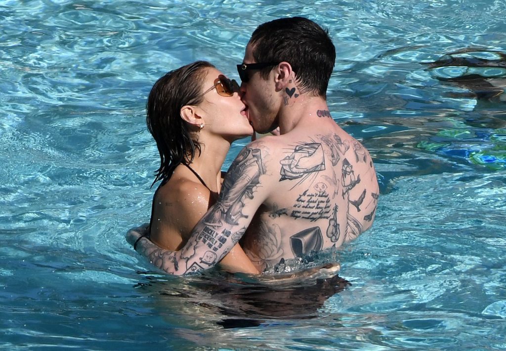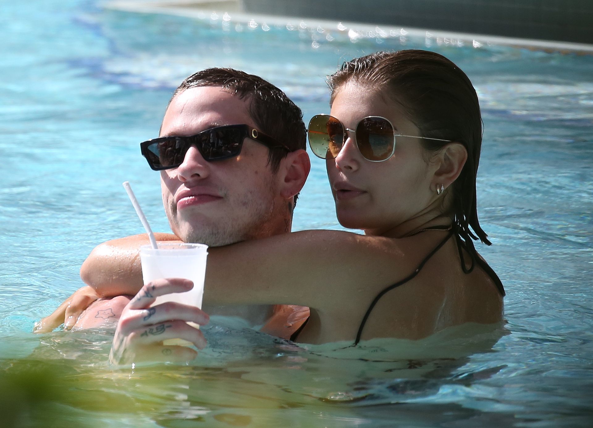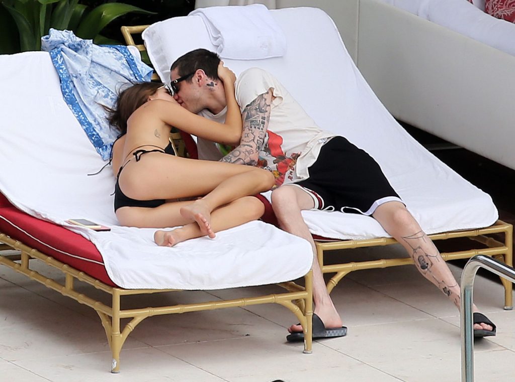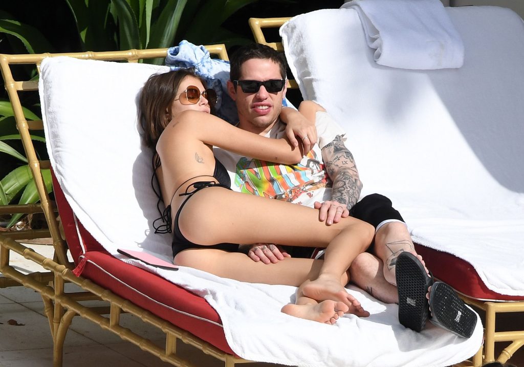 La figlia di Cindy Crawford, la modella Kaia Gerber, indossa un bikini nero mentre bacia il fidanzato Pete Davidson a bordo piscina a Miami, 23/11/2019.