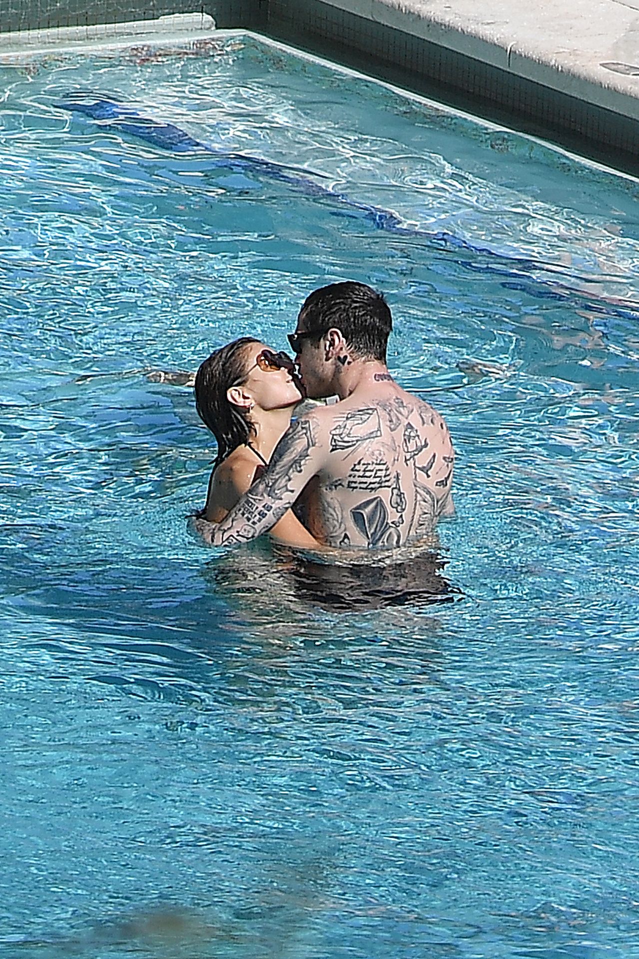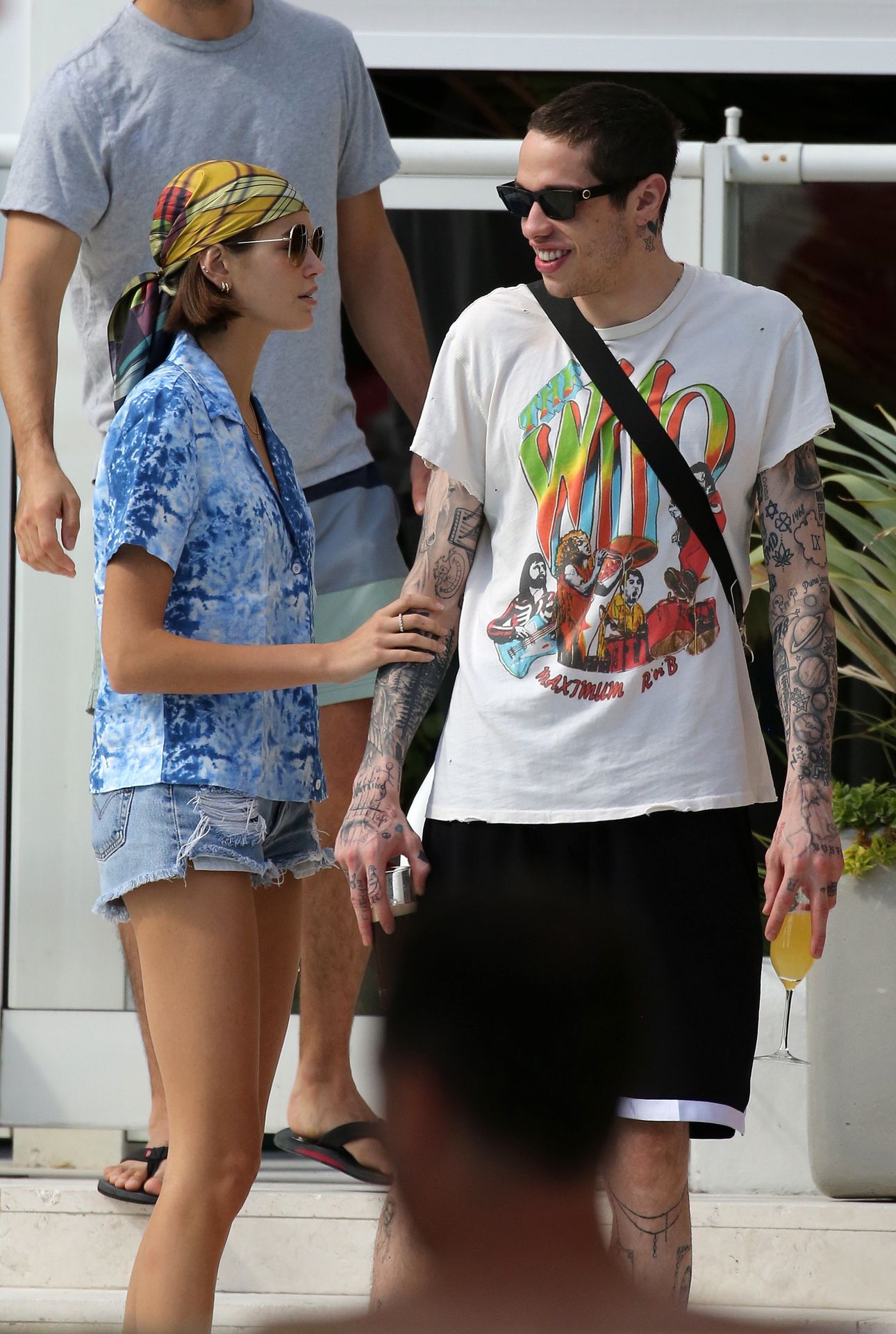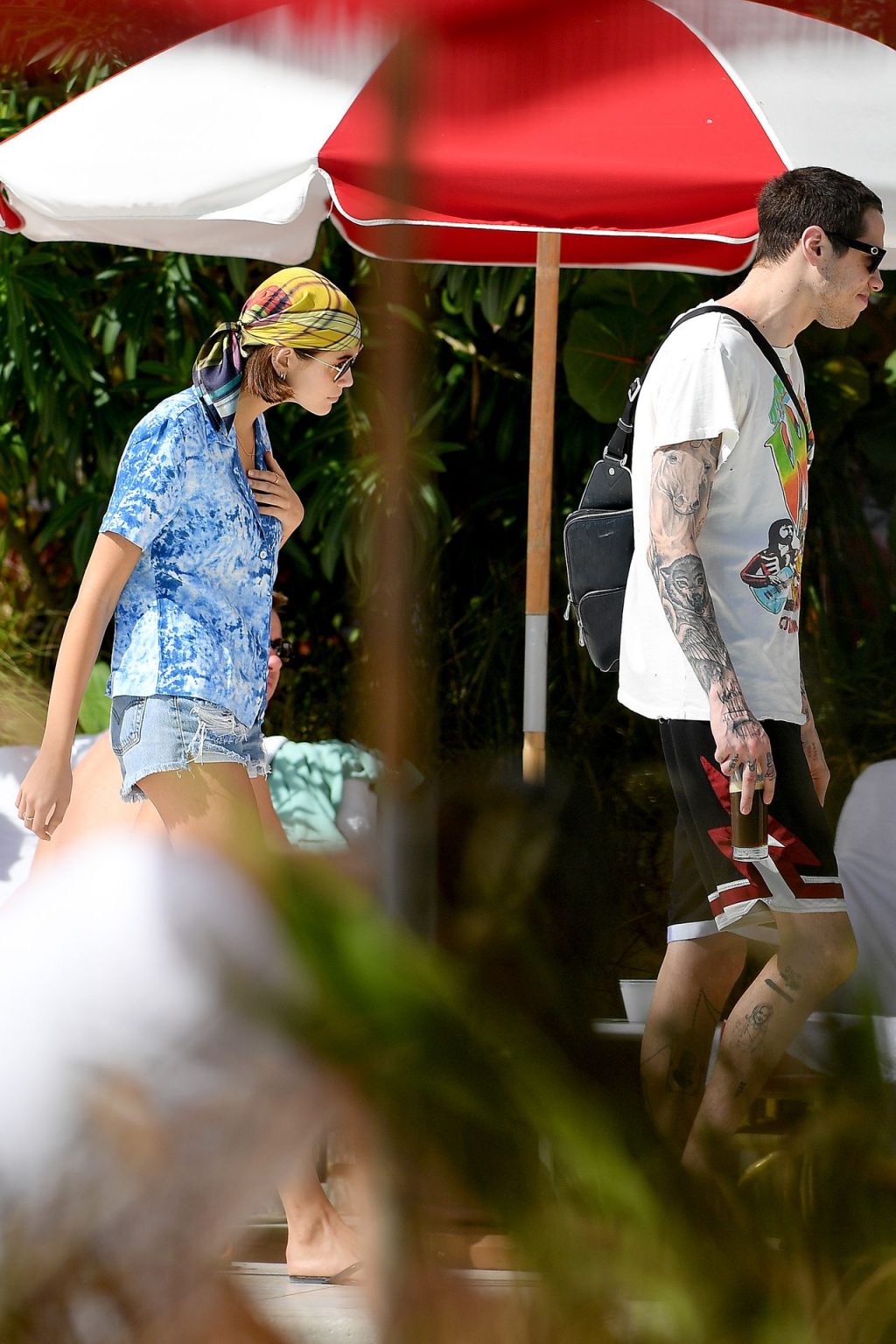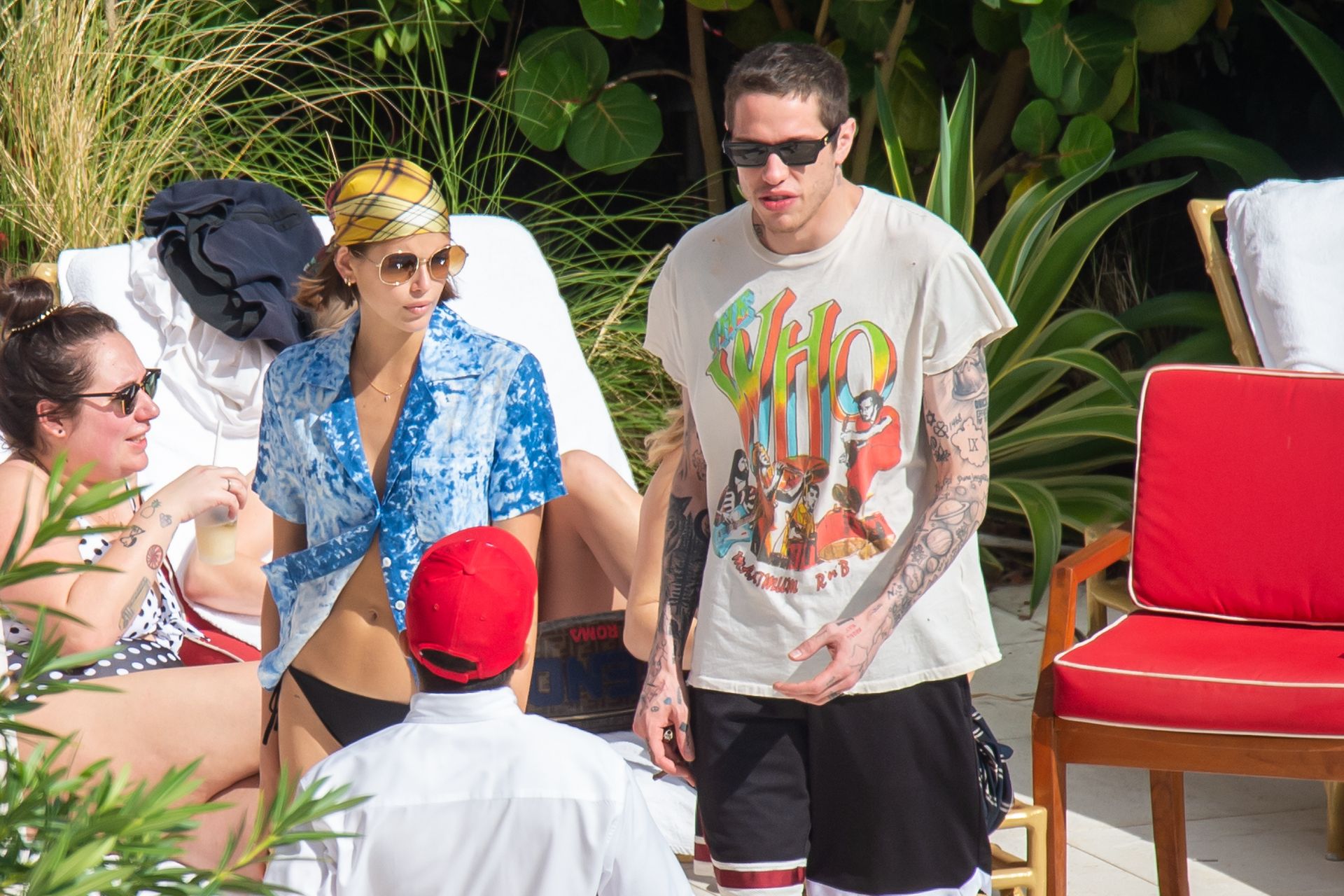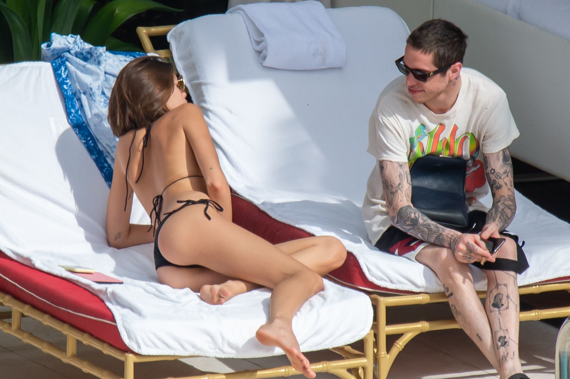 La figlia di Cindy Crawford, la modella Kaia Gerber, indossa un bikini nero mentre bacia il fidanzato Pete Davidson a bordo piscina a Miami, 23/11/2019.