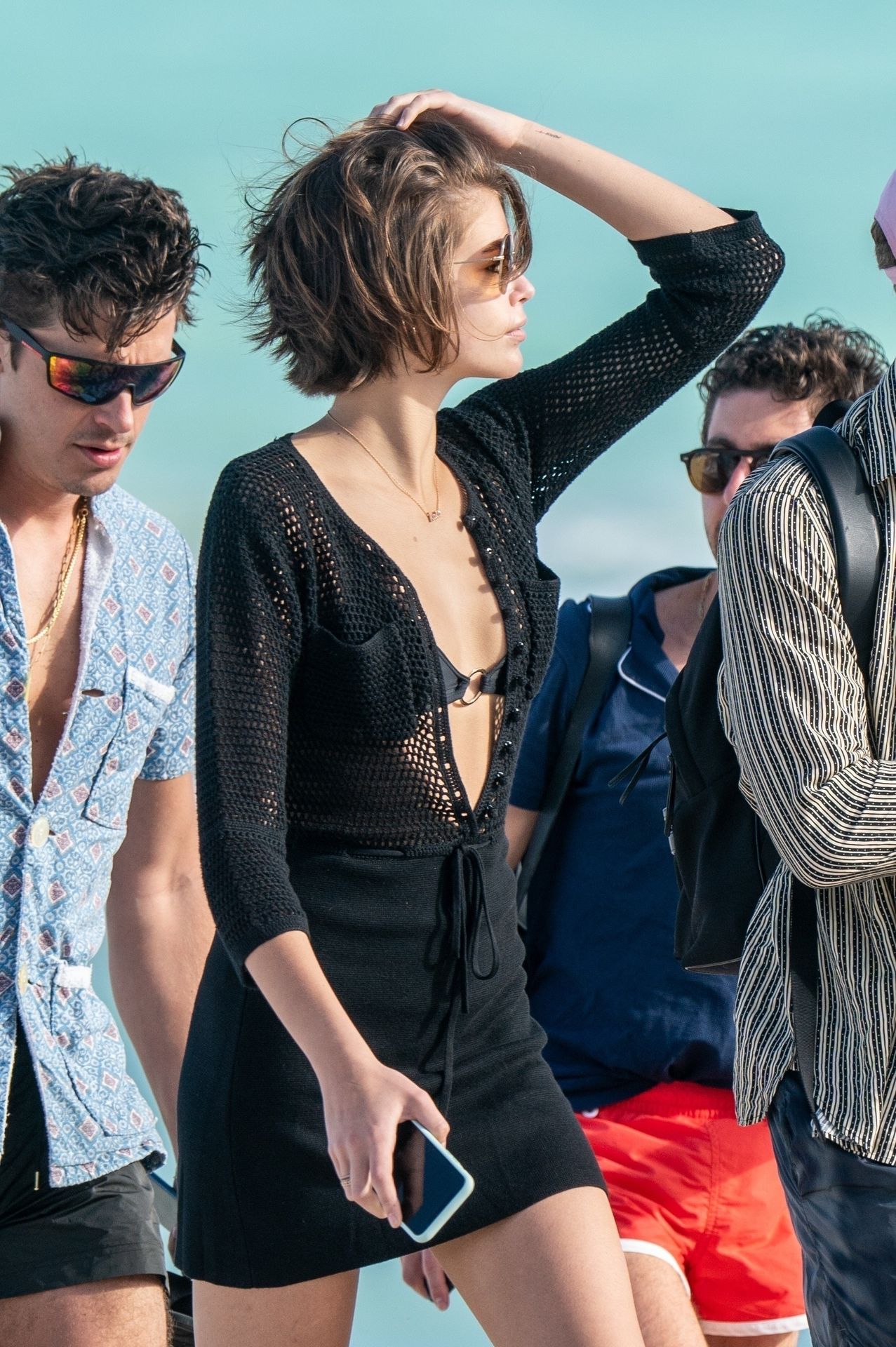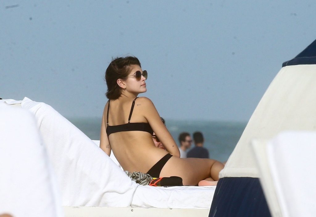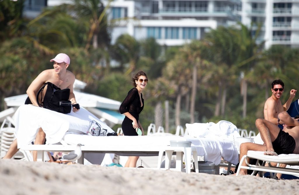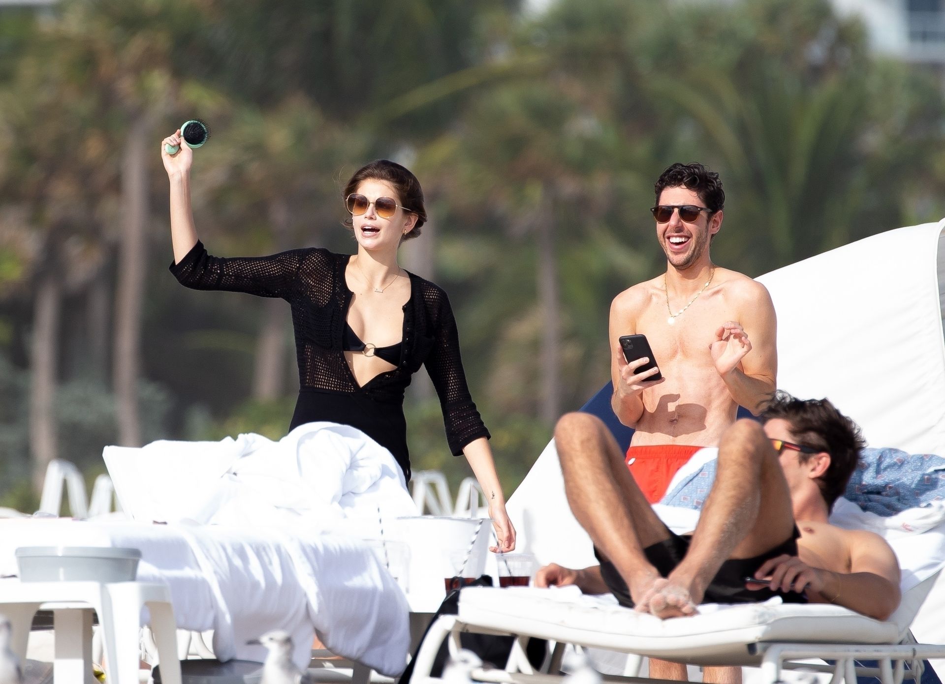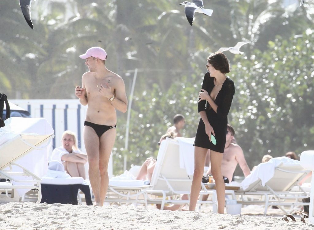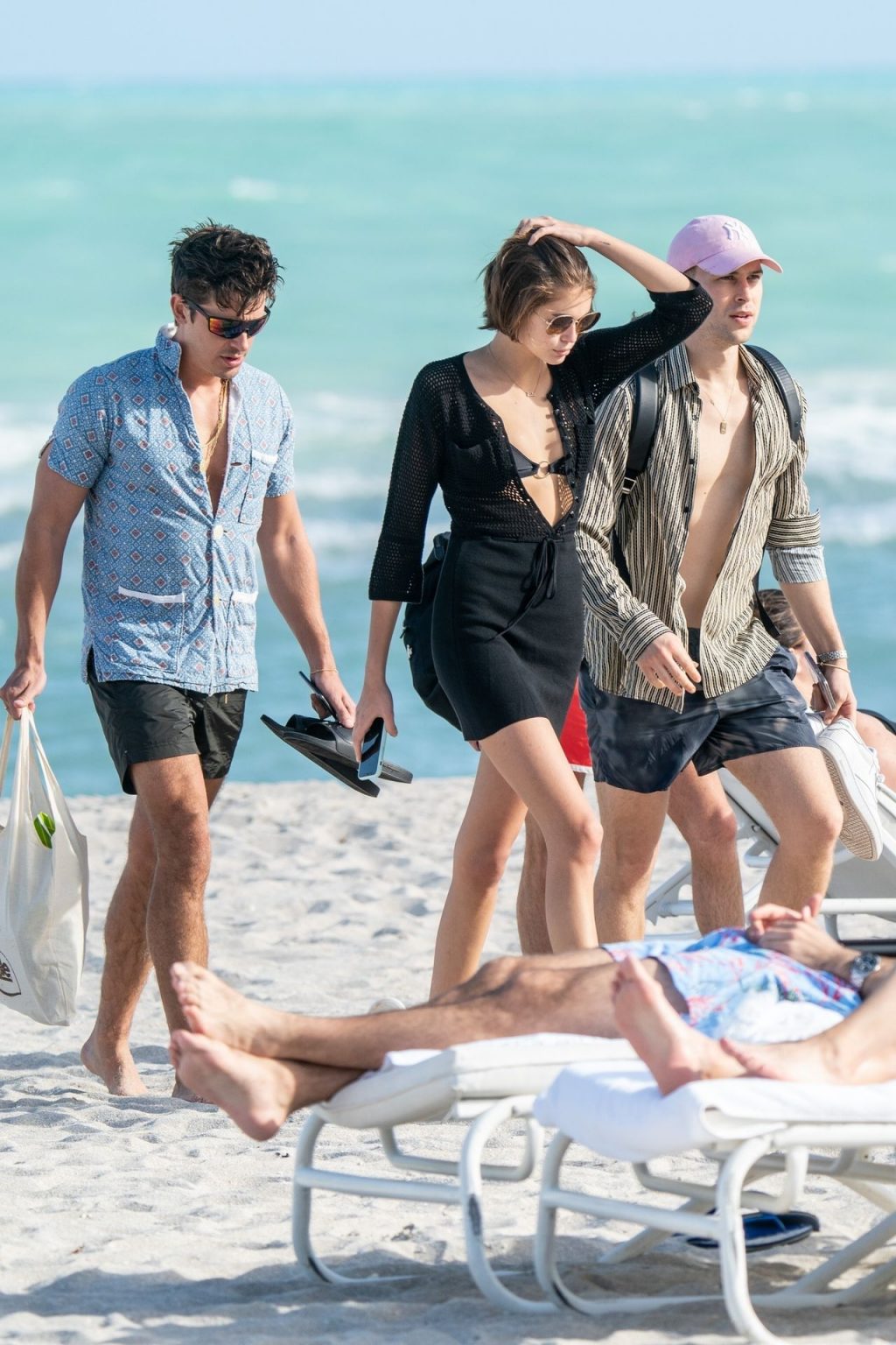 Kaia Gerber mostra i suoi piccoli seni, il dolce sedere e le gambe sexy, mentre si gode una giornata in spiaggia a Miami Beach, 11/01/2020. Kaia appare splendida nell’ensemble nero mentre trascorre la giornata con gli amici. I ragazzi vogliono vedere un threesome nudo.