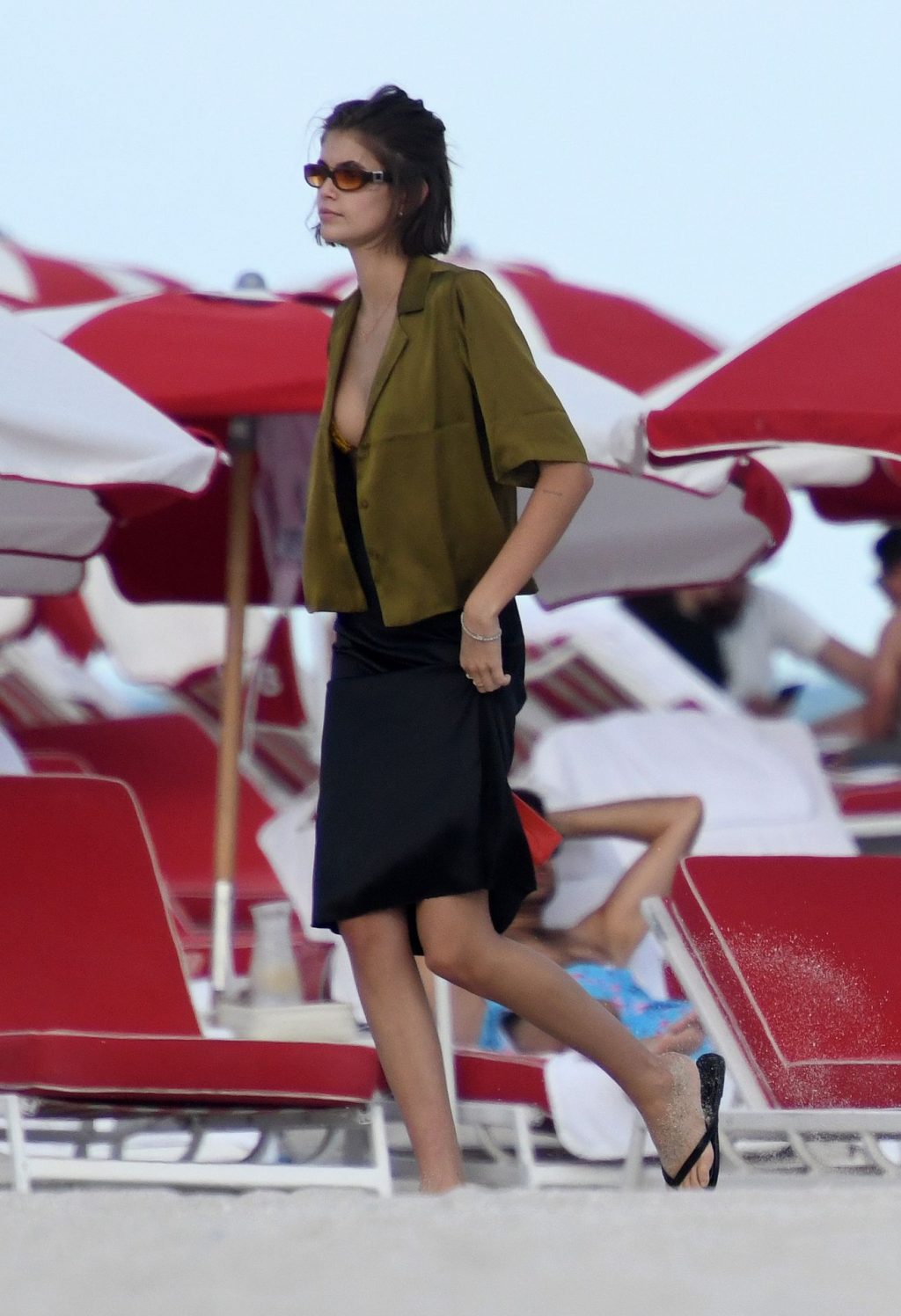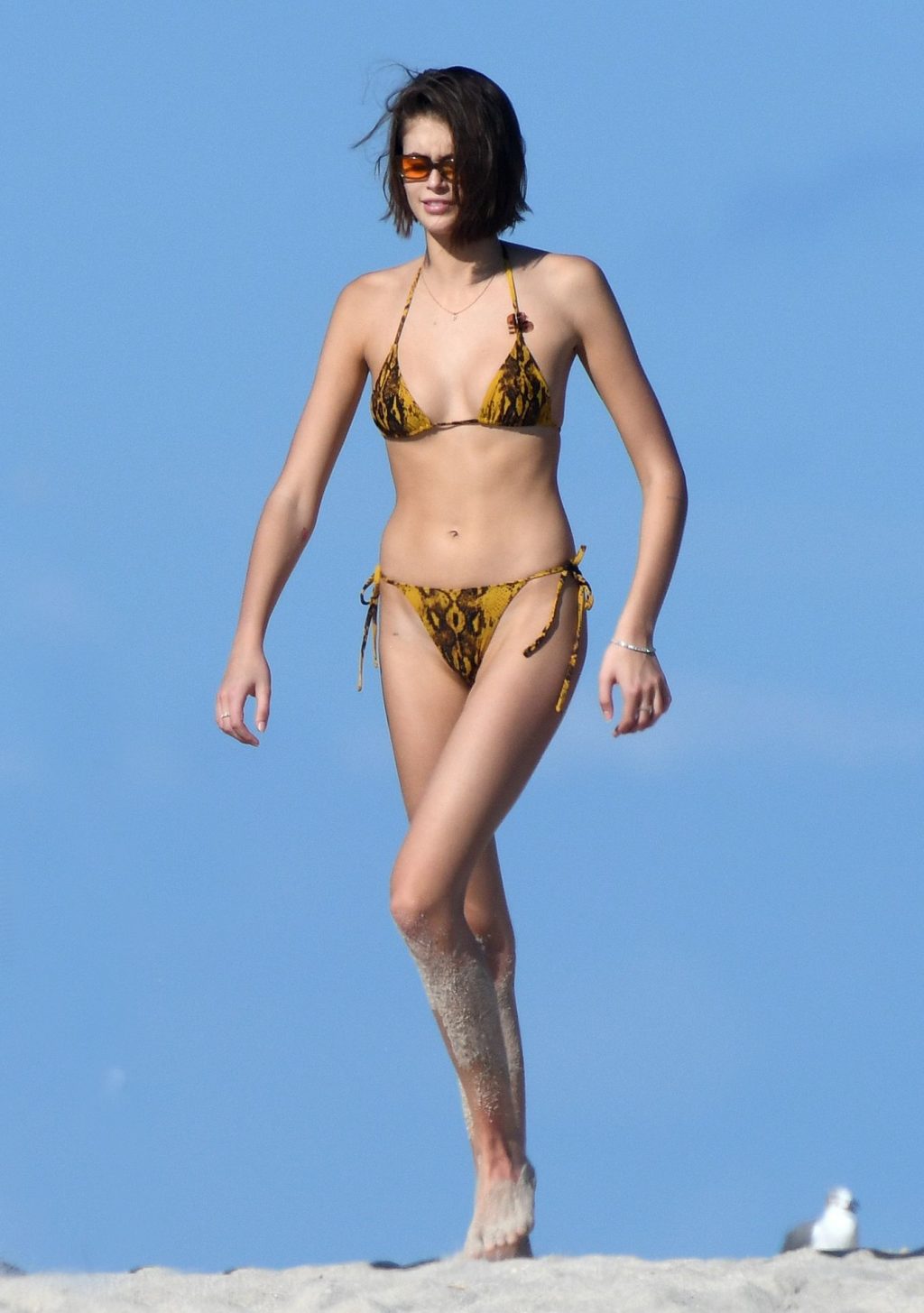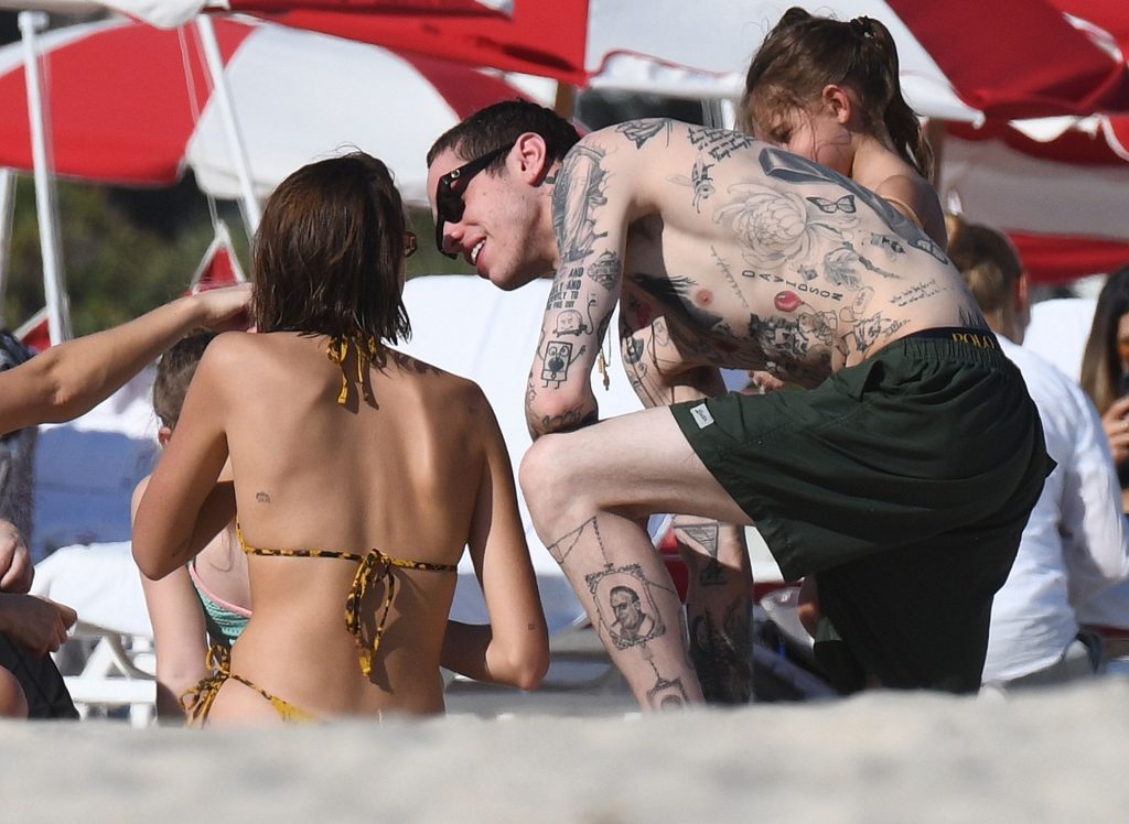Model Kaia Gerber indossa un micro bikini giallo e nero con stampa pitone mentre riceve un bacio dal fidanzato pesantemente tatuato Pete Davidson sulla spiaggia di Miami, 22/11/2019.