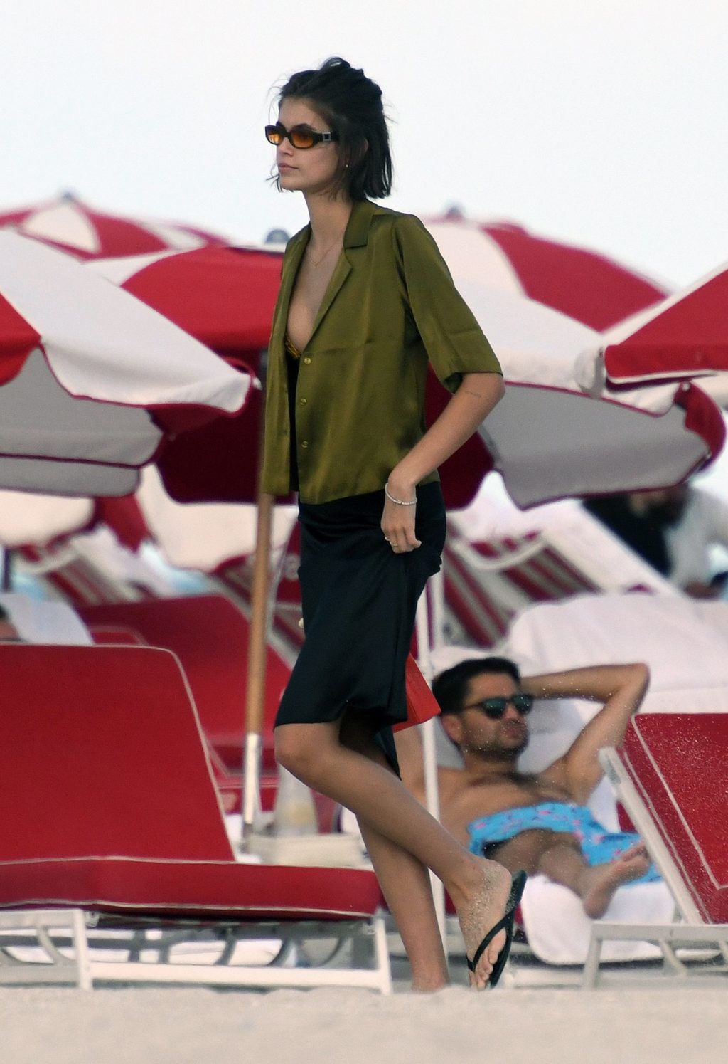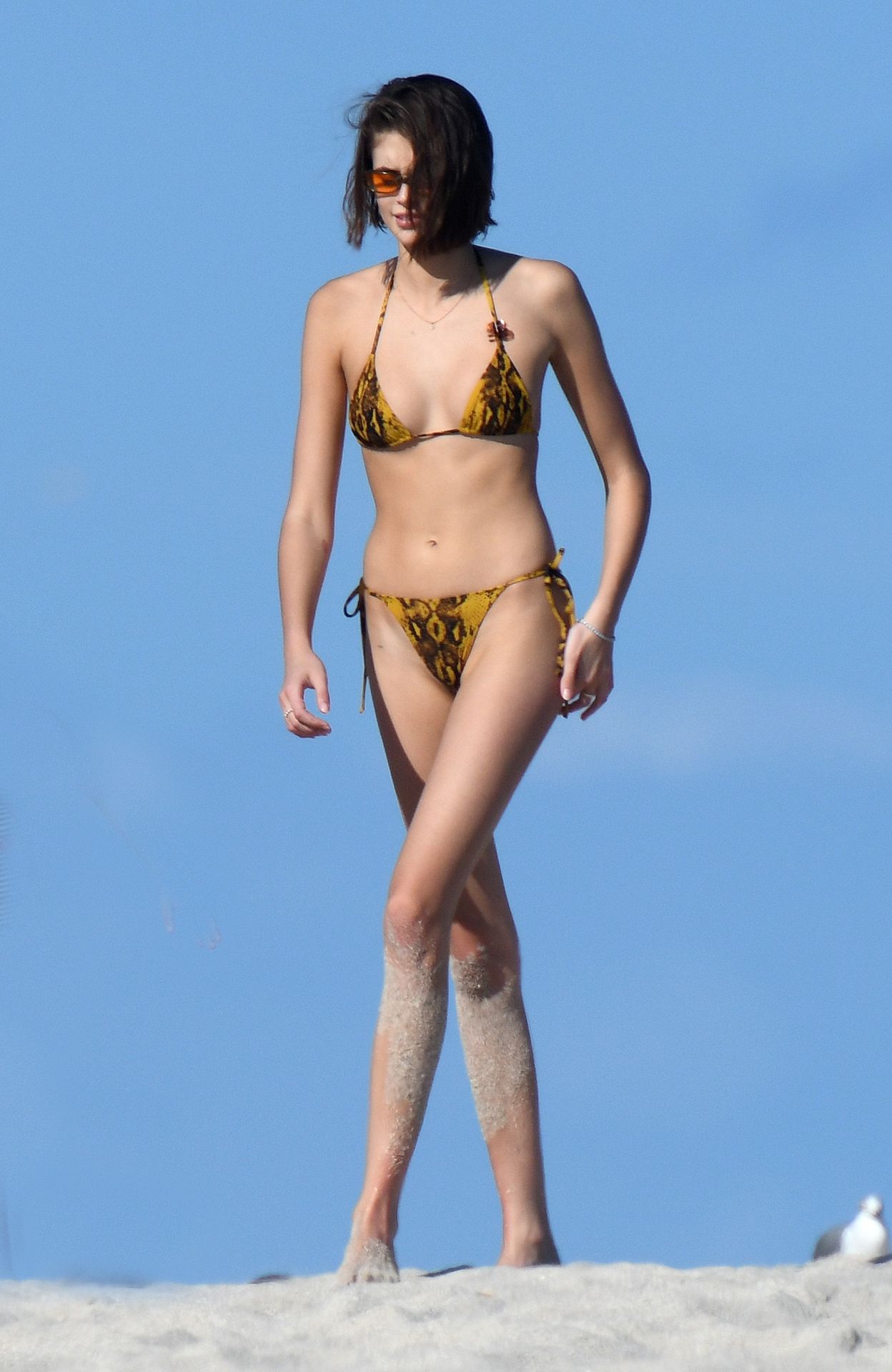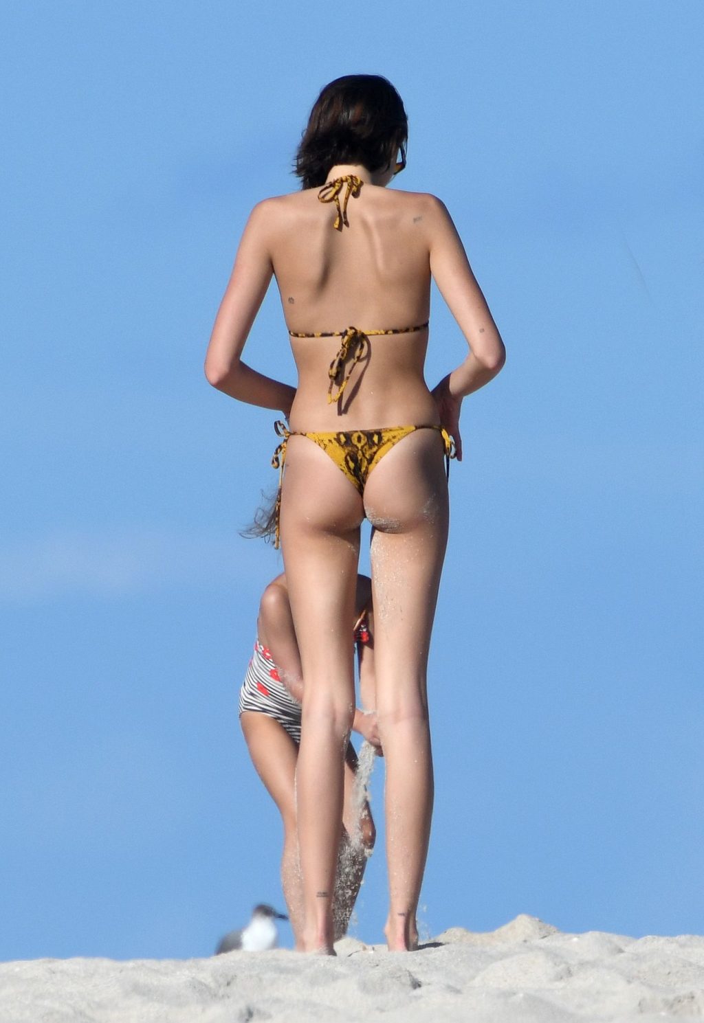 Model Kaia Gerber indossa un micro bikini giallo e nero con stampa pitone mentre riceve un bacio dal fidanzato pesantemente tatuato Pete Davidson sulla spiaggia di Miami, 22/11/2019.