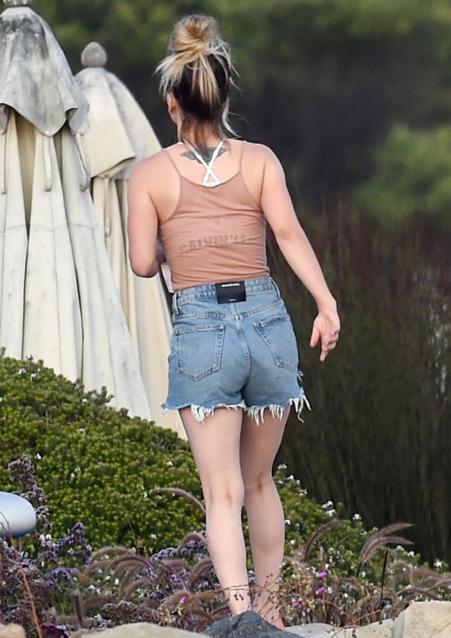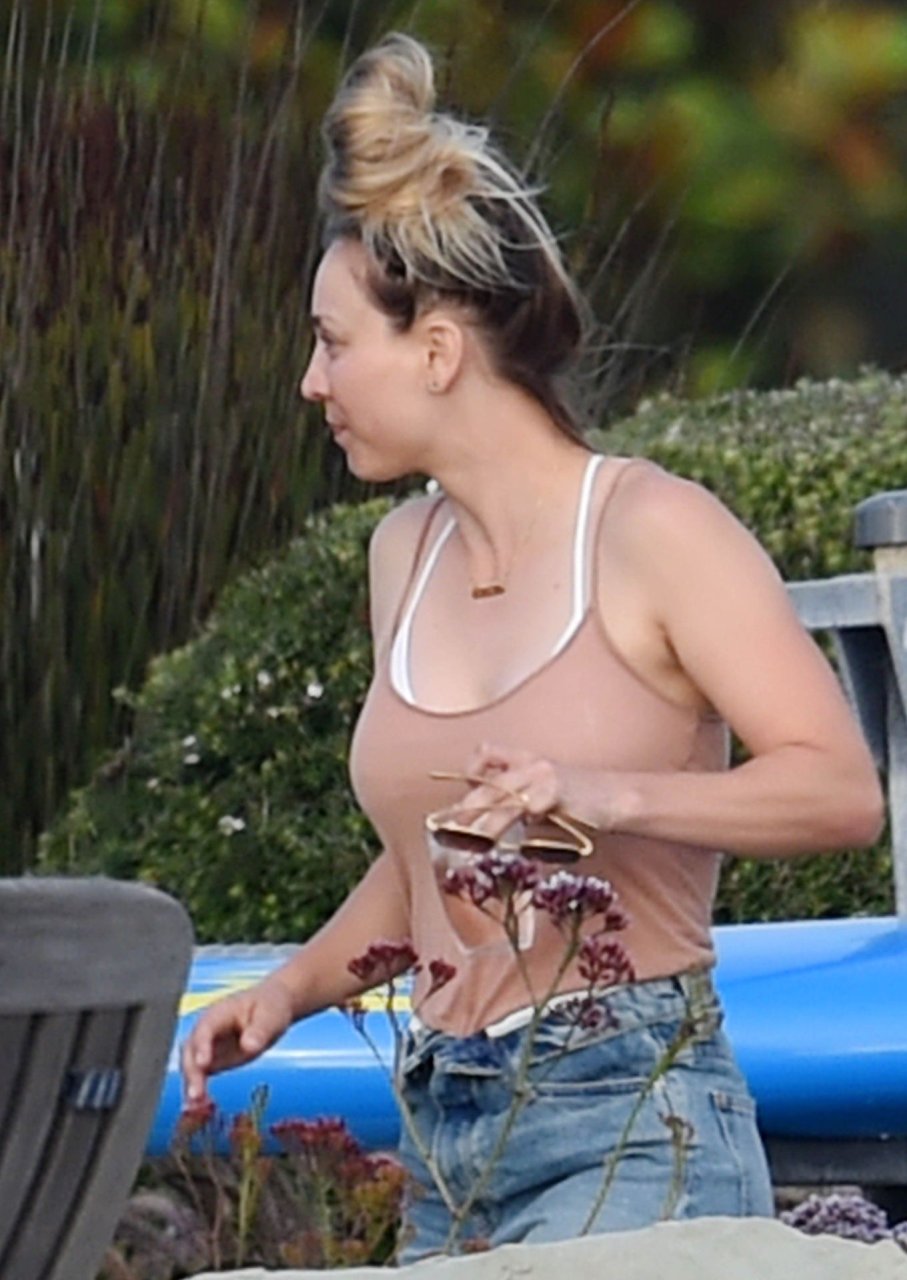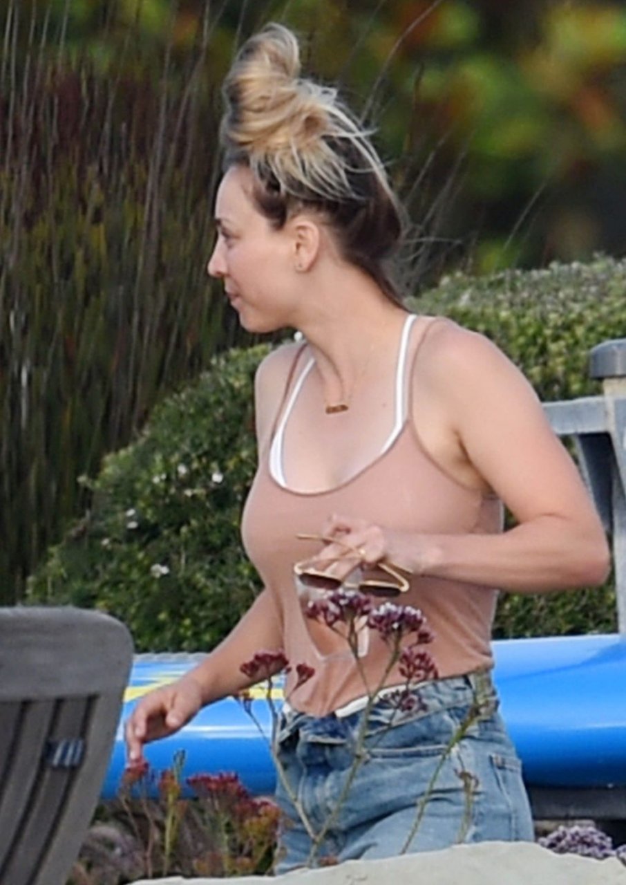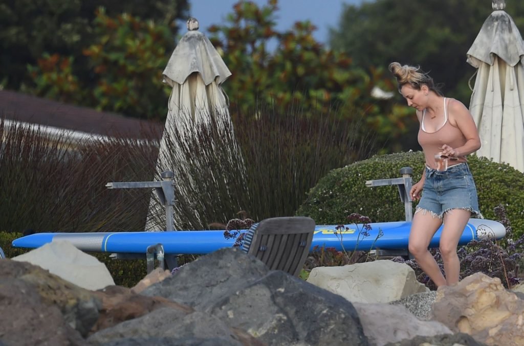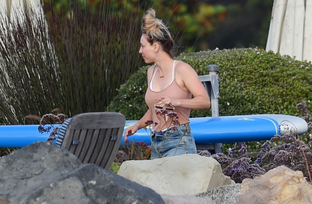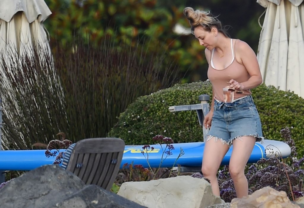 Kaley Cuoco è a piedi nudi con pantaloncini di jeans tagliati mentre gioca con gli amici a una festa in spiaggia a Santa Barbara sabato, 07/09/2019.
