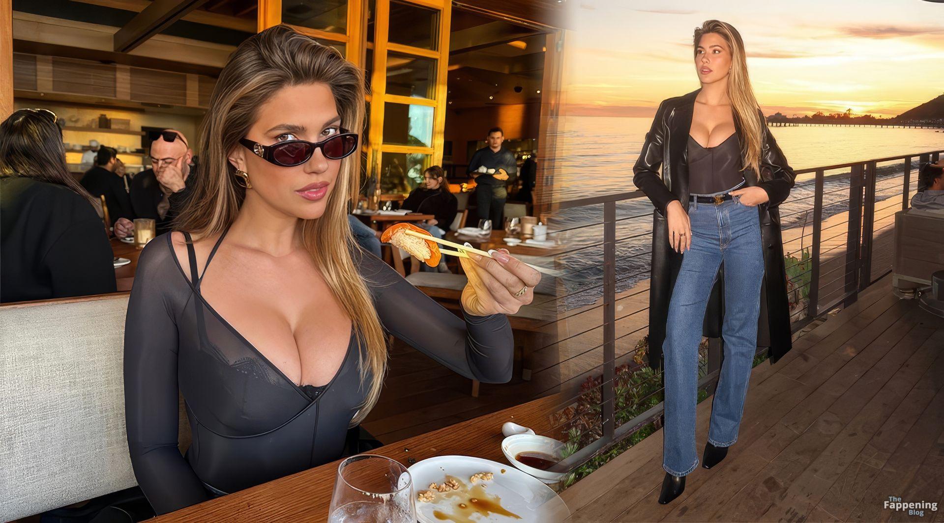 Kara Del Toro è ritratta con una camicetta trasparente che mette in mostra il suo generoso décolleté e il reggiseno di pizzo.