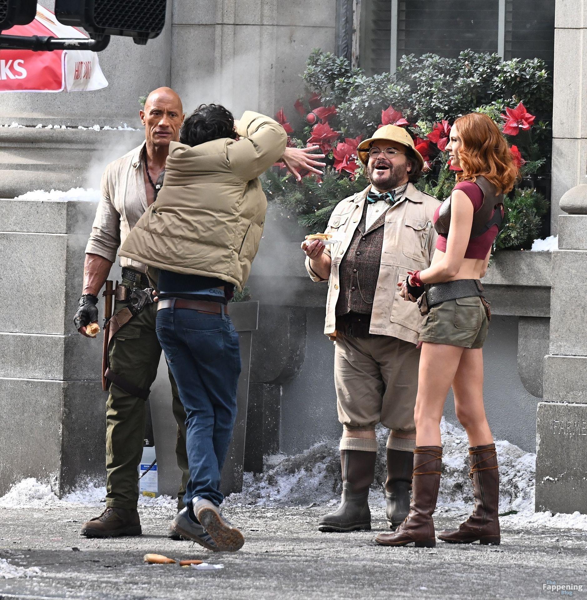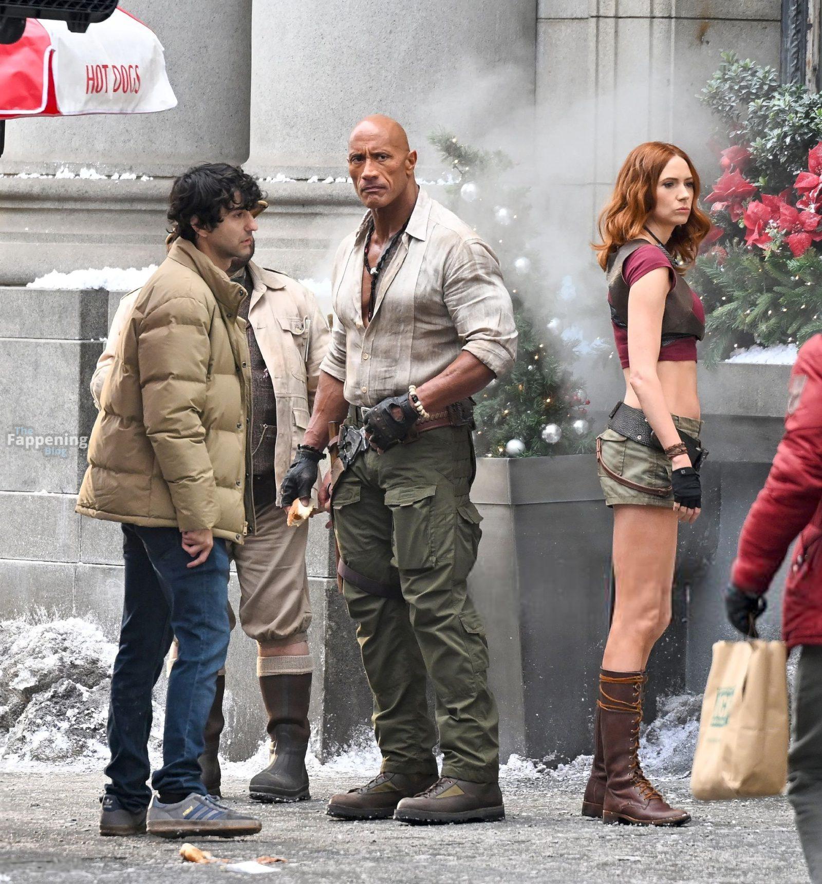 Karen Gillan stupisce sul set di Jumanji 4. Guarda i suoi addominali, gambe e seno in un top corto e pantaloncini.