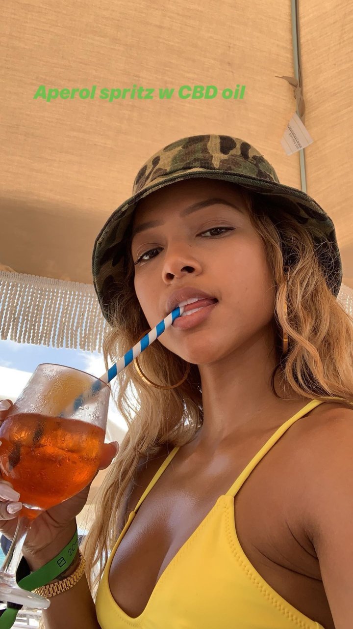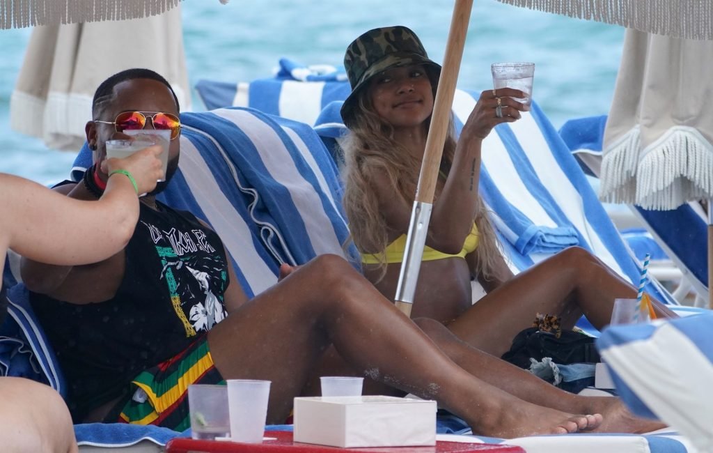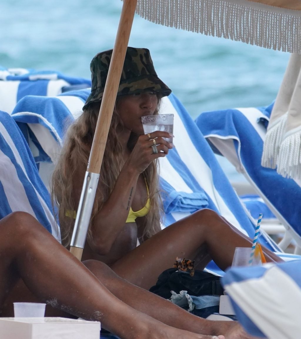 Karrueche Tran prende da bere sulla spiaggia con amici a Miami Beach, 10/05/2019. Karrueche indossava un top bikini giallo con slip abbinati e un cappello a secchiello mimetico.