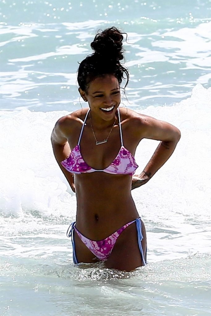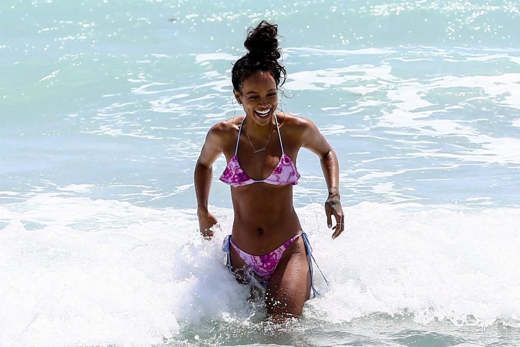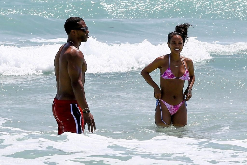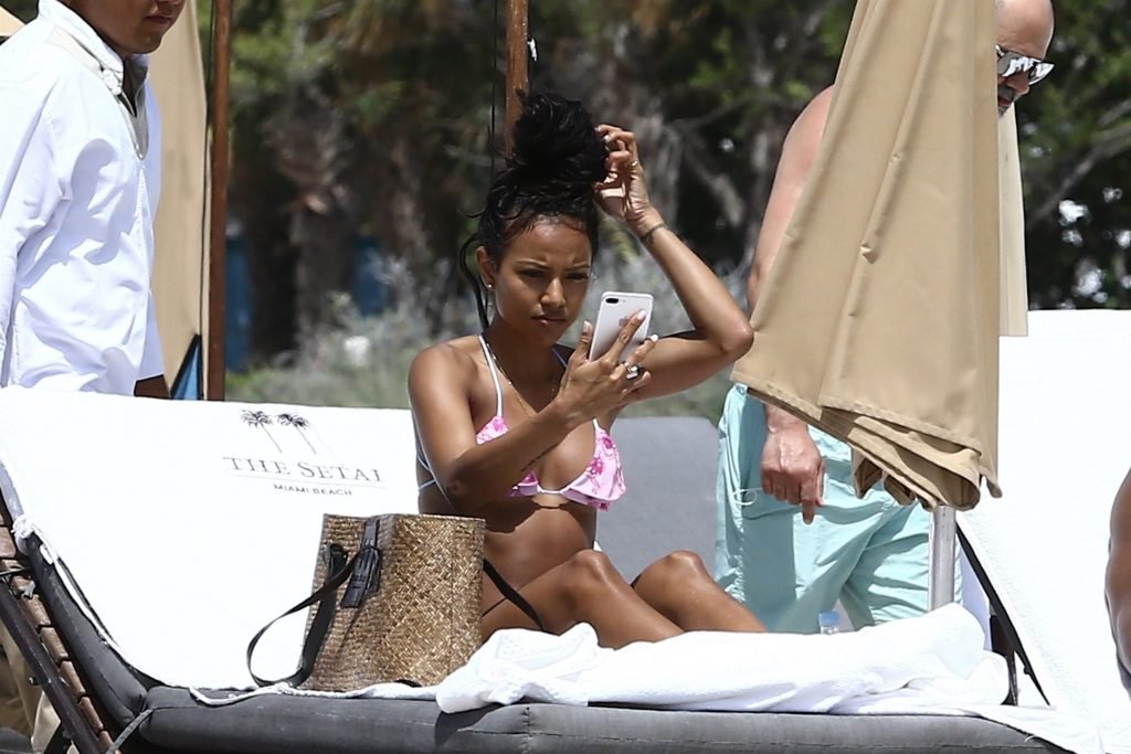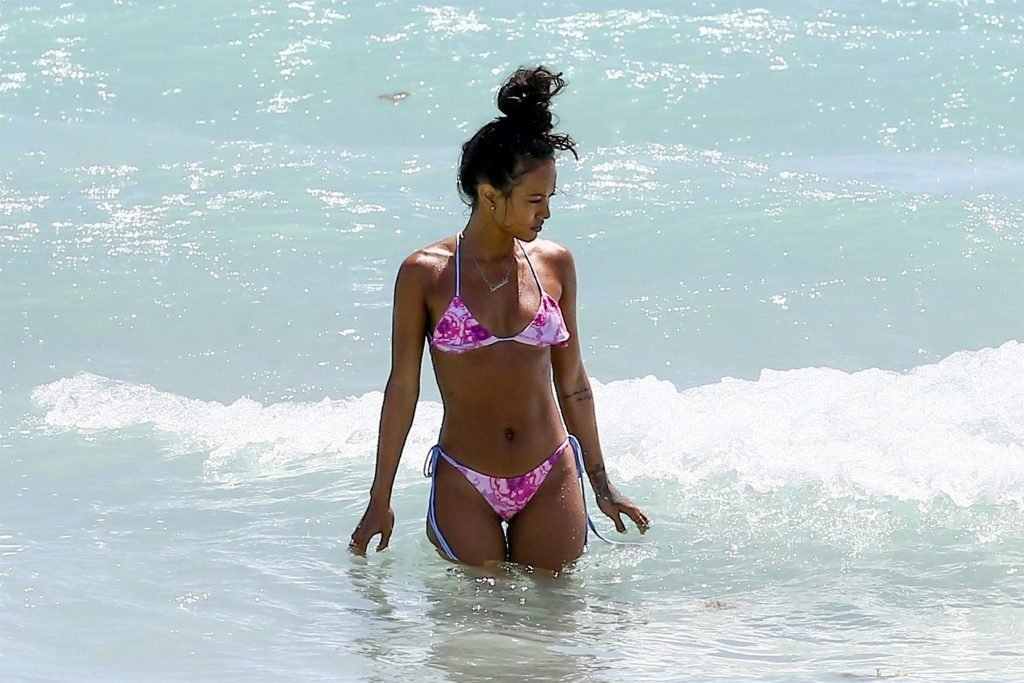 Modella e attrice Karrueche Tran, 29 anni, mostra il suo corpo tonico in un bikini rosa succinto mentre si gode una giornata in spiaggia a Miami con il suo fidanzato star della NFL, Victor Cruz, 12/04/2018.