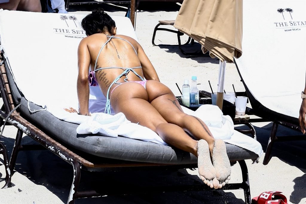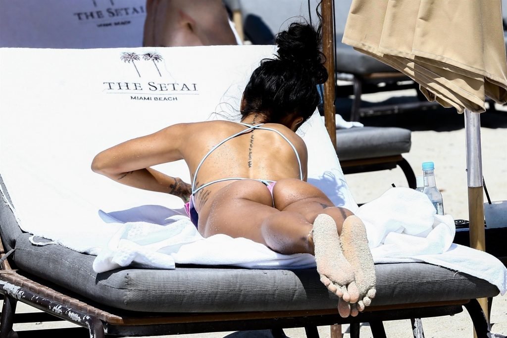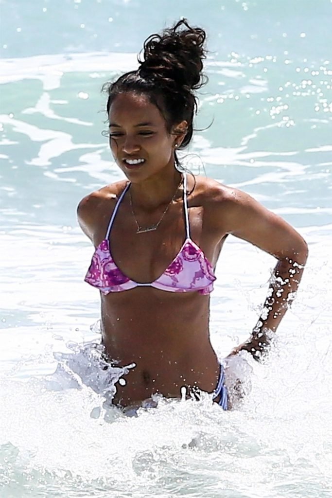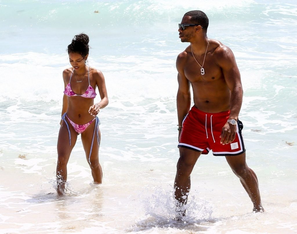 Modella e attrice Karrueche Tran, 29 anni, mostra il suo corpo tonico in un bikini rosa succinto mentre si gode una giornata in spiaggia a Miami con il suo fidanzato star della NFL, Victor Cruz, 12/04/2018.