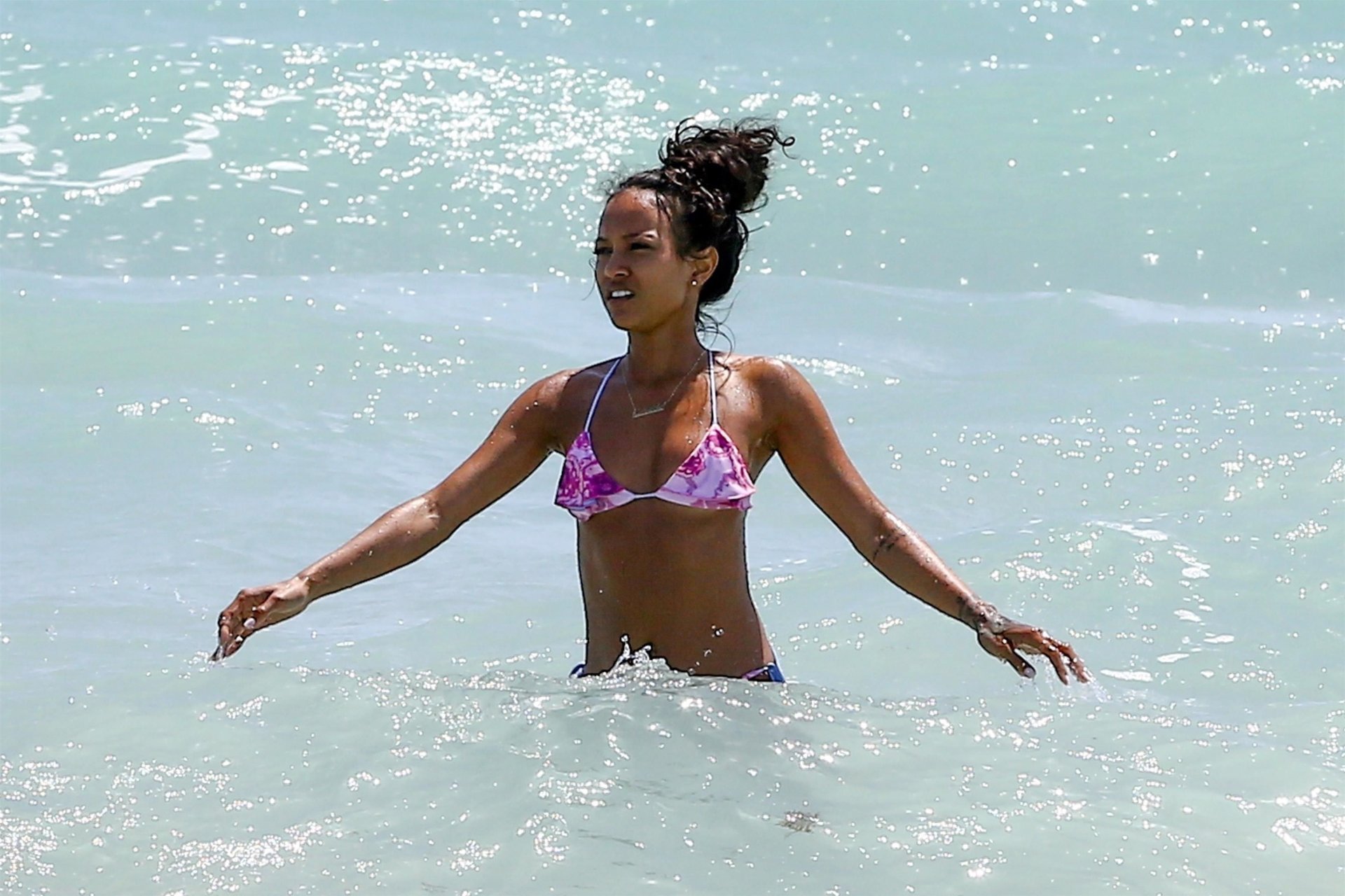 Modella e attrice Karrueche Tran, 29 anni, mostra il suo corpo tonico in un bikini rosa succinto mentre si gode una giornata in spiaggia a Miami con il suo fidanzato star della NFL, Victor Cruz, 12/04/2018.