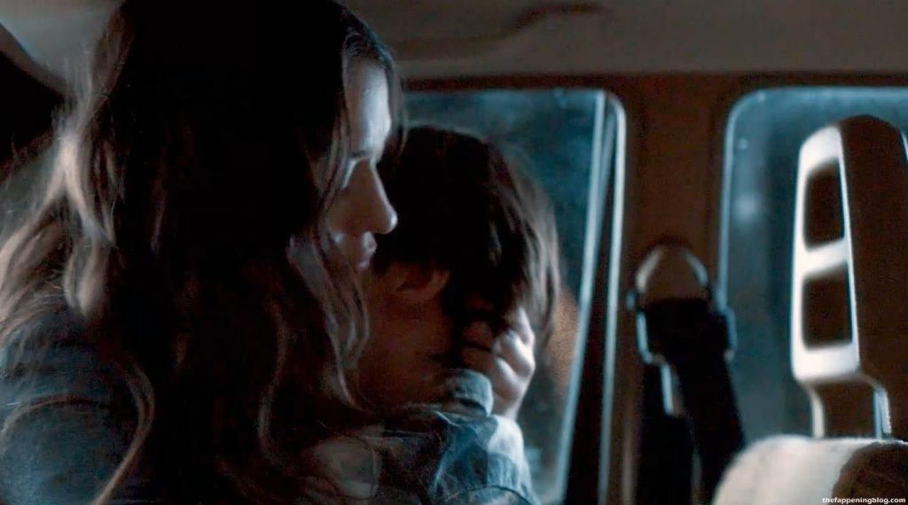 Kat Dennings sits on top of a man in the front seat of a taxi, coaching him before having sex with him and kissing him before he leaves.
