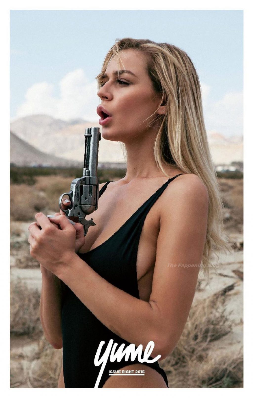 La bionda bellezza Kate Compton posa da cowboy in un servizio fotografico di Adam Mont (2015). Mostra il suo corpo nudo mozzafiato, godendosi una giornata da sola a Palm Springs con solo un costume intero e una pistola replica.