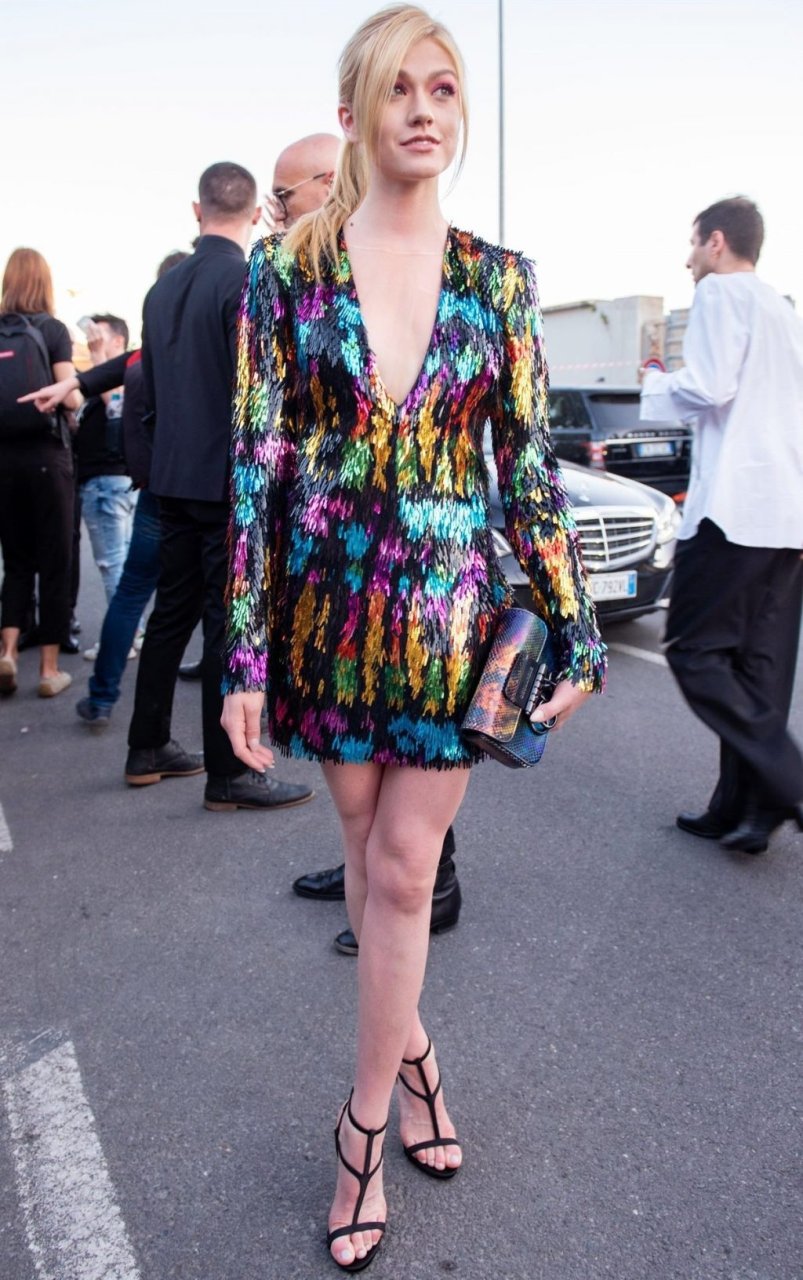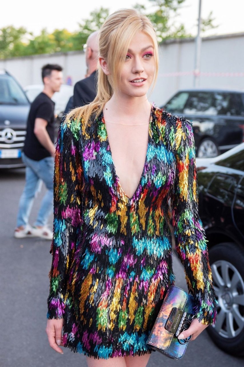 Katherine McNamara, dalle gambe lunghe, è stata vista arrivare alla sfilata DSquared2 Primavera/Estate 2020 Uomo durante la Milano Fashion Week indossando un look Dsquared dalla testa ai piedi – Milano, Italia, 16/06/2019.