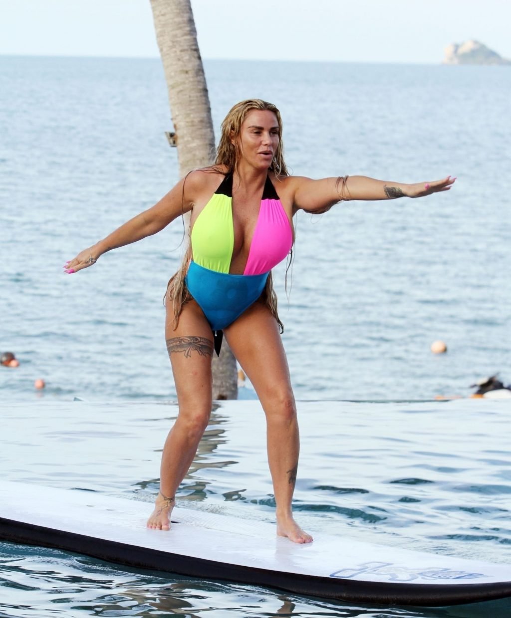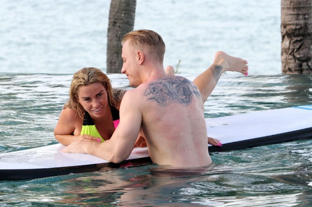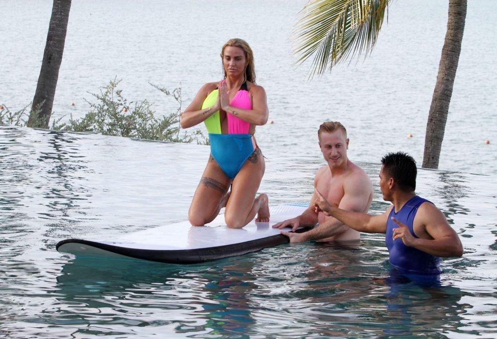 Katie sembrava rilassata mentre si dedicava al paddle board e mostrava le sue abilità di equilibrio facendo un po’ di yoga con il fidanzato Kris Boyson prima di divertirsi insieme in piscina ricreando la famosa scena di “Dirty Dancing”!