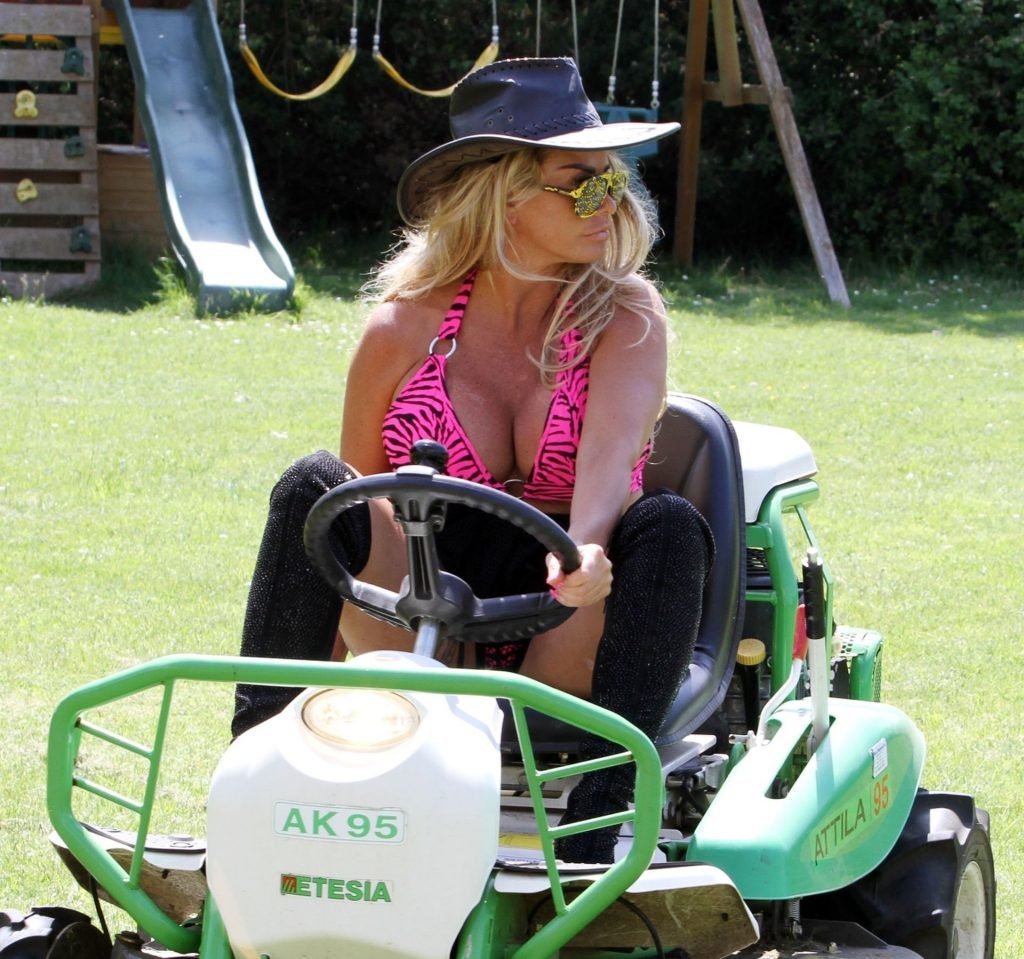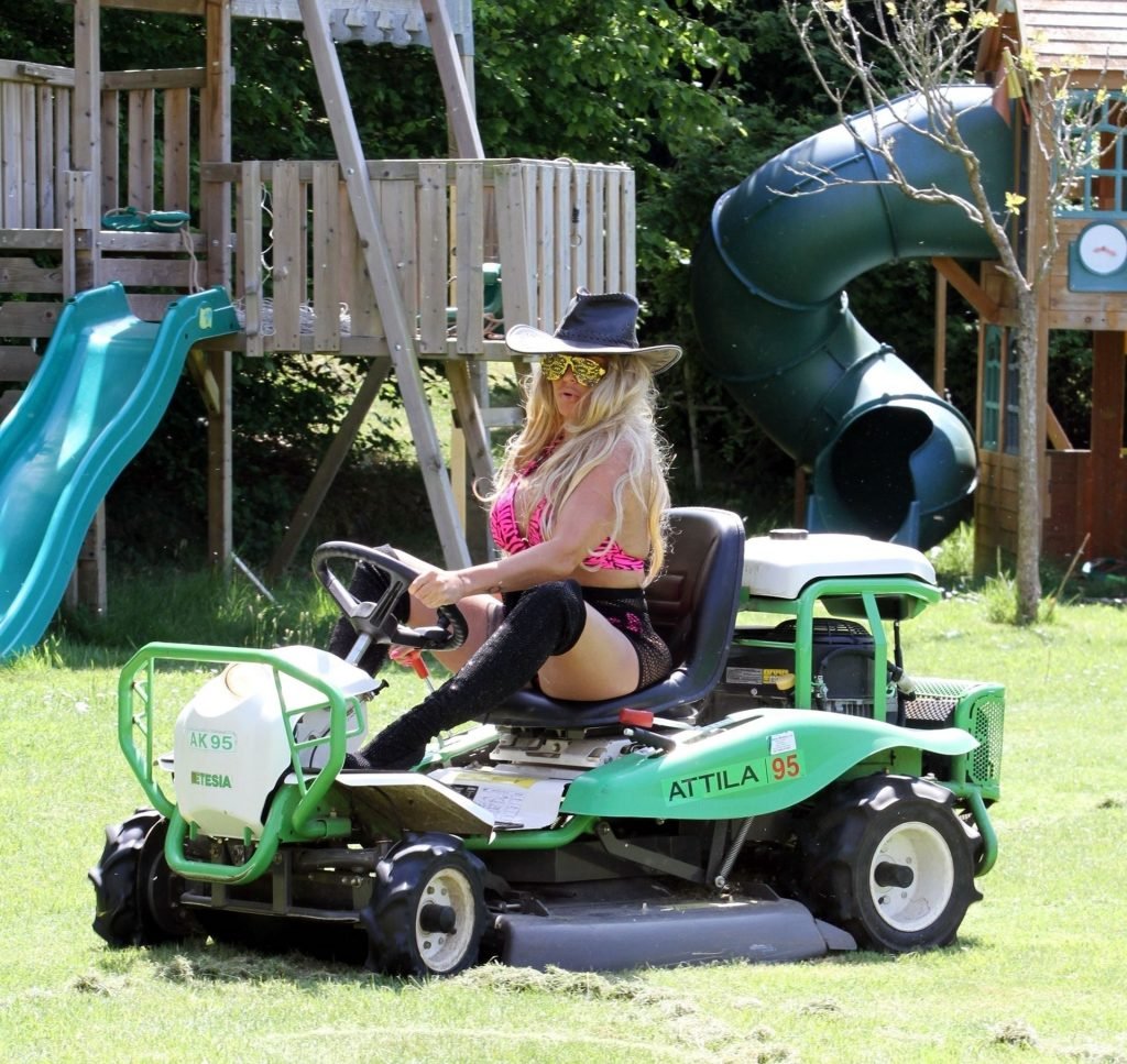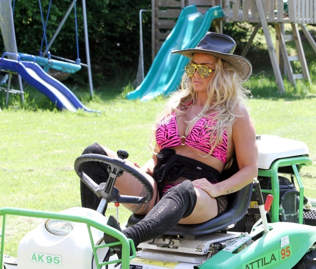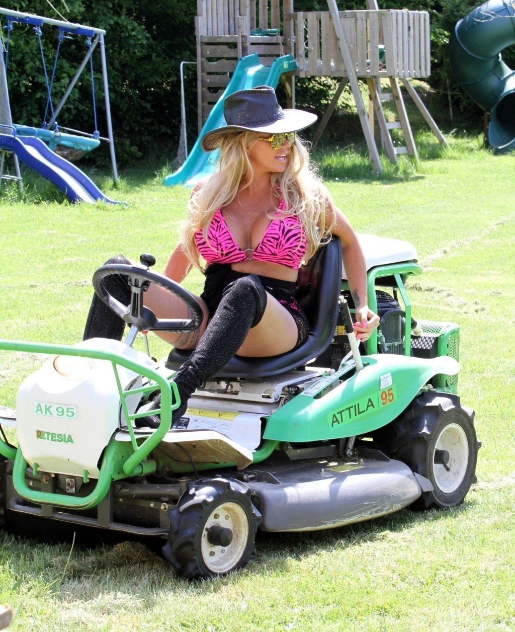 Katie Price (Jordan) è stata fotografata mentre tagliava il prato indossando un bikini con stampa animalier, stivali sopra il ginocchio e cappello da cowboy a Londra, 24/05/2019.