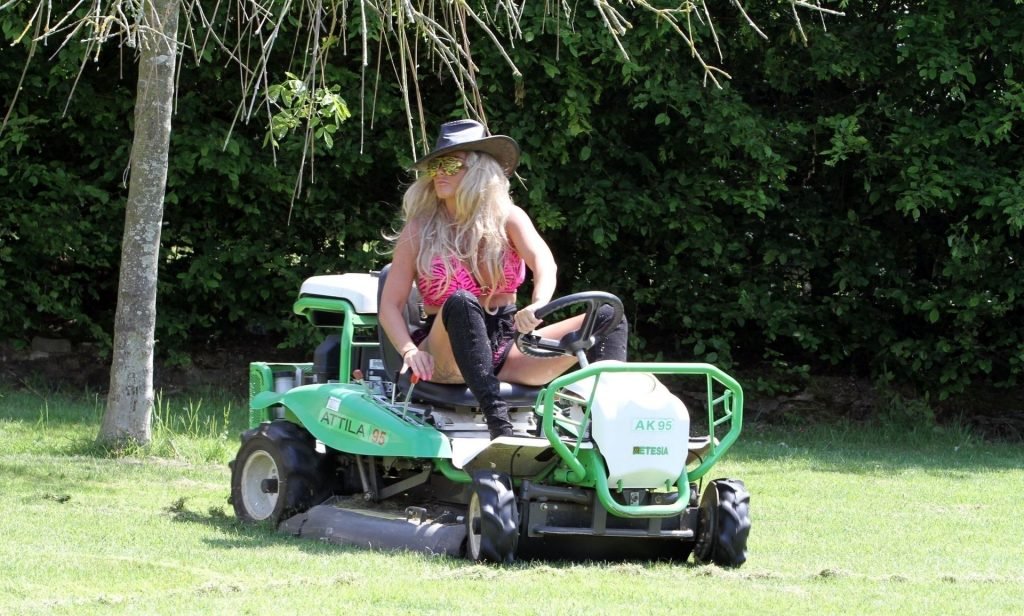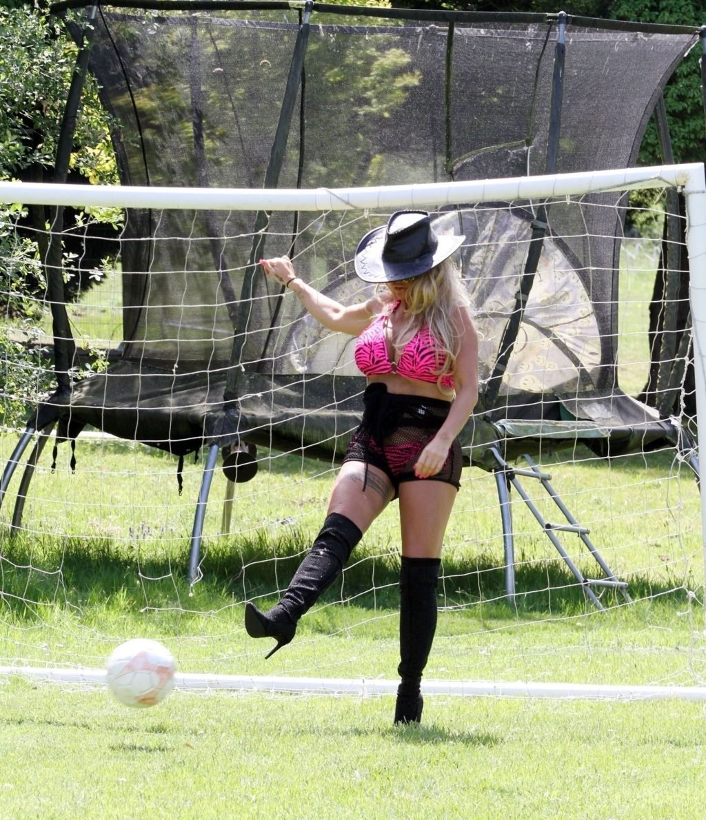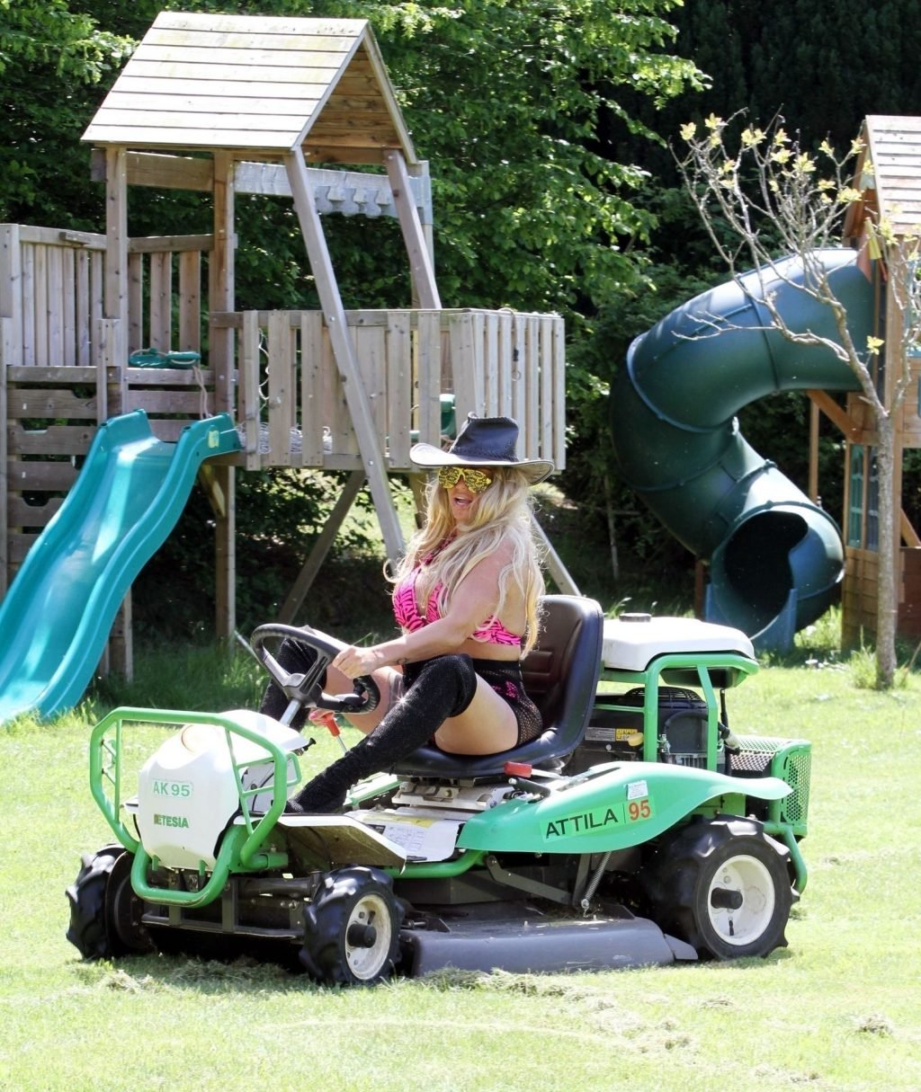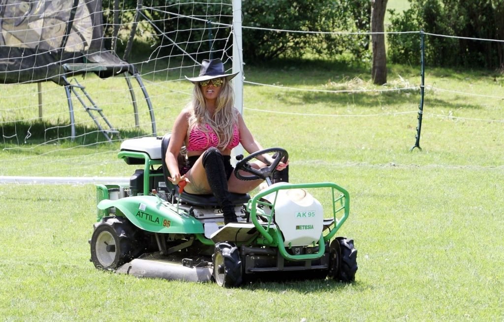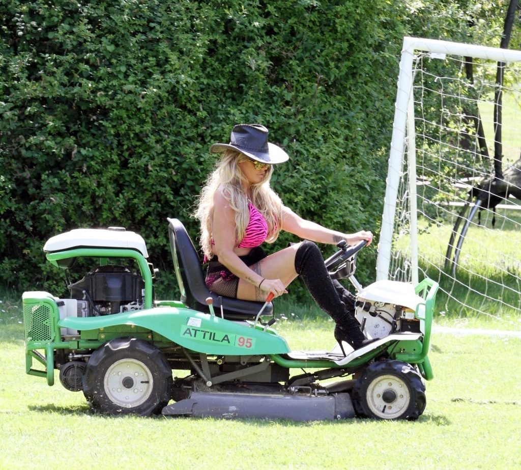 Katie Price (Jordan) è stata fotografata mentre tagliava il prato indossando un bikini con stampa animalier, stivali sopra il ginocchio e cappello da cowboy a Londra, 24/05/2019.